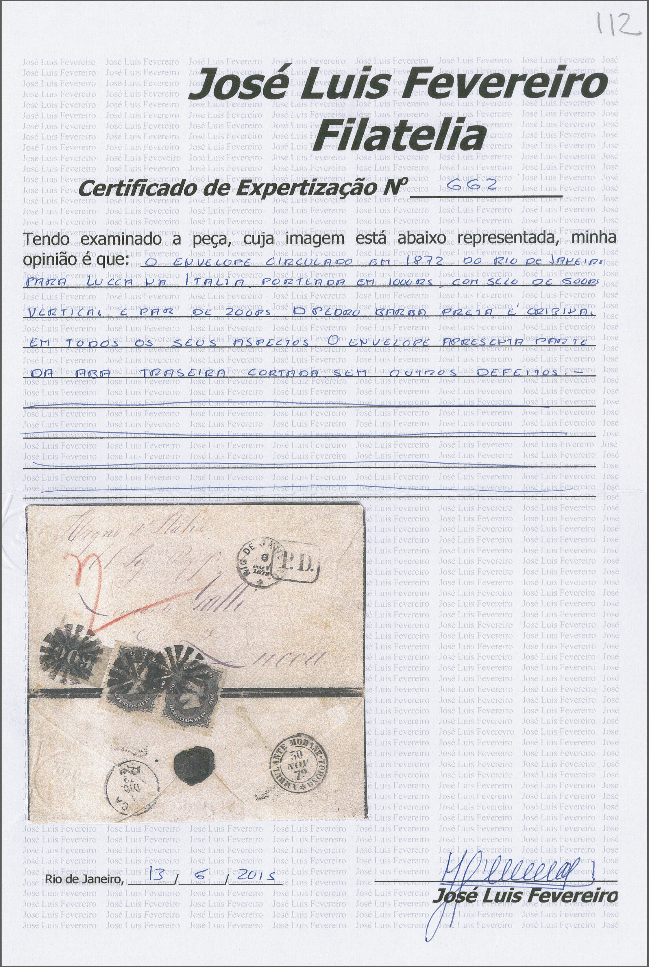 10094 cover imageVerticais 1850: 600 r. black on thin greyish paper, a superb used example with huge margins all round, on 1872 mourning envelope to Lucca, Italy in combination with Dom Pedro 1866 200 r. black in a horizontal pair applied over edge of cover, paying the double rate; all tied by segmented cork handstamps with "Rio-De-Janeiro" despatch cds (Nov 6). "Ambulante Modane-Torino" cds (Nov 30) and arrival cds on reverse. Closed tear in face panel well away from the adhesives and part of reverse missing but a very rare franking. Cert. J.L. Fevereiro (2015). (Image 1) (Image 2) (Image 3)
