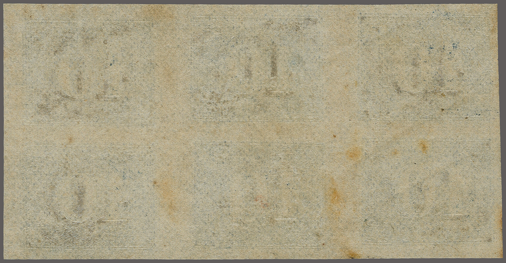 10095 */bof imageColoridos 1854: 10 r. blue on greyish thin paper, an unused block of six (3 x 2), of fine colour with large margins all round, slight ageing, unusually with superb large part og. Scarce. (Image 1) (Image 2)