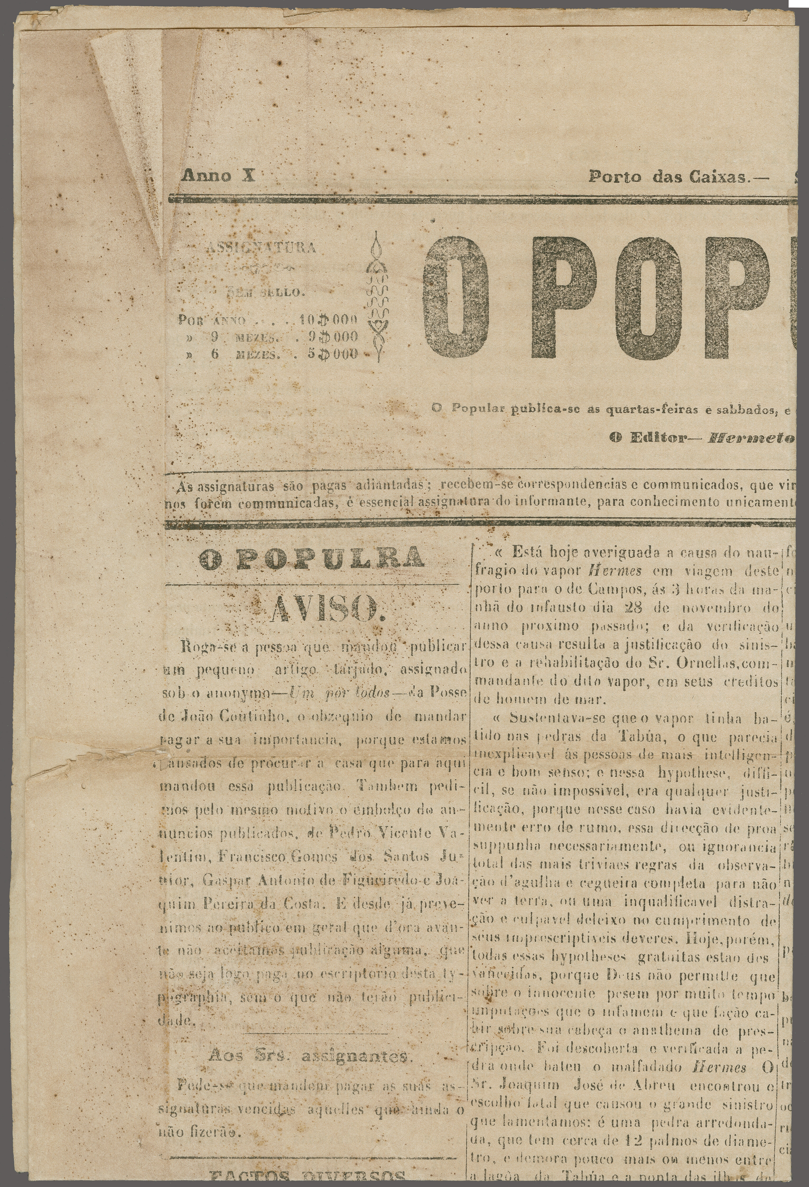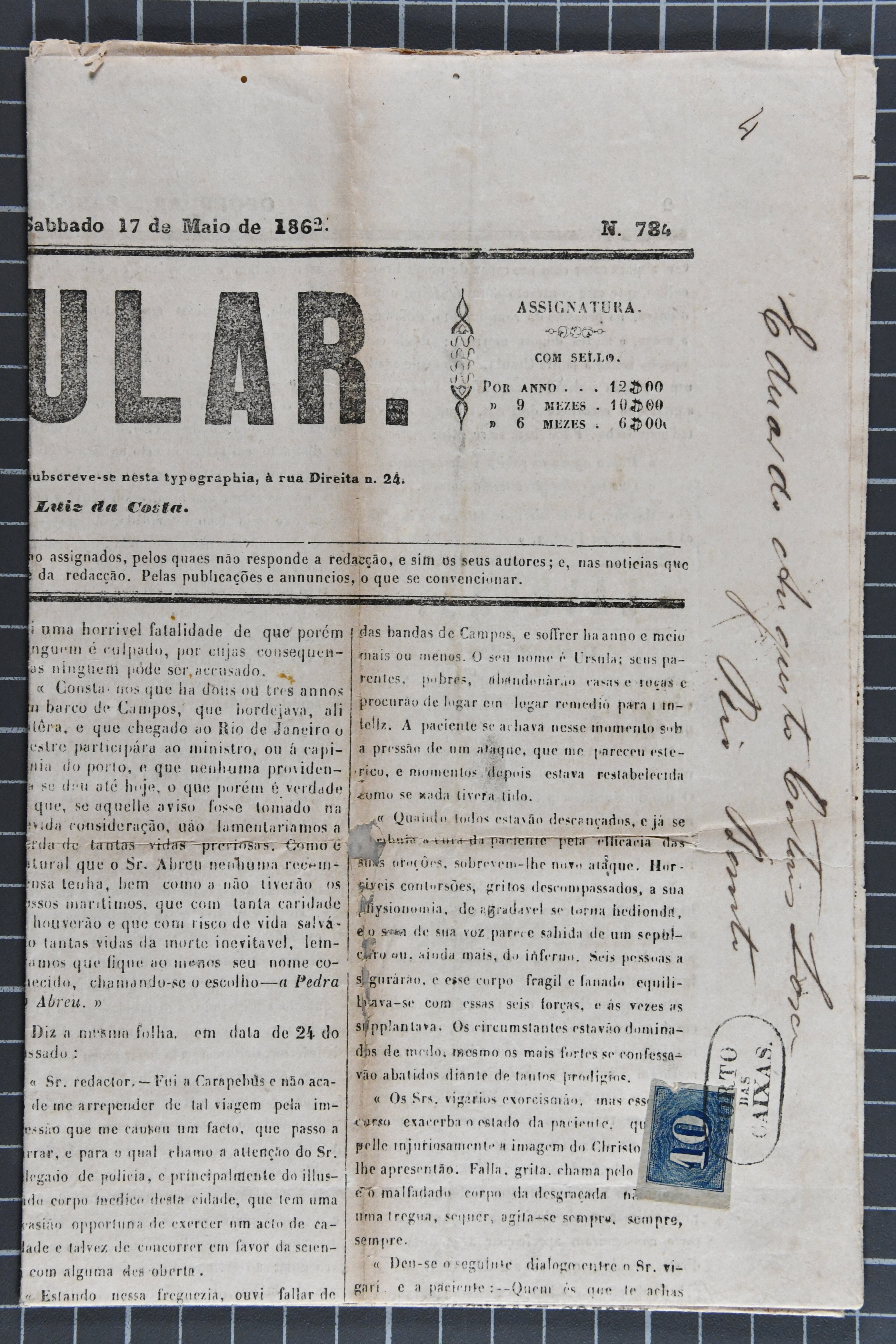 10097 cover imageColoridos 1854: 10 r. blue on greyish thin paper, a used example with three large margins and small indentation at right, used on "O Popular" Newspaper printed in Caxias on 17 May 1862 and mailed to Rio Bonito, neatly tied by oval framed "PORTO / DAS / CAXIAS" handstamp in black (Ayres fig. 1412). Rare. (Image 1) (Image 2)
