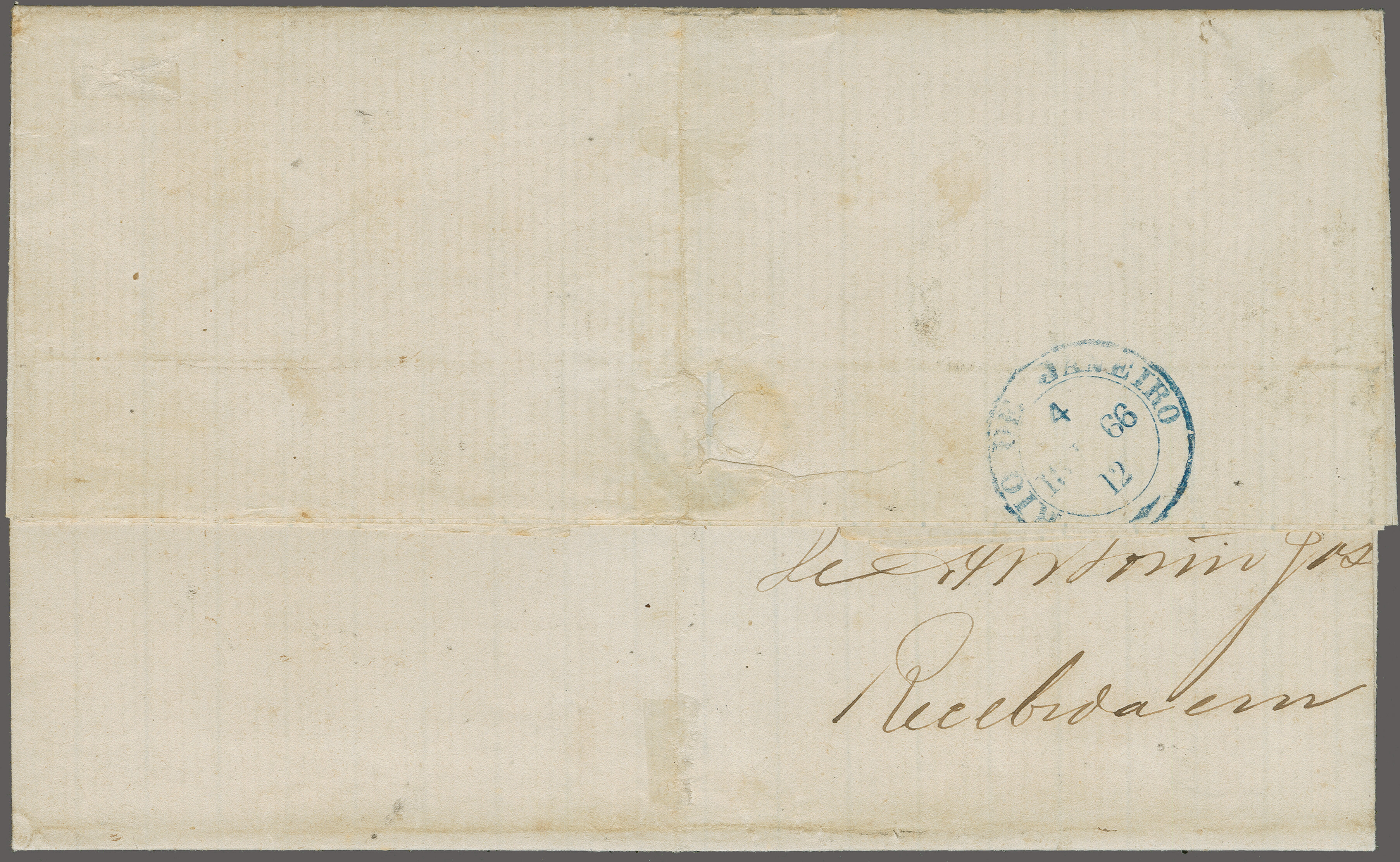 10098 cover imageColoridos 1854: 10 r. blue on greyish thin paper, a used example in combination with 1850 30 r. black and 60 r. grey-black, all with close to good margins; used on 10 December 1866 entire letter from Vassouras to Rio de Janeiro at single rate, tied by segmented cork cancels in black and by two unclear framed handstamps. Oval framed "A DO C / DA / VASSOURAS" handstamp below (Ayres fig. 1533) in black. The 10 reis crossed by file fold. Rio de Janeiro arrival cds (Dec 4) in blue on reverse of a scarce entire. (Image 1)