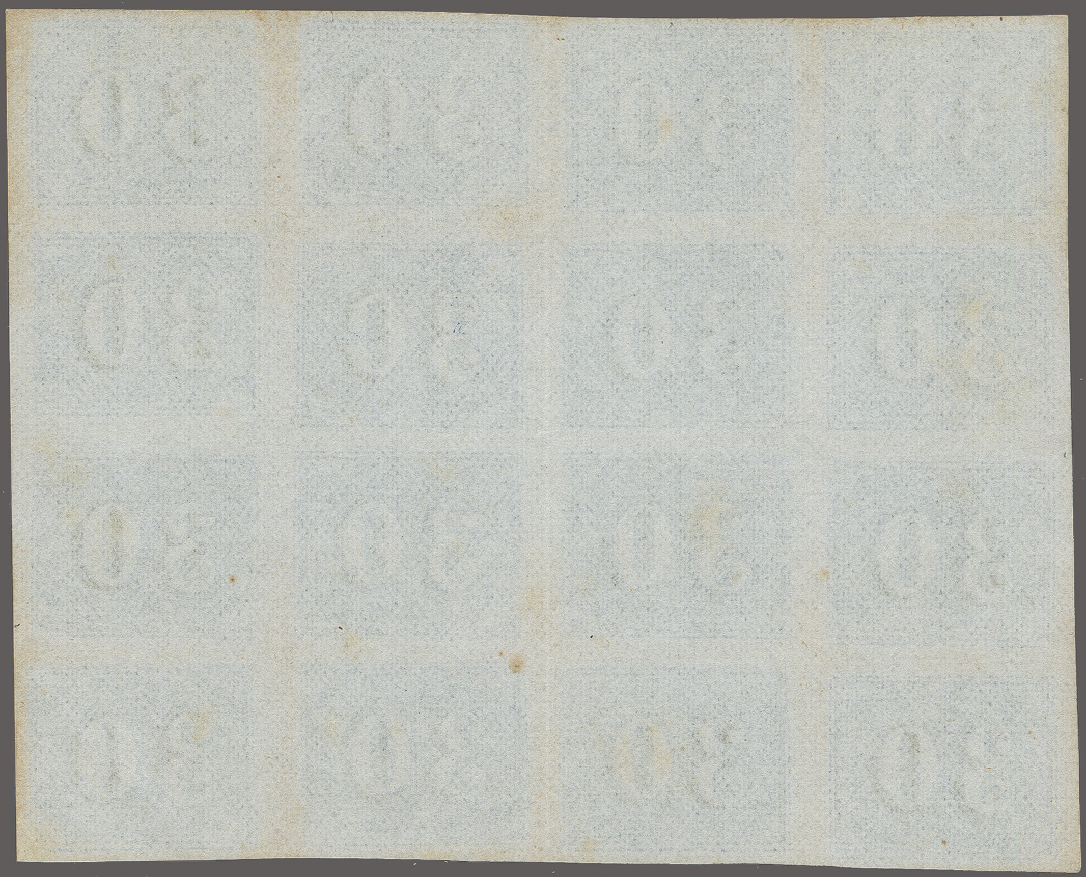 10100 bof/(*) imageColoridos 1854: 30 r. light blue on greyish, an unused block of sixteen (4 x 4), good even margins all round, of fine delicate colour, a superb and scarce large multiple Scott = $ 640+. (Image 1)