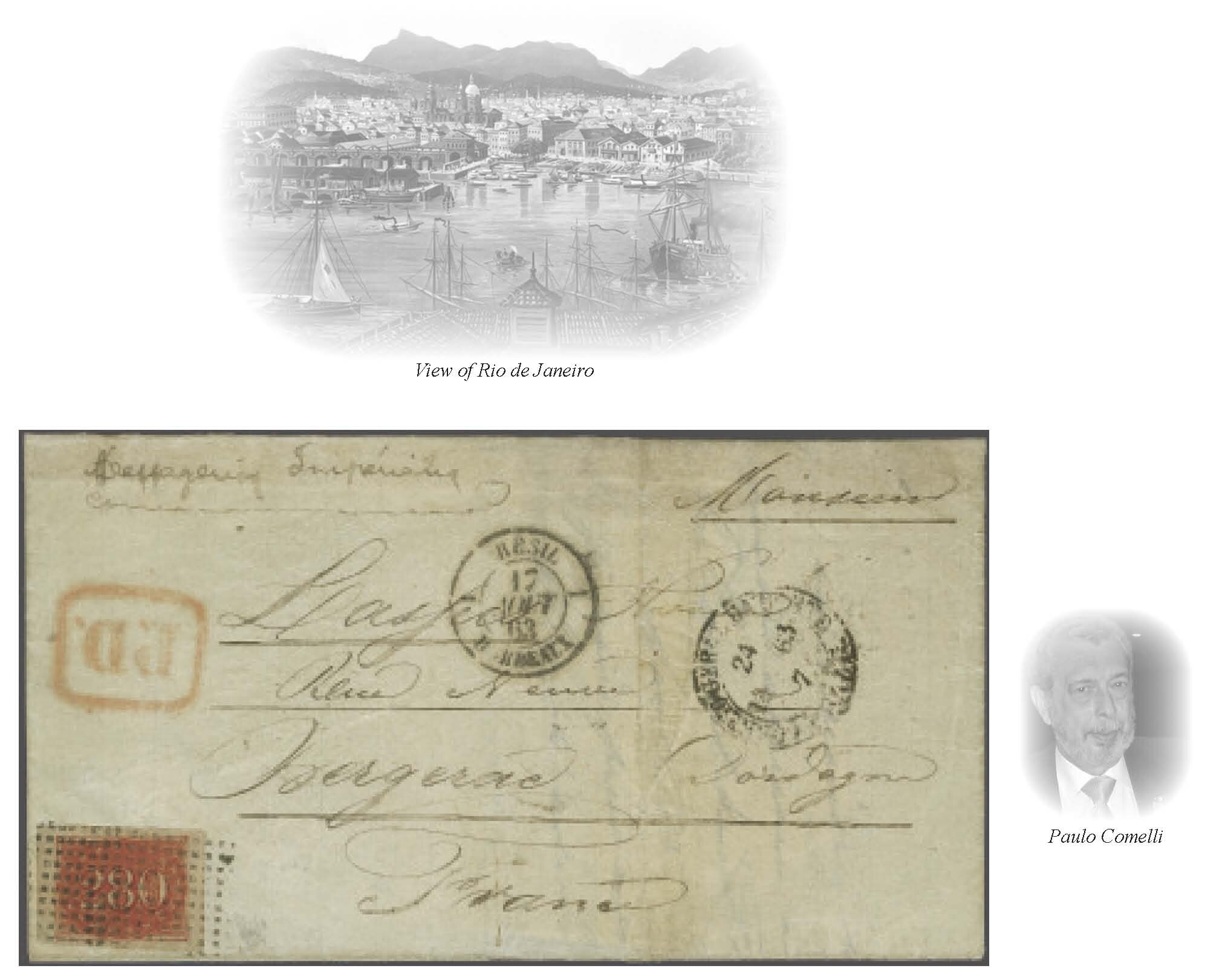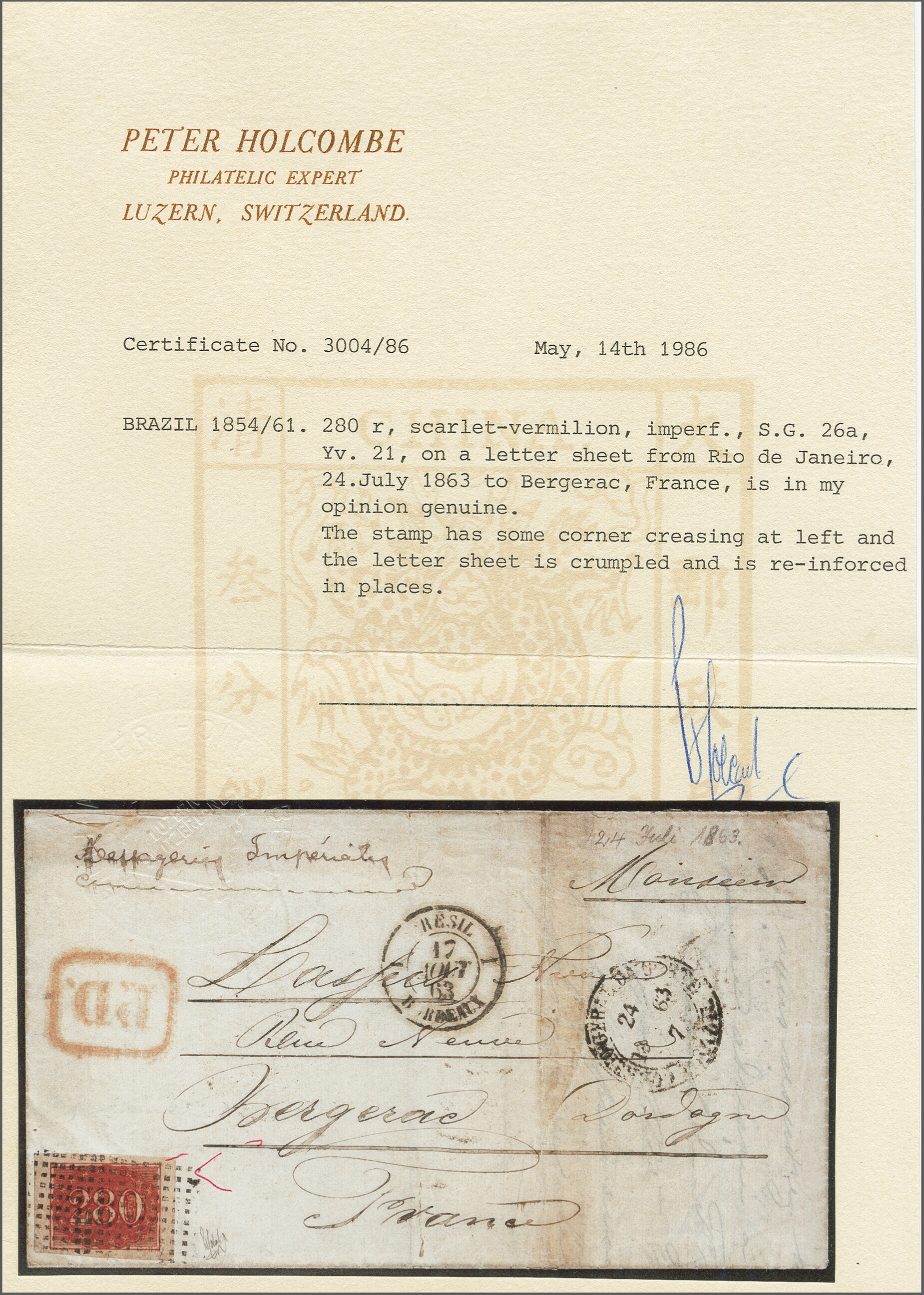 10101 cover imageColoridos 1861: 280 reis red, a used example with good to large margins all round, slight corner crease at lower left, on 1863 single rate cover from Rio de Janeiro to Bergerac, France endorsed "Messageries Maritimes", tied by roller of dots obliterator with "Correio Geral da Corte / Brazil" cds (July 24) in black adjacent and framed "P.D." in red; with "Bresil / Bordeaux" entry marking in black (Aug 17). A fresh and fine cover. Cert. Holcombe (1986) Scott = $ 750. Provenance: Collection Paolo Comelli, Investphila, Lugano, 16 March 2012, lot 1196. (Image 1) (Image 2) (Image 3)