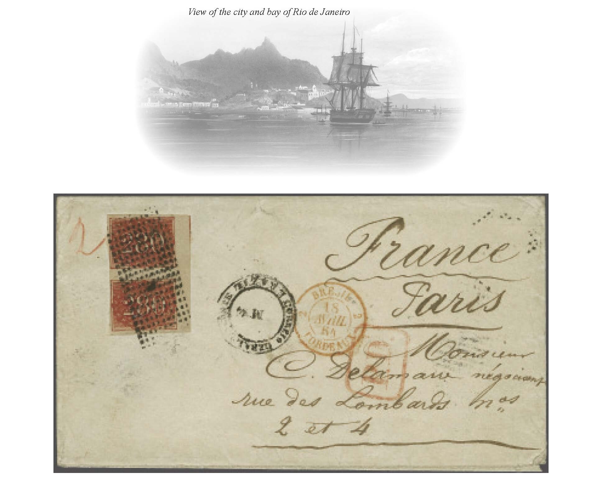 10102 cover imageColoridos 1861: 280 reis red, a used vertical pair in a deep shade with close to large margins, huge at right and showing portion of adjoining stamp, used on 23 March 1864 double rate cover from Rio de Janeiro to Paris carried on steamer "Navarre", tied by roller of dots obliterator with "Correio Geral da Corte / Brazil" cds adjacent and framed "P.D." in red at right. "Bresil / Bordeaux" entry marking in red (April 18). Fresh and most appealing cover, rare. (Image 1) (Image 2)