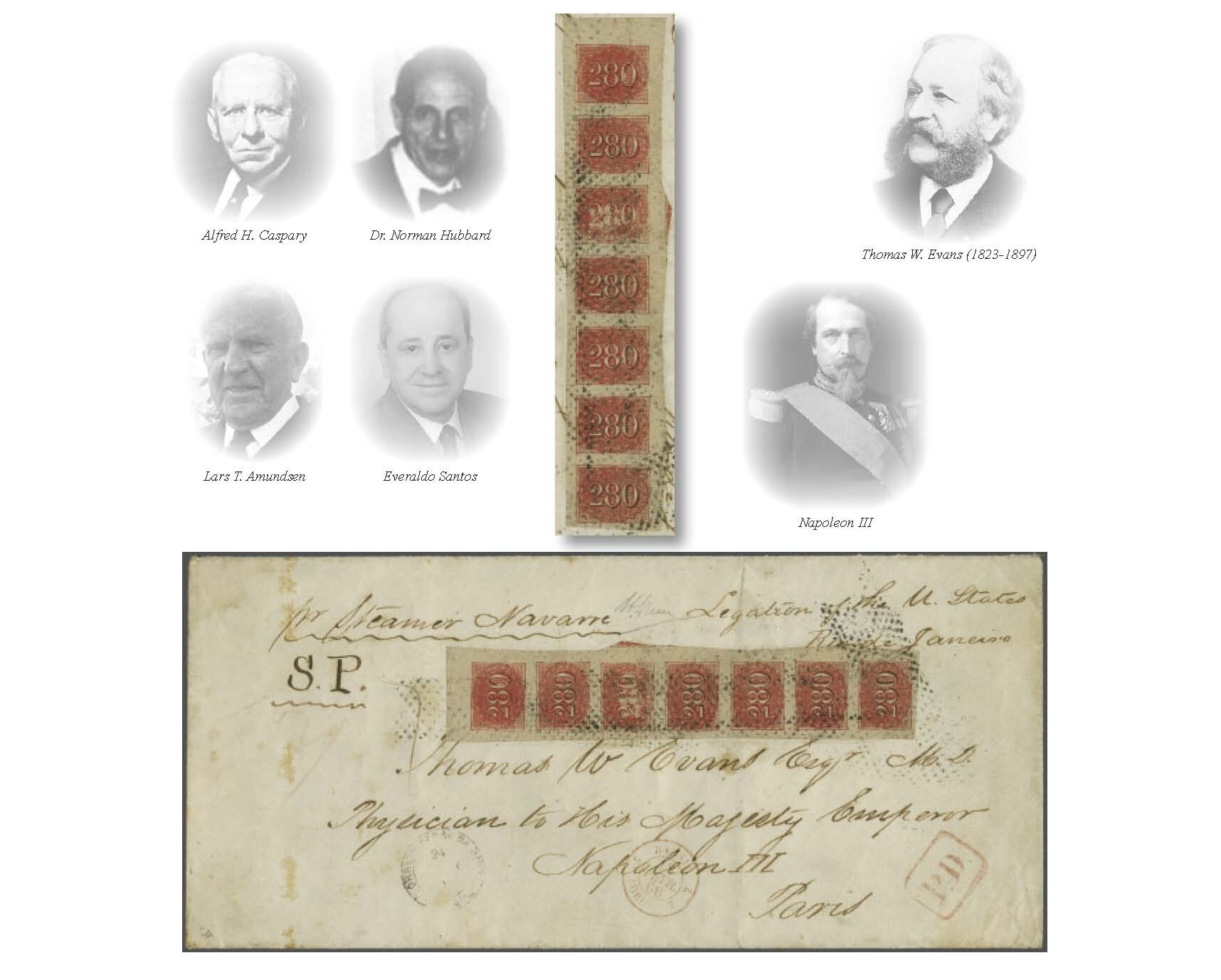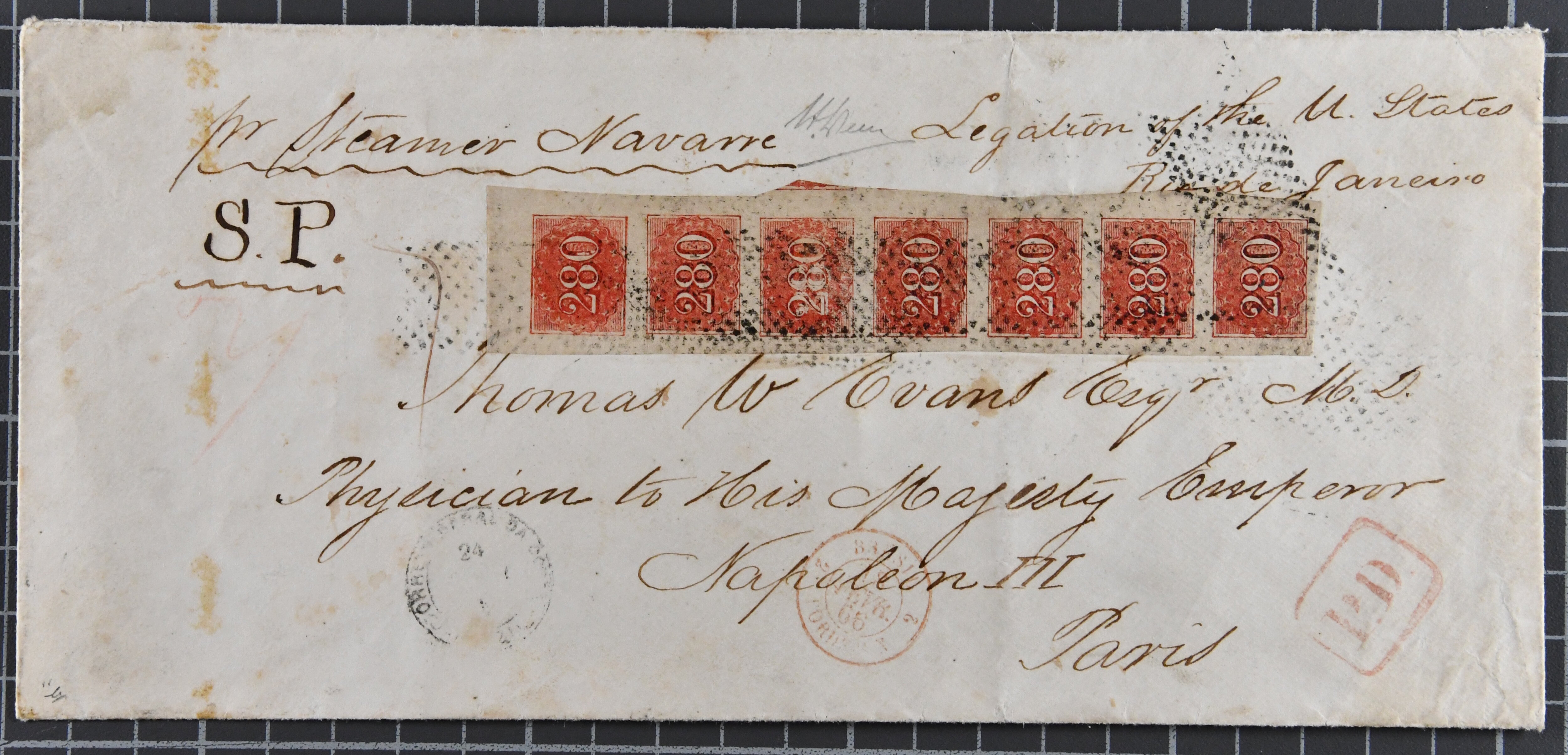 10103 cover imageColoridos 1861: 280 reis red in a truly magnificent vertical used strip of seven, marginal from top of the sheet and showing portion of adjoining stamps at right, all tied by dotted lozenge in black to the famous 24 Dec 1866 cover from the Legation of the United States in Rio de Janeiro, endorsed "S.P" (Servicio Publico) and "pr. Steamer Navarre" and addressed to Thomas W. Evans, MD, Physician to His Majesty Emperor Napoleon III in Paris, franked at seven times rate with "Correio Geral da Corte" cds at left in black and framed "P.D." in red. 'Brésil / Bordeaux' entry marking on obverse (Feb 18) in red. Illustrated in Edition D'Or XXXVII on the front cover and in Edition D'Or 59 on page 70. One of the most significant and memorable covers in all of South American Philately. Signed A. Diena. Provenance: Collection Alfred H. Caspary, Harmers, New York, 2-5 June 1958, lot 555; collection Lars Amundsen, Stanley Gibbons, London, 5-7 Feb 1969, lot 194; collection Dr. Norman Hubbard, Robson Lowe, Basel, 18 March 1975, lot 1738; collection Everaldo Santos, Corinphila sale 269, June 20212, lot 5070. (Image 1) (Image 2) (Image 3) (Image 4)