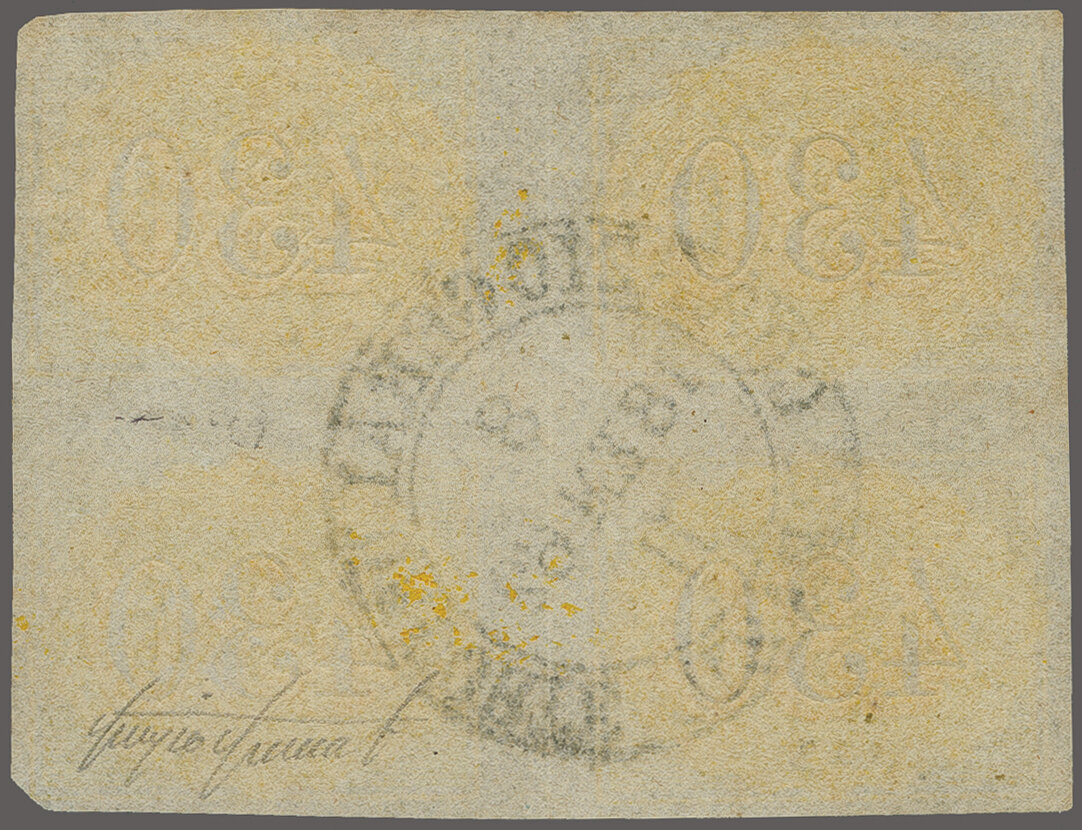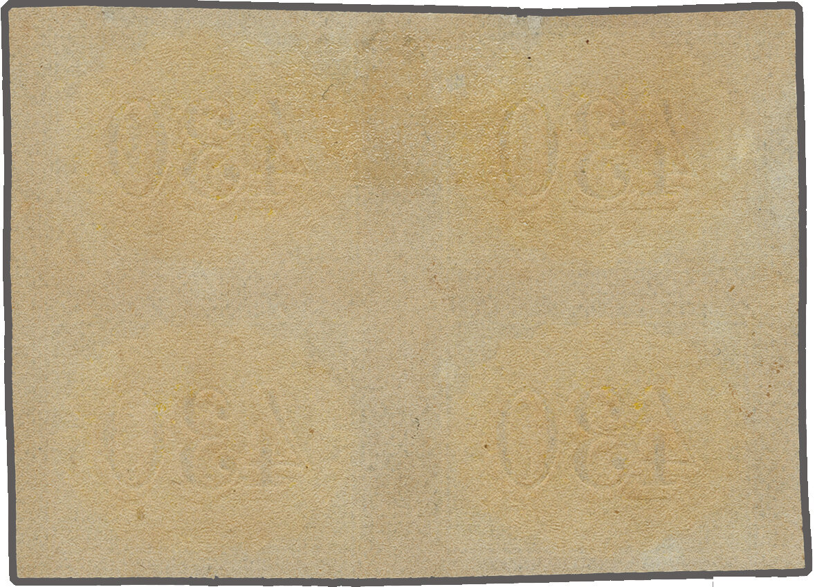10104 bof/(*) imageColoridos 1861: 430 r. yellow, an unused block of four, of fine fresh colour on cream paper, large margins all round, trivial thin spot on first stamp otherwise a splendid block in the foremost quality. The second largest recorded unused multiple of this stamp and of great rarity. (Image 1)