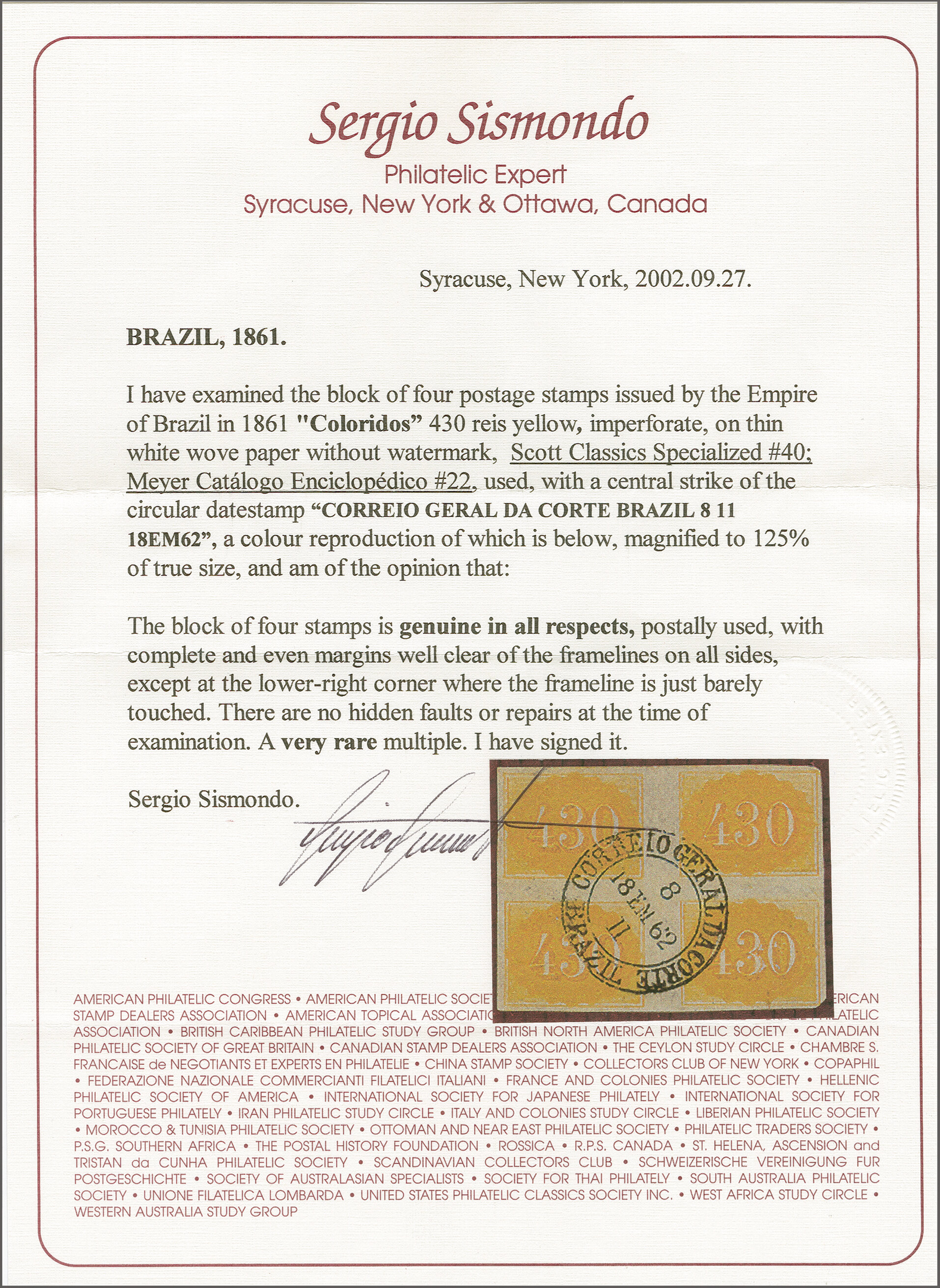 10105 bof imageColoridos 1861: 430 r. yellow, a used block of four, of fine fresh colour on cream paper, good margins all round but imperceptibly shaved at lower right corner, crisply cancelled by single "CORREIO GERAL DA CORTE / BRAZIL" circular datestamp in black (8 November 1862). A splendid block of delightfiul appearance, an extraordinarily rare and most attractive multiple, being the second largest recorded. Cert. Sismondo (2002). (Image 1) (Image 2)