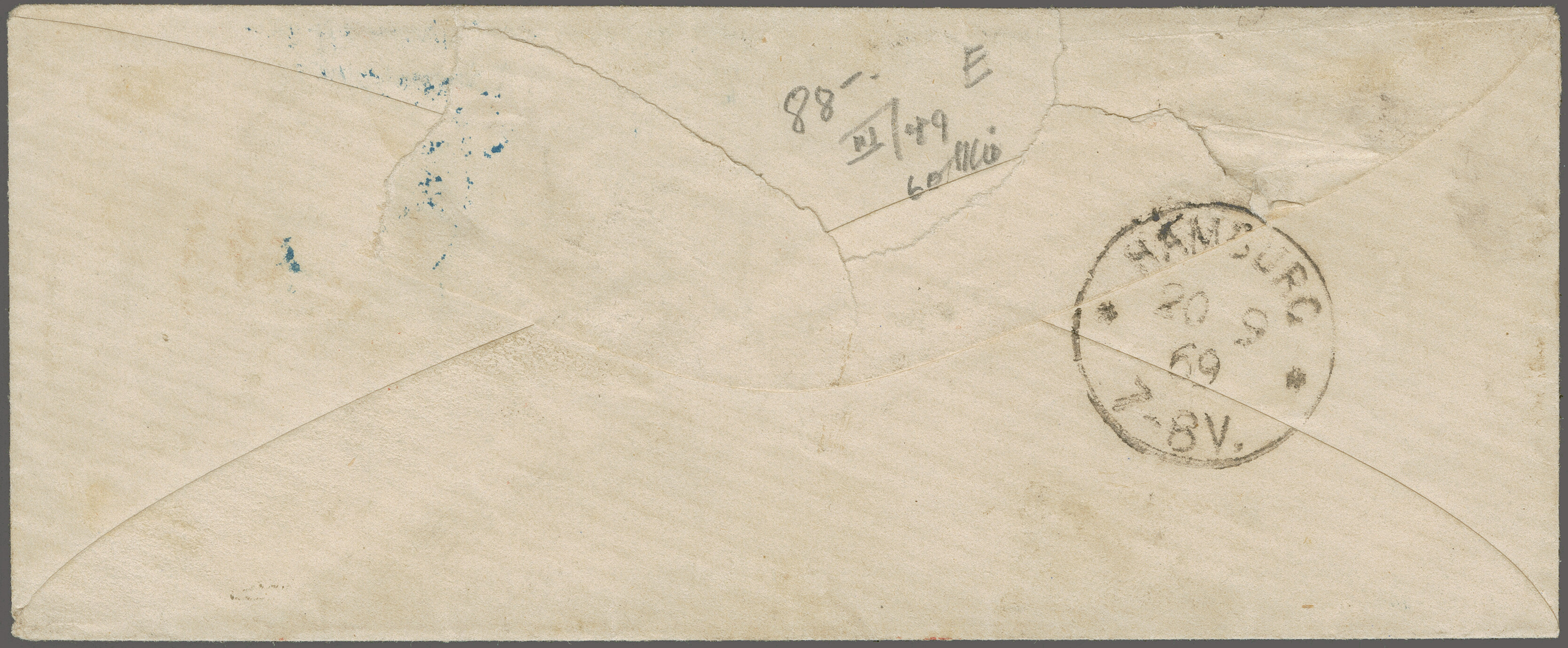 10106 cover imageColoridos 1861: 430 reis yellow, a used example with large margins all round, on 1869 envelope from Rio de Janeiro to Hamburg at single rate, tied by sunburst segmented handstamp and "Rio de Janeiro" despatch cds (Aug 23) in black. Framed "P.D." in red below somewhat overlapped by "Bresil / Bordeaux" transit cds in blue (Sept 18). Reverse with Hamburg arrival cds (Sept 20). A charming and scarce cover. Signed R.F. Engel. (Image 1)