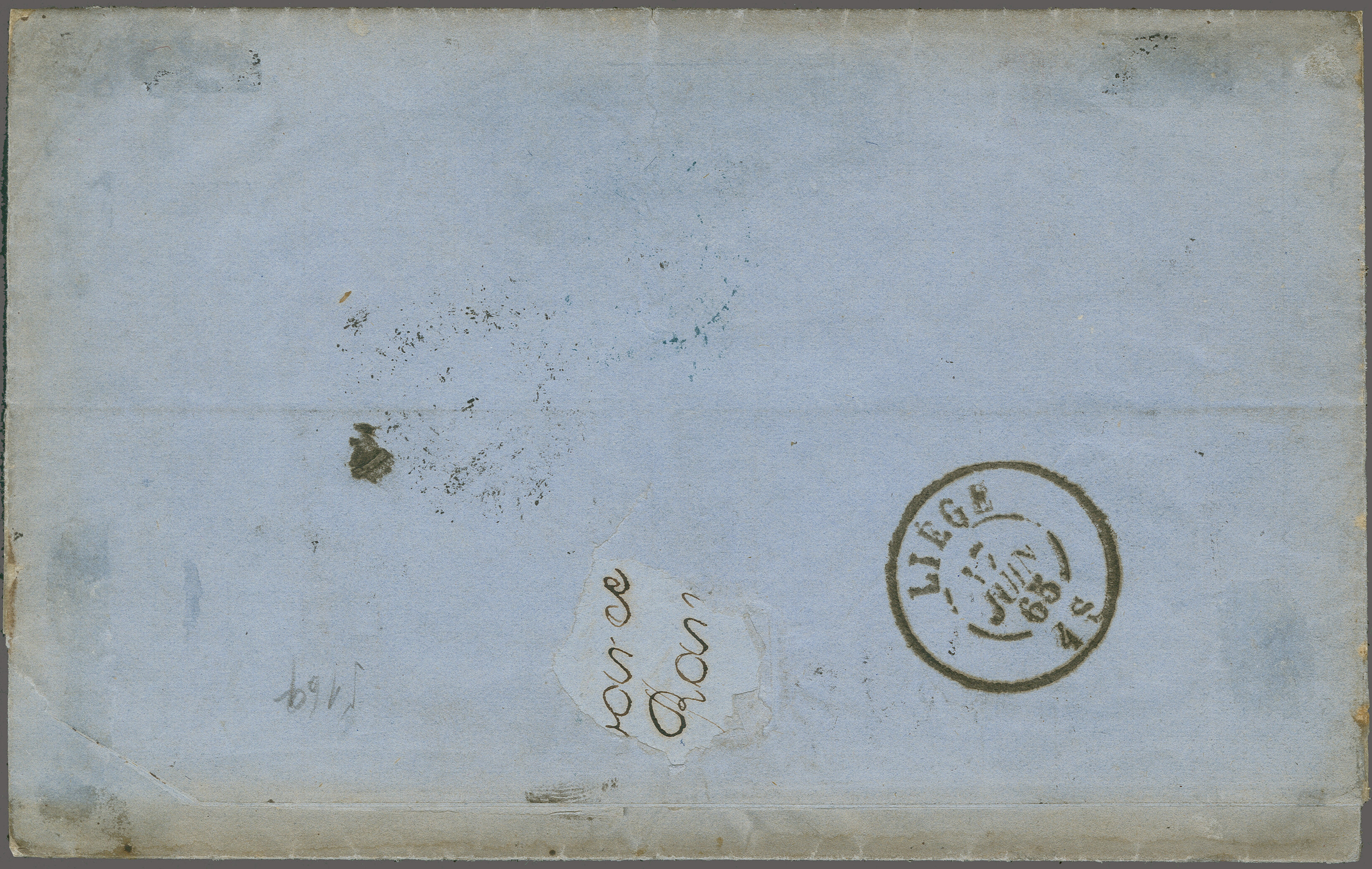 10107 cover imageColoridos 1861: 430 reis yellow, a used vertical pair with good to large margins all round, on 1865 entire letter from Rio de Janeiro to Liege, Belgium at double rate, tied by dotted roller obliterator with "Correio Geral da Corte / Brazil" despatch cds (May 24) in black alongside. Framed "P.D." in red and "Bresil / Bordeaux" transit cds in blue (June 16) all on obverse. Reverse with Liege arrival cds (June 17). A charming and very rare cover to a most unusual destination. (Image 1)