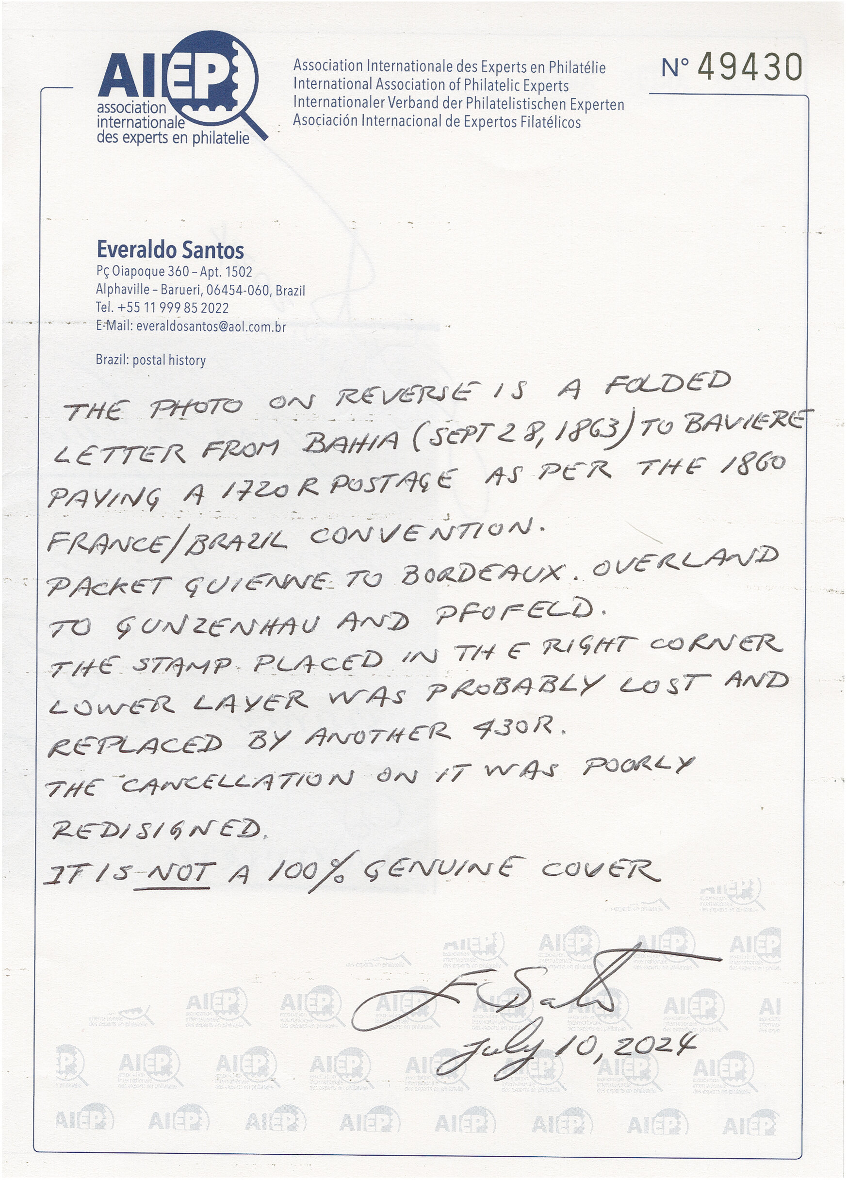 10108 cover imageColoridos 1861: 430 reis yellow, a used horizontal pair and two single examples, one slightly discoloured and added at a later date, but all with mostly large margins, on 1863 cover from Bahia to Pfofeld, Bavaria at quadruple rate endorsed "par Guienne", tied by oval "CORREIO DA BAHIA / BRAZIL" oval handstamps in black with "Correio da Bahia / Brazil" despatch cds (Sept 28) in black below. Framed "P.D." in red and "Bresil / Bordeaux" transit cds in red (Oct) all on obverse. Reverse with half-round Gunzenhausen datestamp in black. Despite the added adhesive a very rare cover at quadruple rate to an unusual destination. Cert. Santos AIEP (2024). Provenanceé Collection Everaldo Santos, Afinsa, Madrid, 14 March 2001, lot 161. (Image 1) (Image 2)