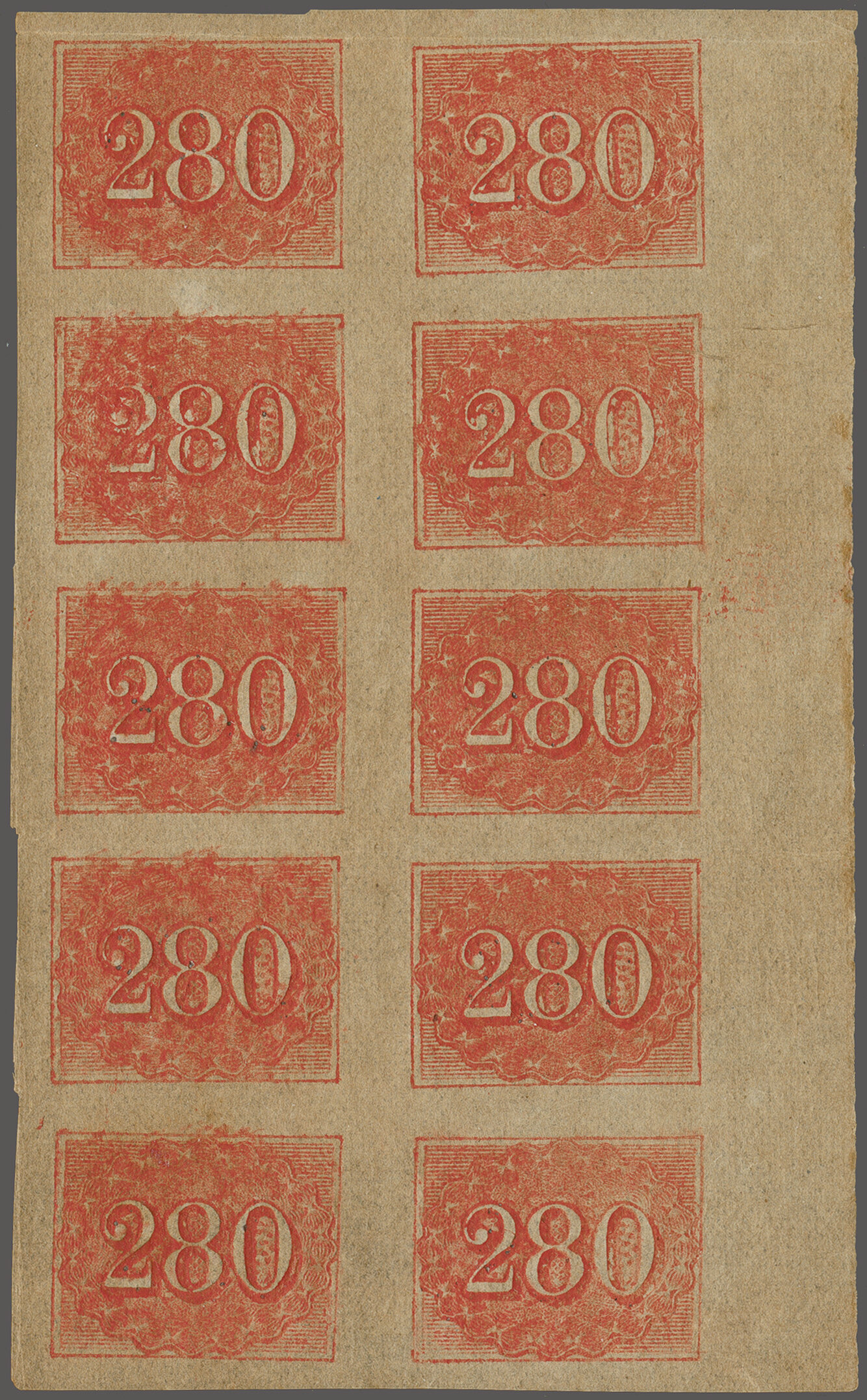 10100A **/*/bof imageColoridos 1861: 280 reis vermilion red, an unused block of ten (2 x 5), with huge margins all round and sheet marginal at right, of magnificent rich colour, minor crease at top between the first and second rows and insignificant thin spot, superb large part original gum. The largest known multiple of this stamp in the foremost exhibition quality. A great rarity of Brazilian classical philately. Provenance: Collection Muniz de Aragao, Corinphila sale 42, Zurich, 31 Jan 1955, lot 6304; collection Reynaldo Bruno Pracchia, DF, Zurich, 18 Nov 1987, lot 60298; collection Everaldo Santos, Afinsa, Madrid, 14 March 2001, lot 150. (Image 1) (Image 2)