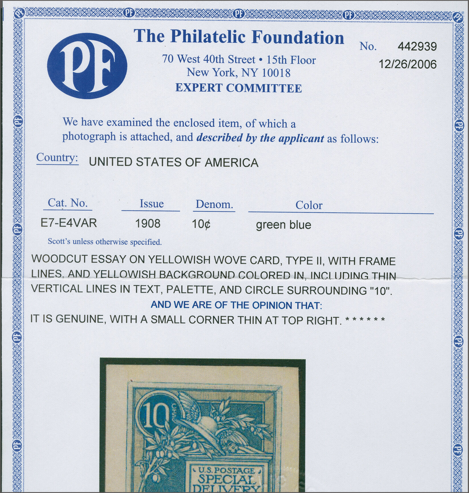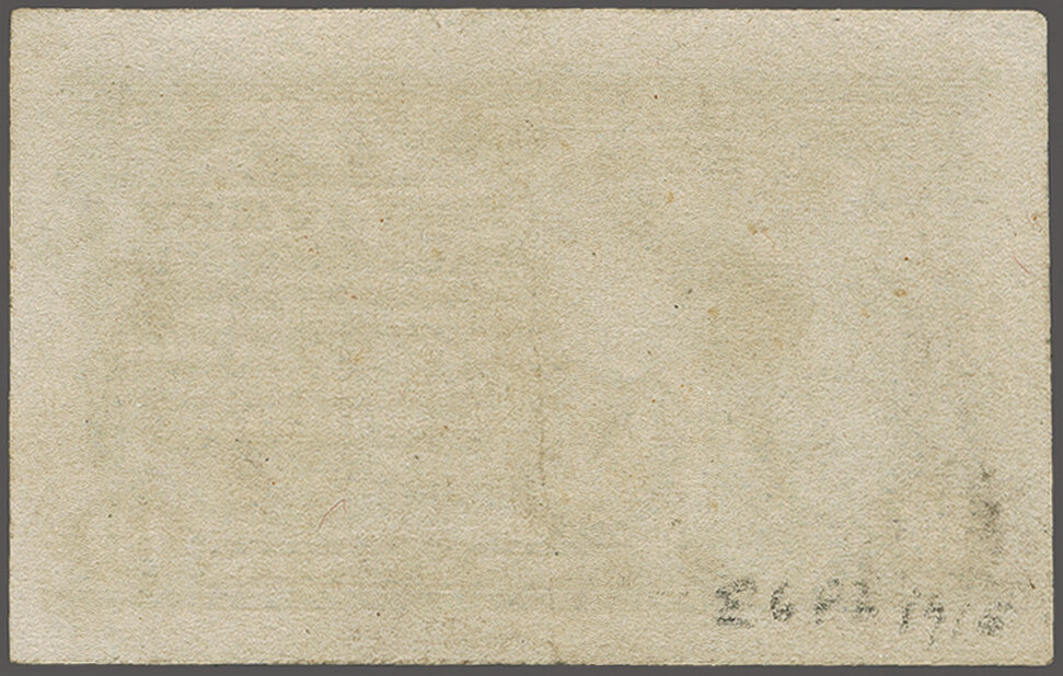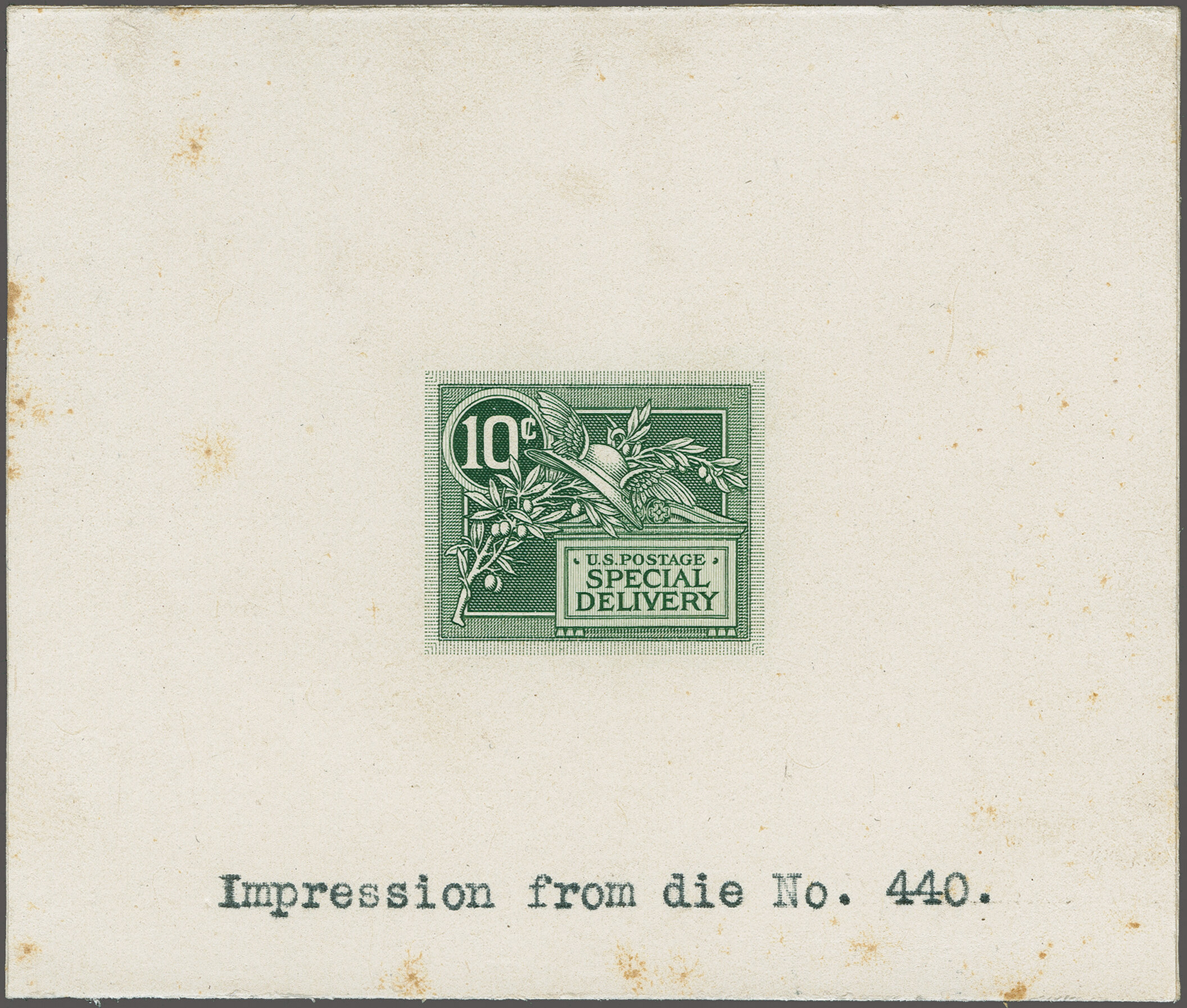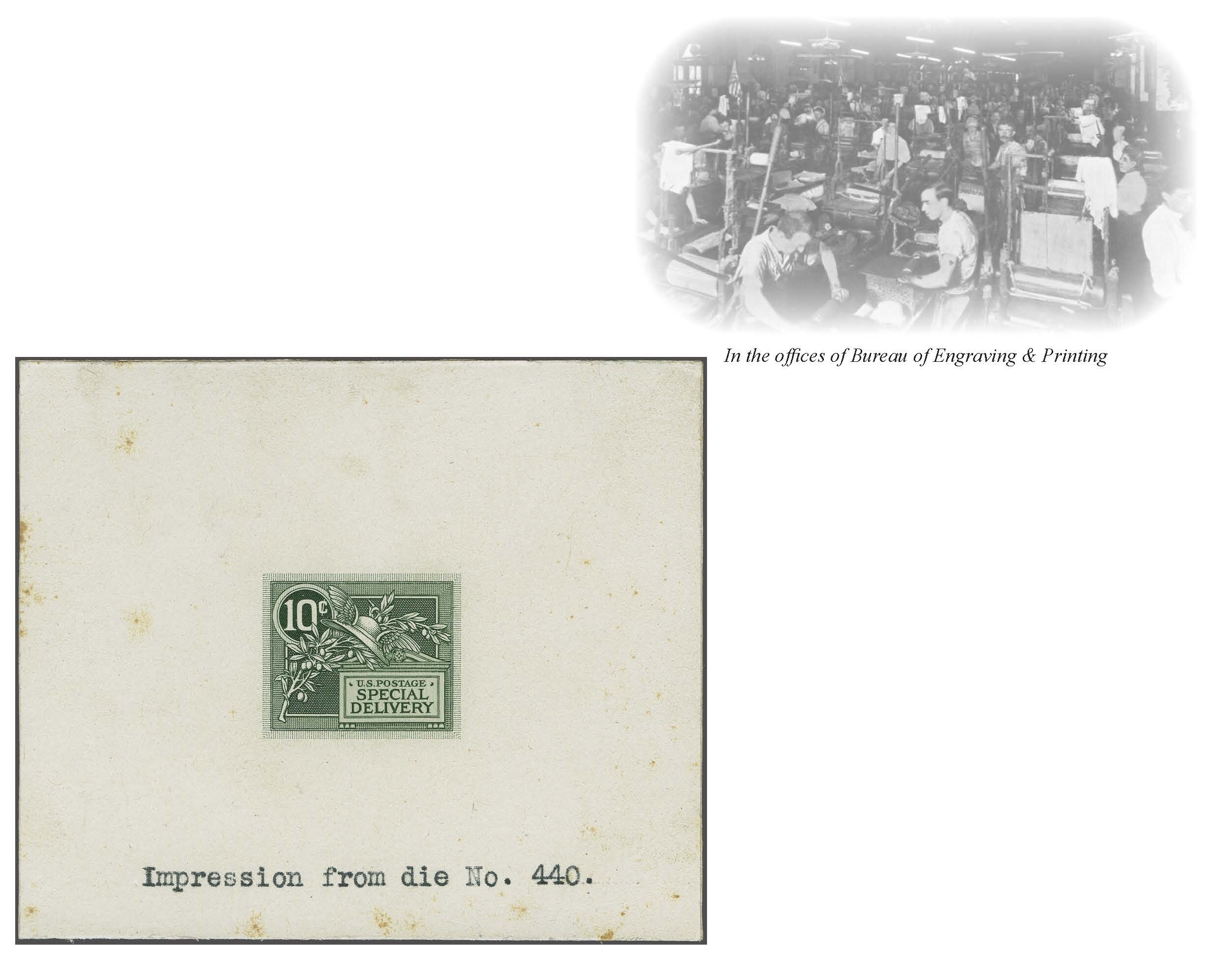 49 (*) image1908: 10 c. Green - the "Merry Widow" Issue 1908: 10 c. green, large die proof of the approved design, on India, sunk on card, trimmed to die size, 89 x 75mm, typed "Impression from die No. 440." good colour and impression, scattered tone spots clear of impression, fine-very fine and scarce, the only Bureau trial impression large die proof recorded. Scott = $2,750. Provenance: Collection Markovits, Schuyler Rumsey Philatelic Auctions, June 1, 2016, lot 1120. (Image 1) (Image 2) (Image 3)