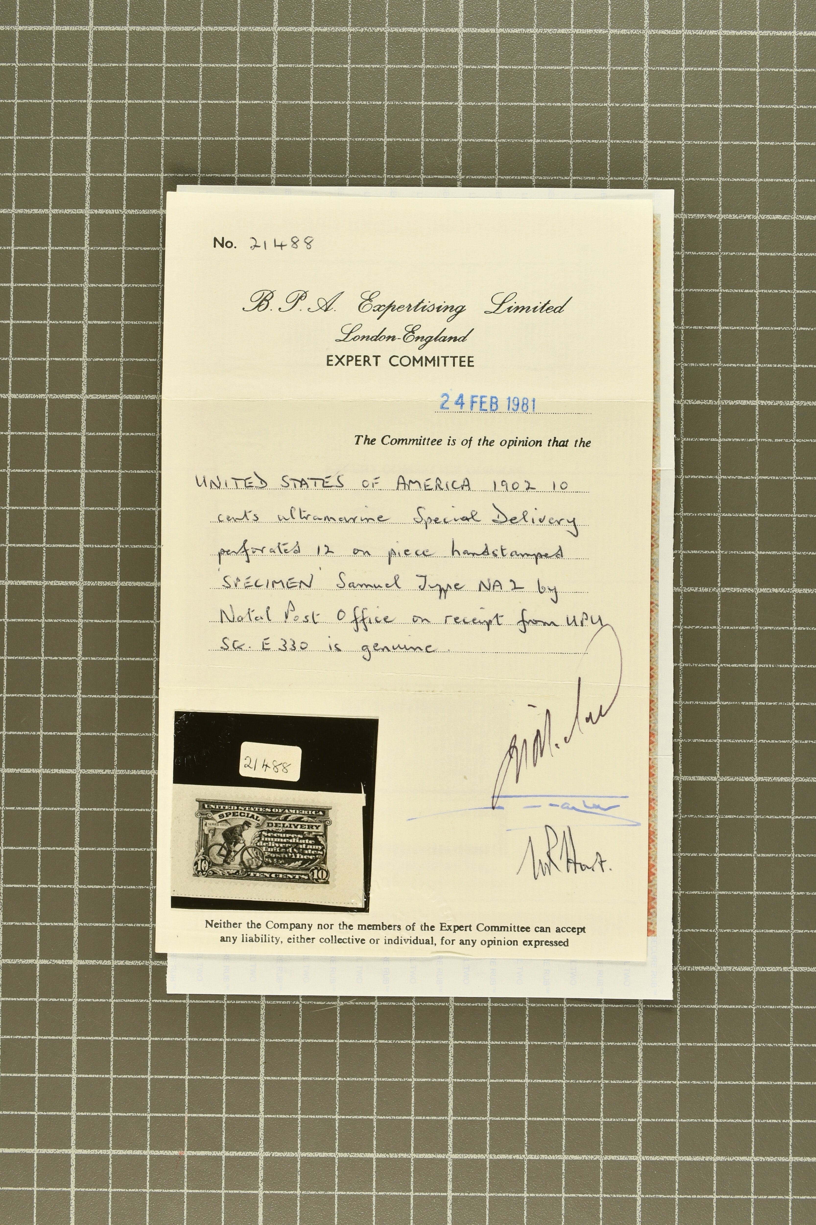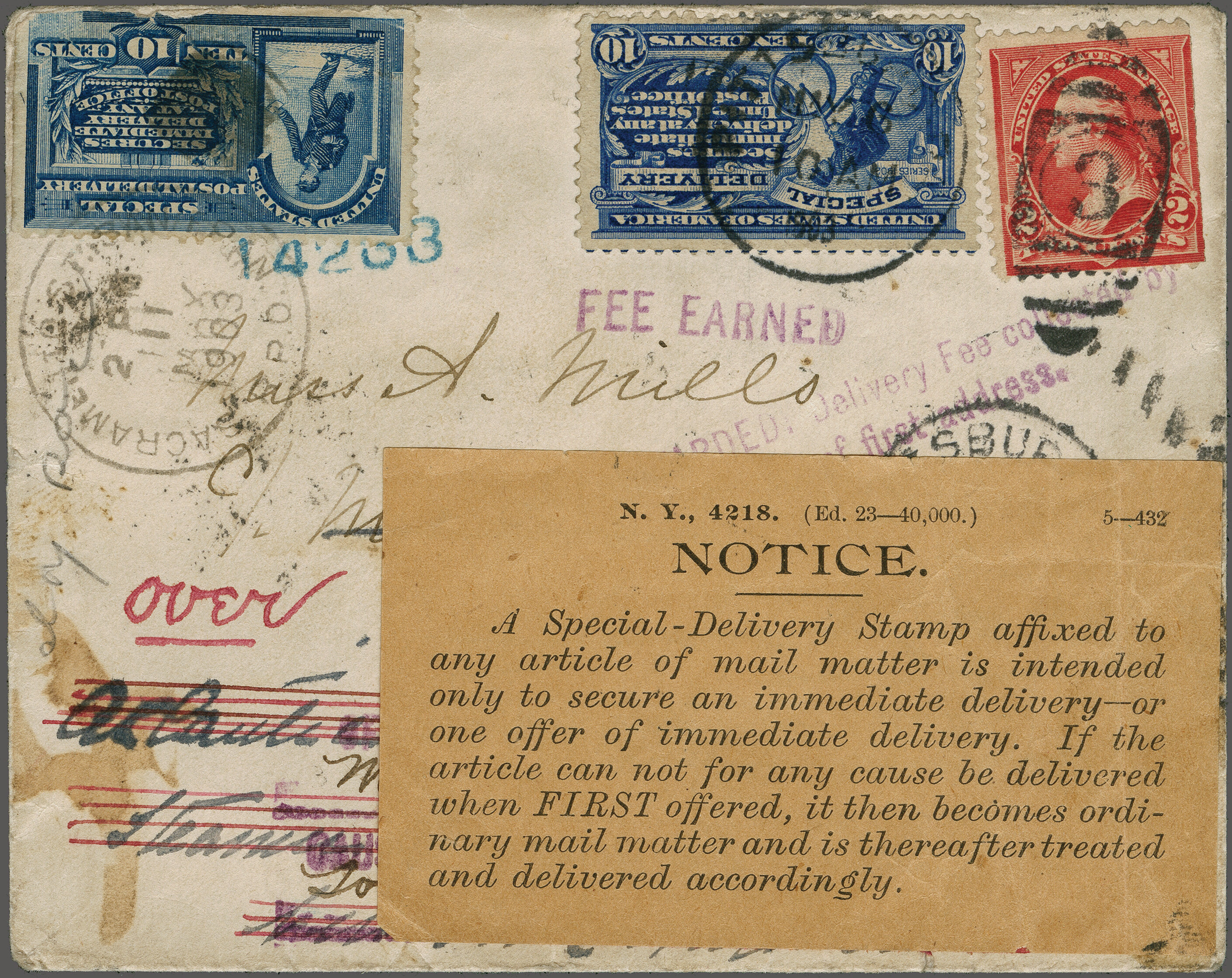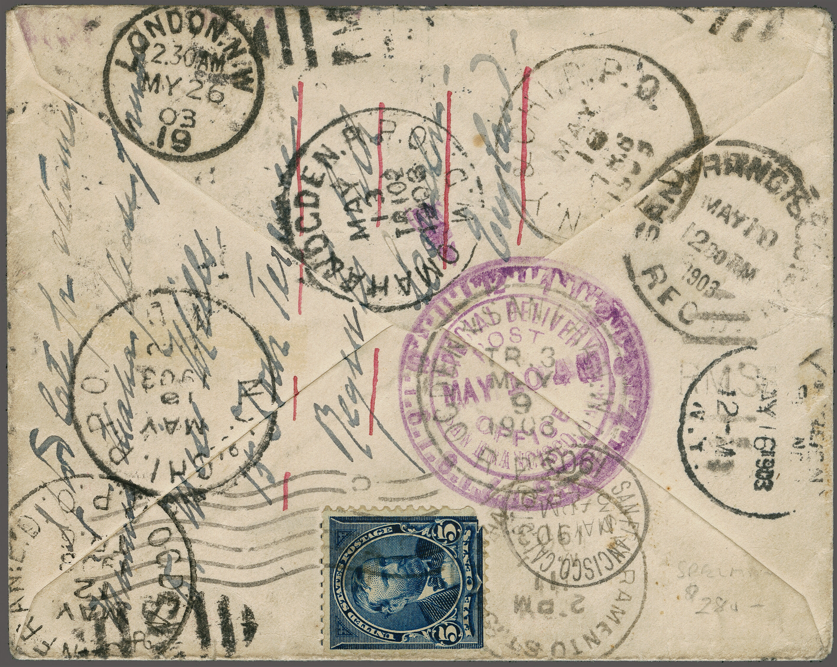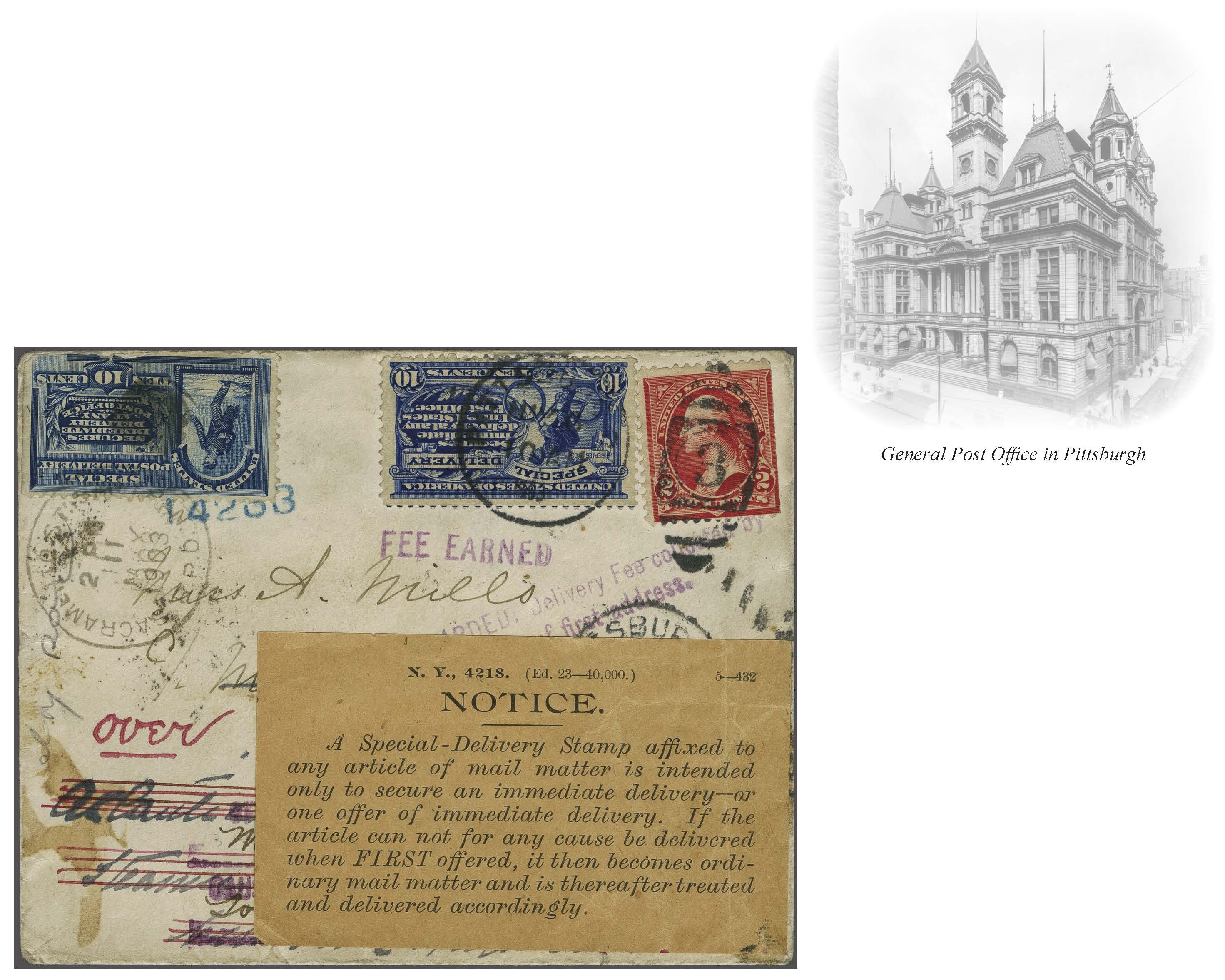 43 cover image1902: 10 c. Ultramarine Issue 1902: 10 c. ultramarine, affixed alongside 2 c. carmine to cover to San Francisco, tied by Pittsburg duplex (May 6, 1903), forwarded from San Francisco to London, England, with additional 1888 10 c. Special Delivery and 5c postage, struck in violet "FEE EARNED" and "FORWARDED / Delivery Fee collected by / Office of first address", range of San Francisco and RPO transit markings, received in New York and postmarked by Foreign Mail Office (May 16), second address crossed-out and handstamped "OFFERED AT ADDRESS / AT / CAUSE OF NON DELIVERY", with manuscript endorsement indicating the connecting steamer had sailed, Special Delivery informational label affixed overtop of address, ultimate London c.d.s. arrival backstamp (May 26), some small flaws given the cover's extended journey, exceptionally striking and rare, being the only recorded mixed franking of the 1888 and 1902 Special Delivery issues. (Image 1) (Image 2) (Image 3)