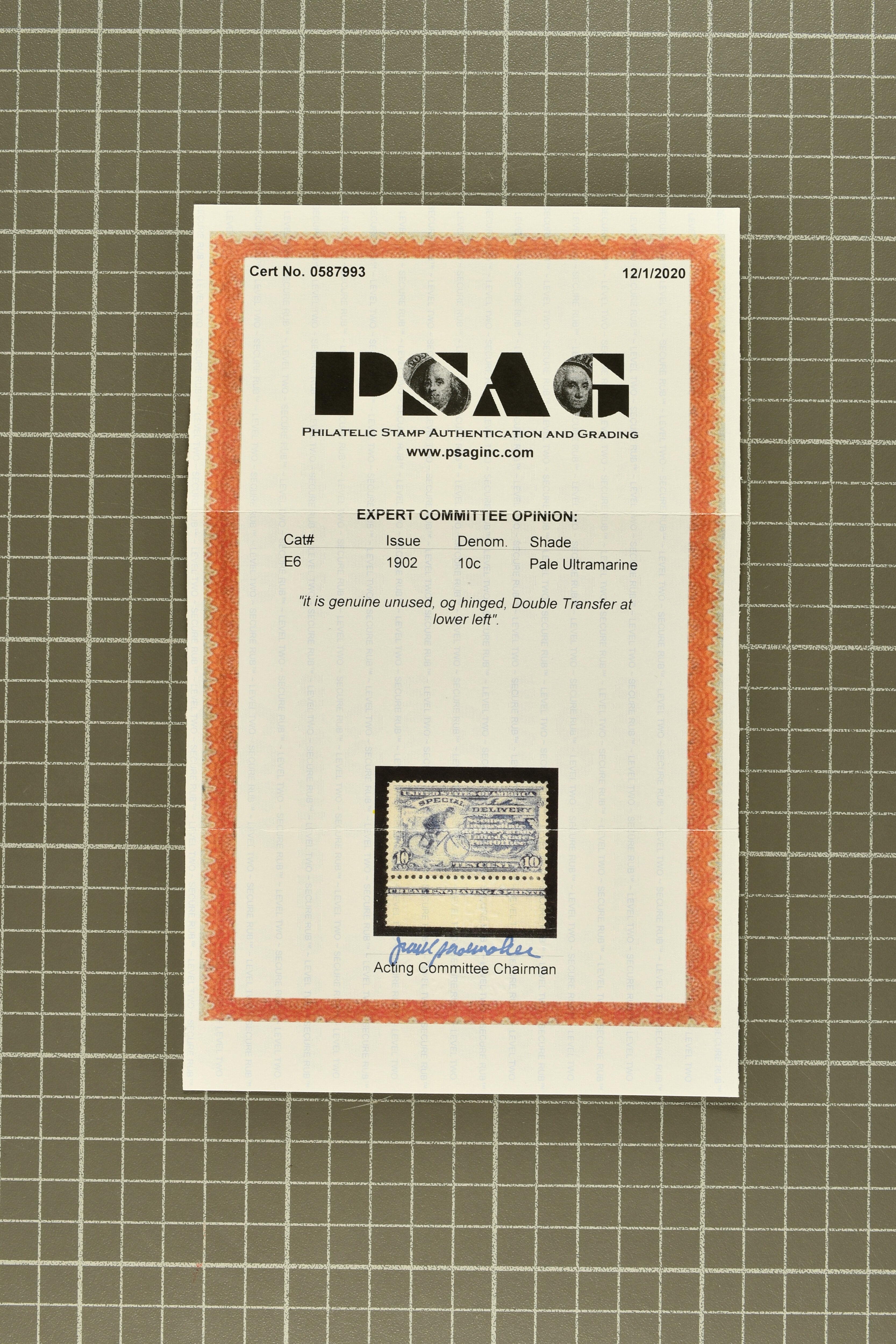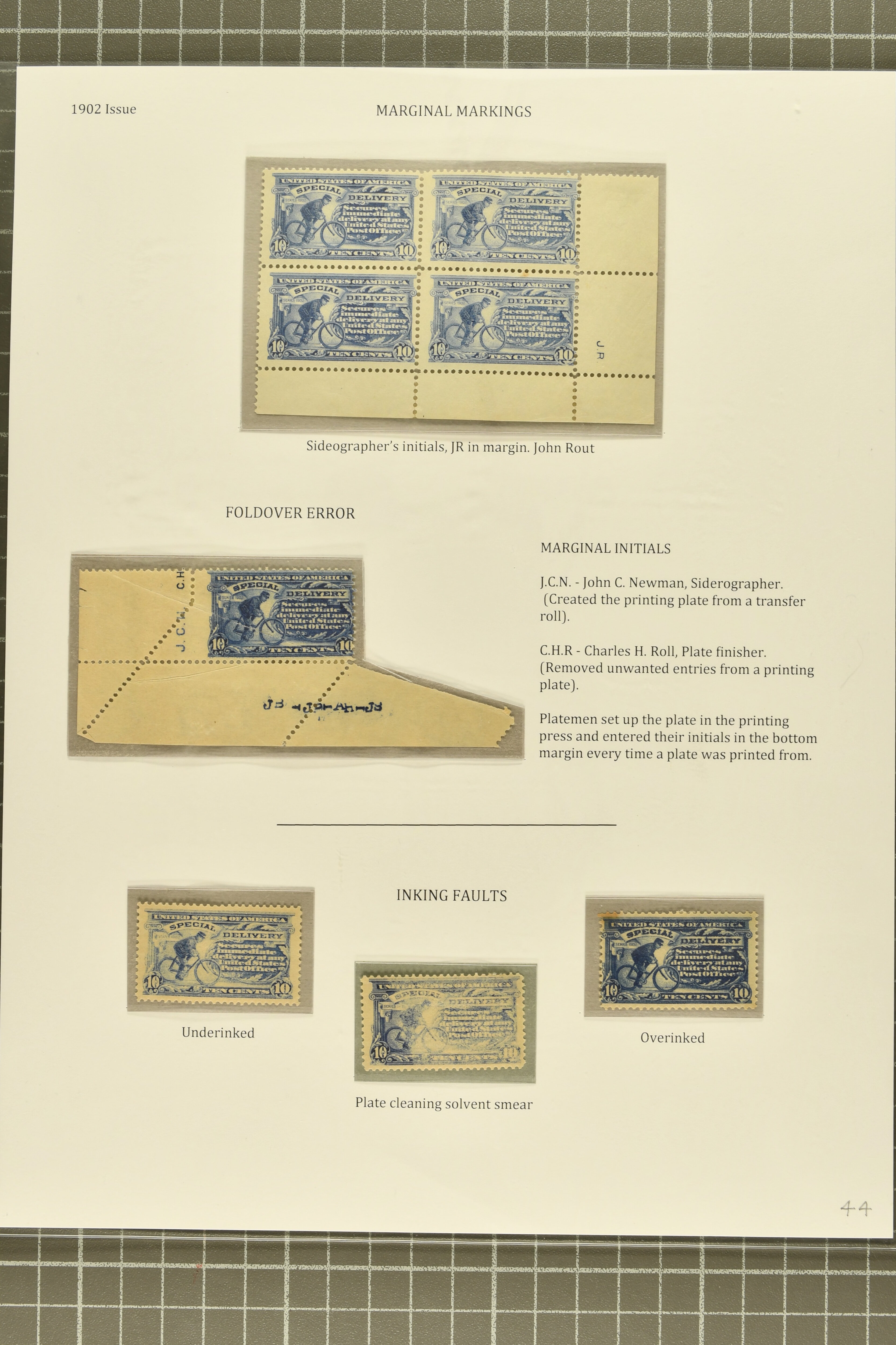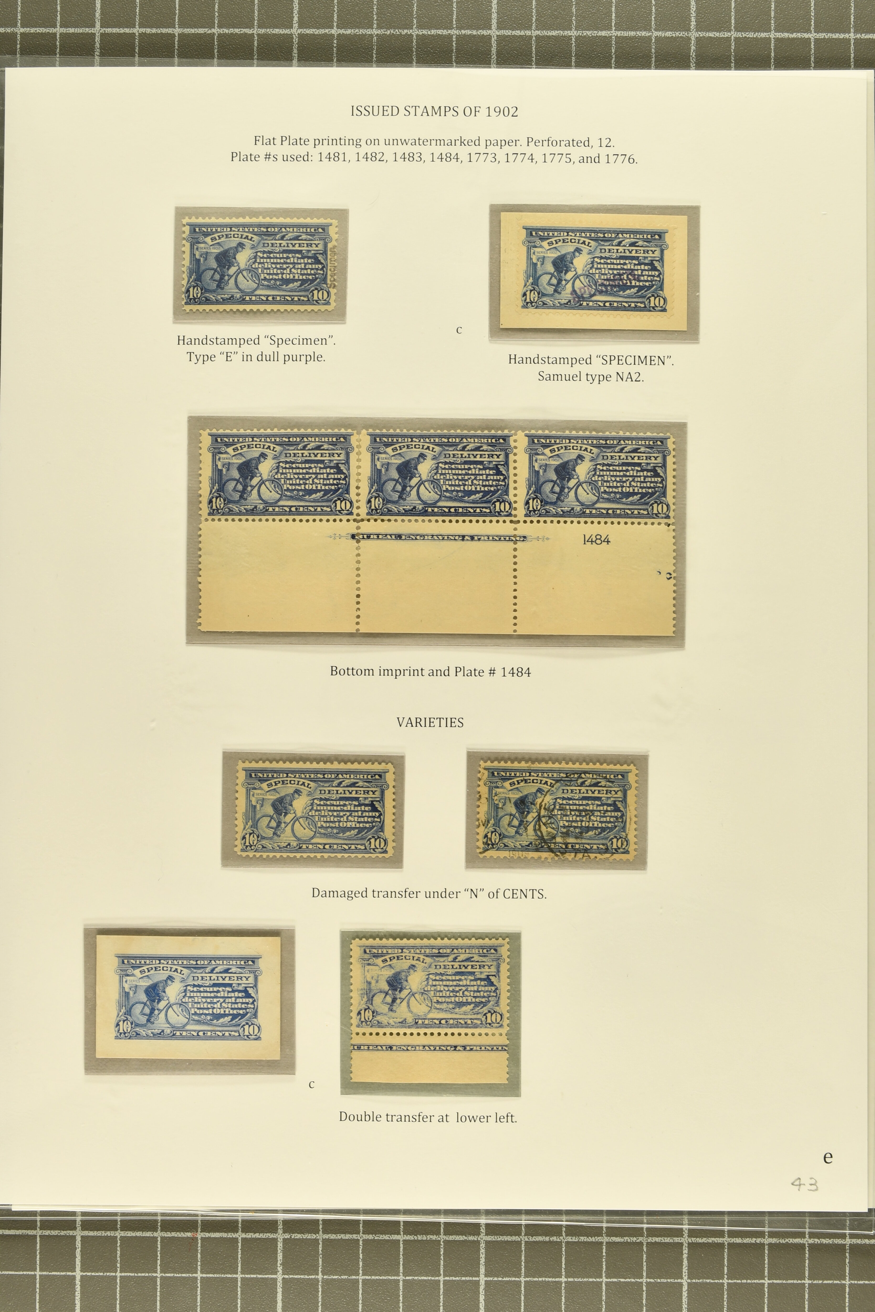 42 * image1902: 10 c. Ultramarine Issue 1902: 10 c. ultramarine, balance of stamps and proofs, with Roosevelt small die proof, two SPECIMEN overprints (Type E in dull purple, and Samuel type NA2, struck on receipt by the Natal Post Office), three inking varieties including over and under-inked as well as one showing a plate cleaning solvent smear, used and unused examples of the damaged transfer under "N" of "CENTS", unused lower margin single with partial plate inscription showing the double transfer at lower left, lower left corner block of four showing sideographer John Rout's initials in selvedge, dramatic lower-left corner single showing both marginal initials of the sideographer and plate finisher as well as a striking misperforation due to a paper fold-over, and an unused lower plate strip of three with complete inscription, with thin but of fresh appearance, a few small flaws, mostly part to large part original gum, a desirable and chiefly fine group for the specialist. Certs BPA (1981) for Specimen NA2, and PSAG (2020) for the double transfer variety. (Image 1) (Image 2) (Image 3) (Image 4)