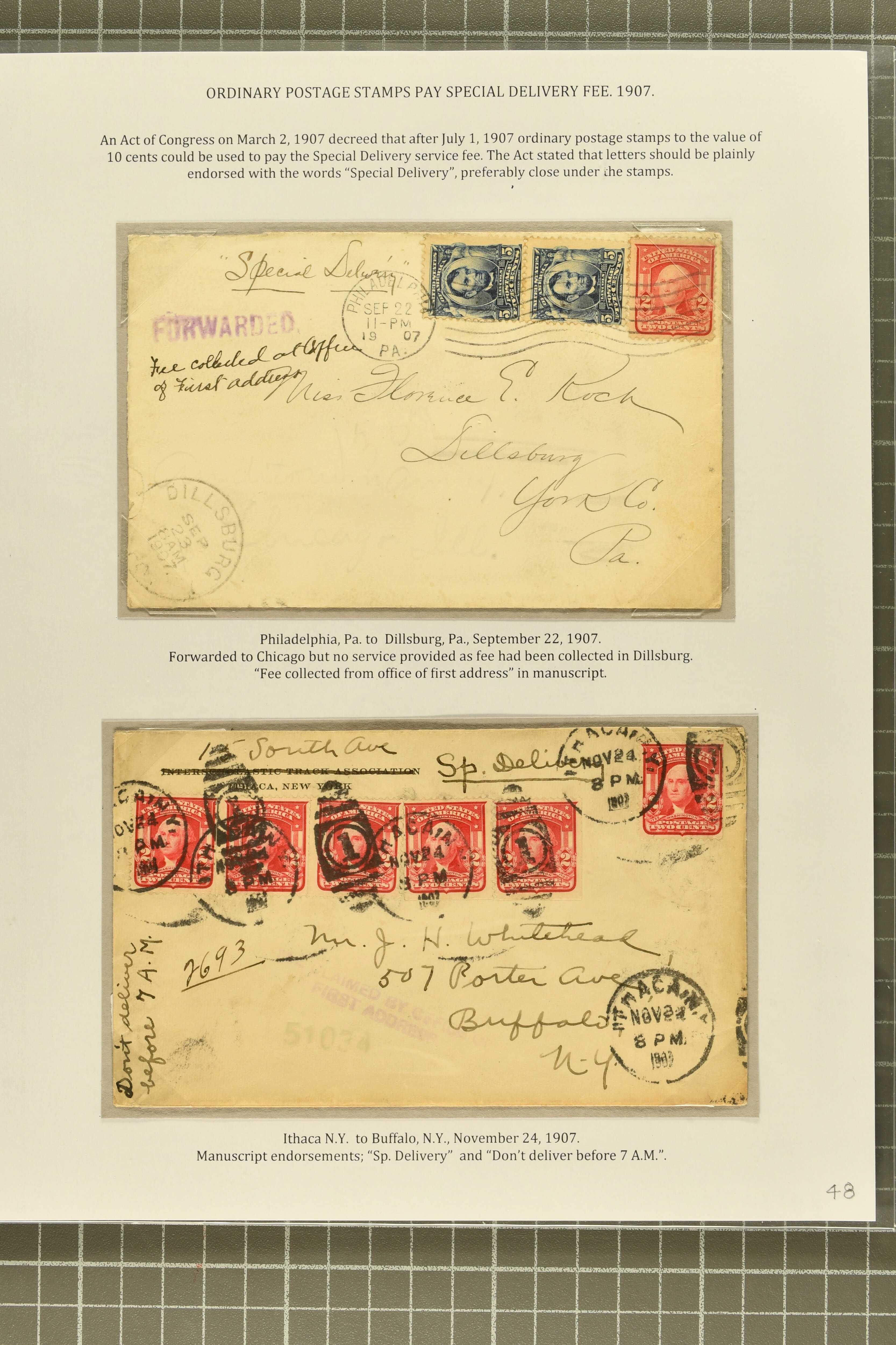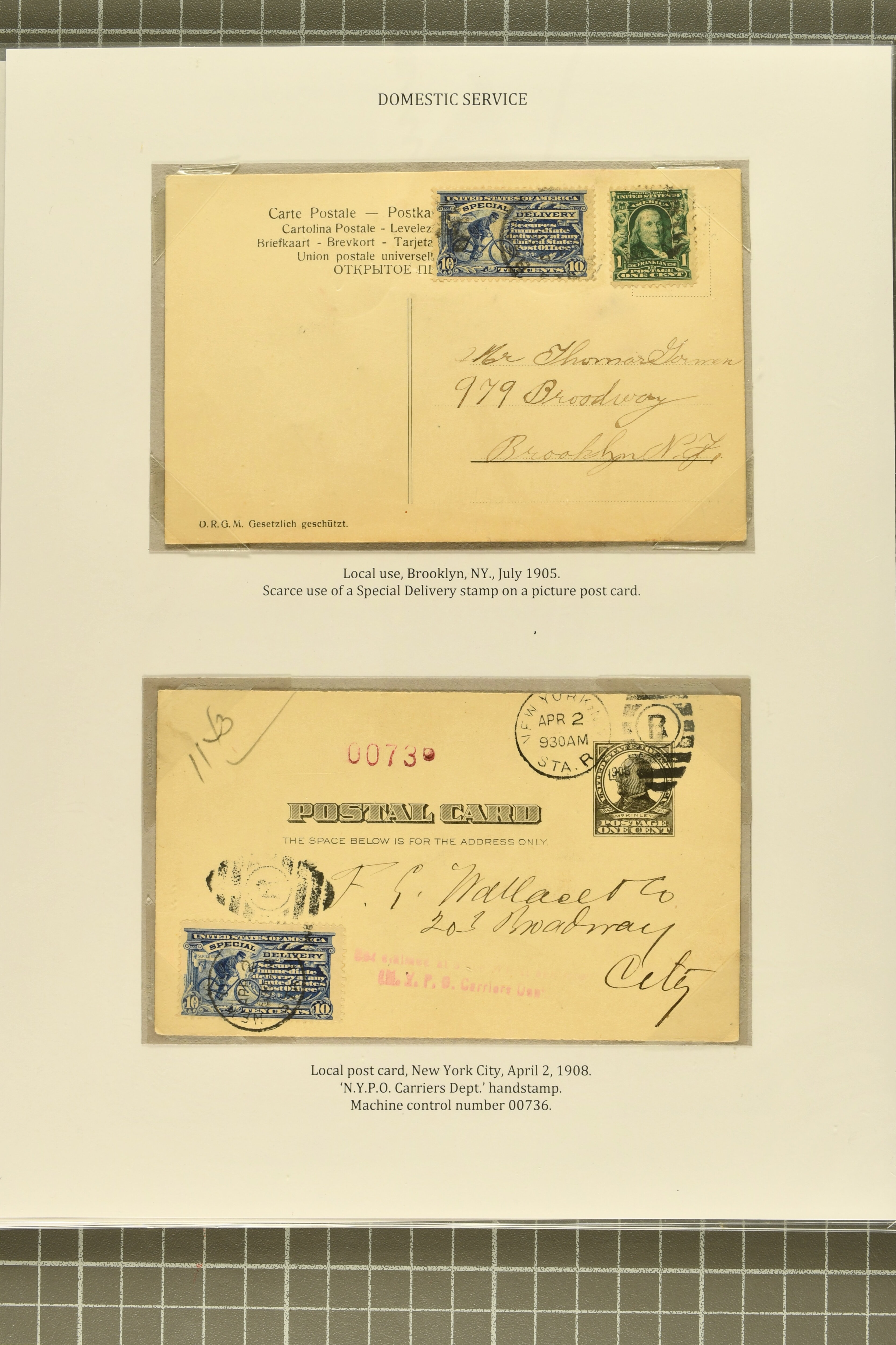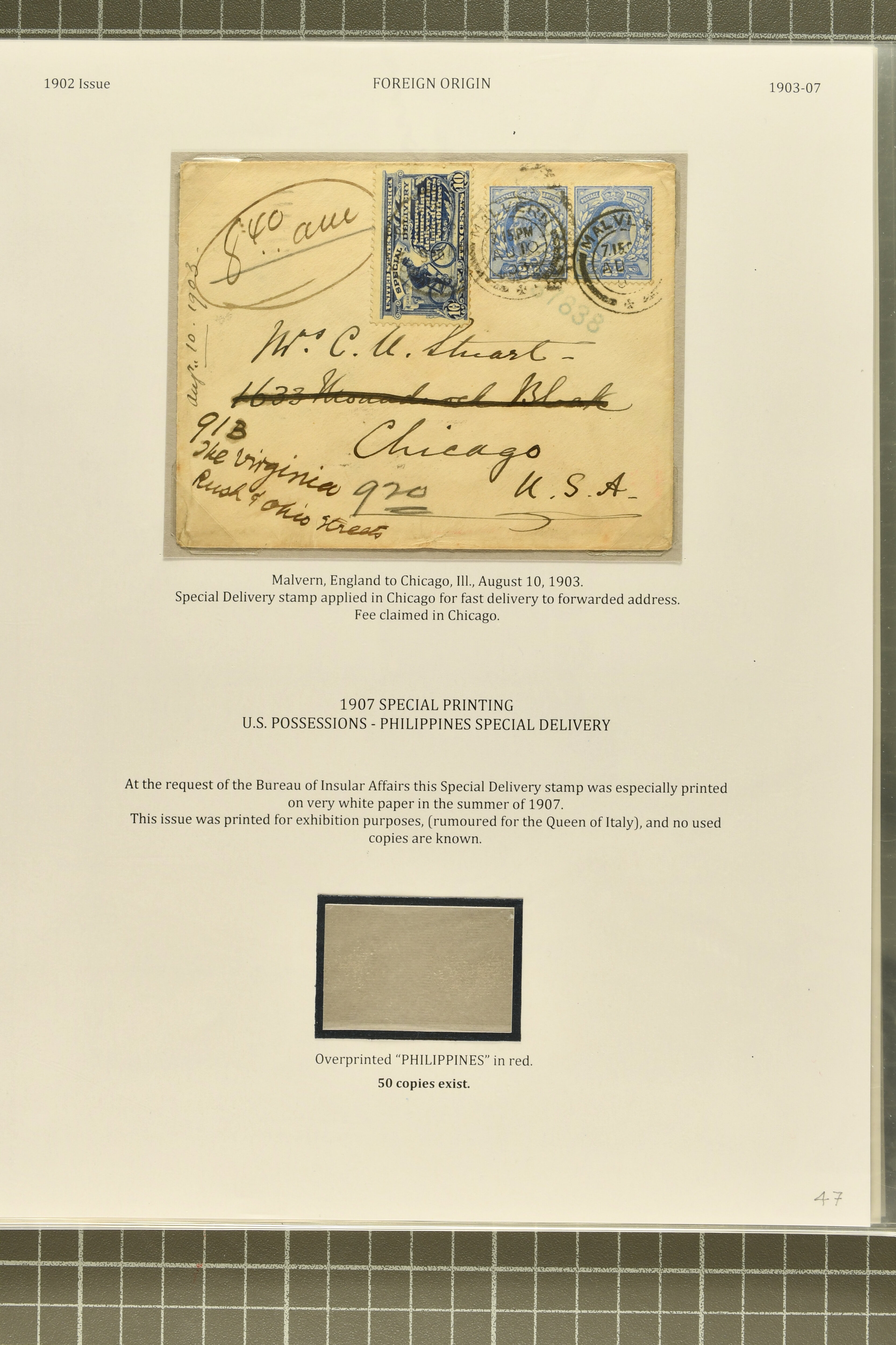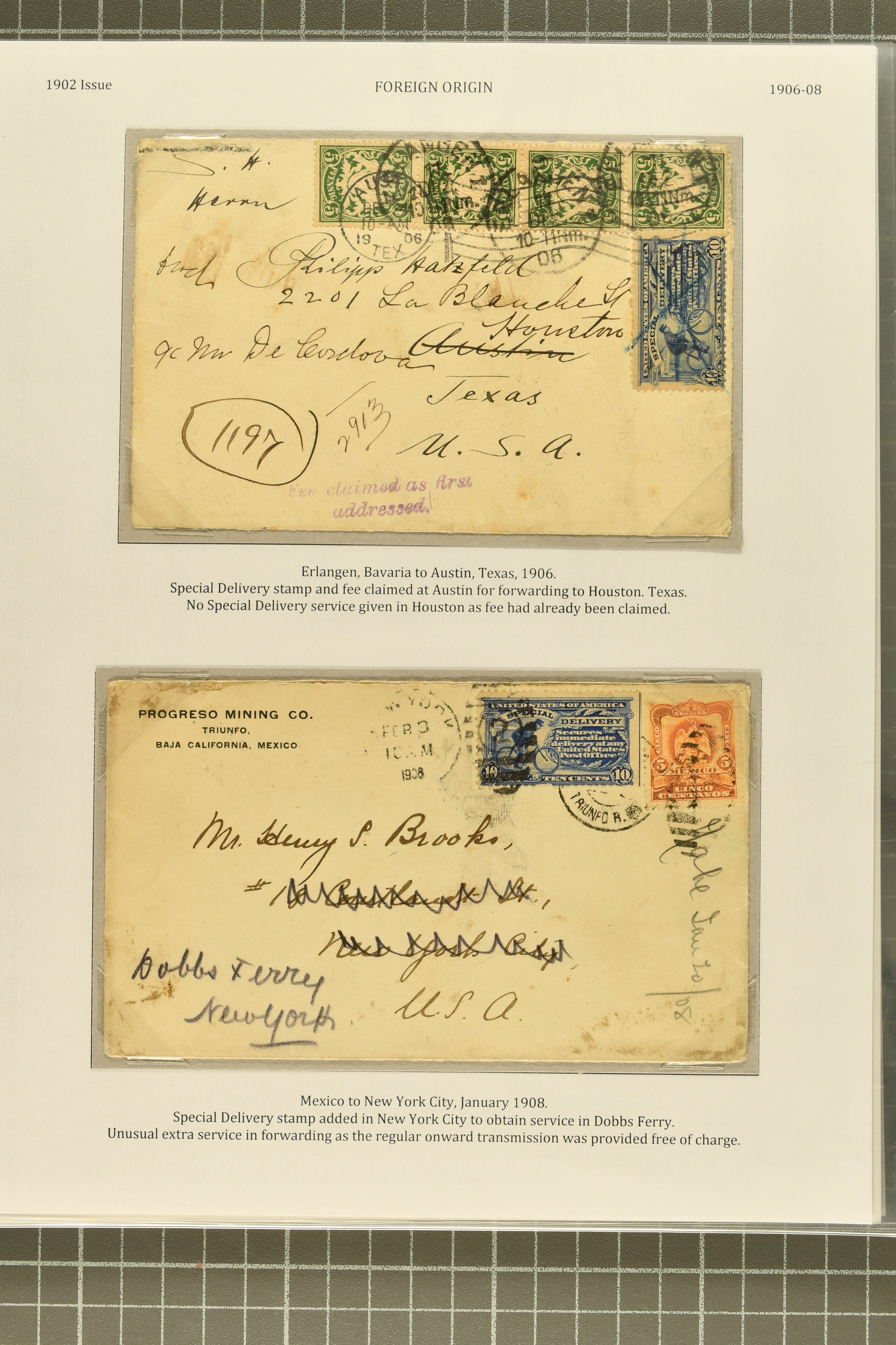 44 cover image1902: 10 c. Ultramarine Issue 1902: 10 c. ultramarine, postal history collection, with nine items, illustrating a range of usages, note foreign origins including a 1903 cover from England to Chicago, 1906 cover front from Erlangen, Bavaria to Austin, Texas, and 1908 cover from Mexico City to New York, with forwarding within the city provided free of charge, instructional markings including "Returned by messenger / as undeliverable" and "Fee paid at city of first address", examples on postal card and unusual usage on picture postcard, 1907 and 1908 examples to Boston with "clock" receiver strikes, with two additional covers, both sent within 1907, without Special Delivery frankings but showing the fee paid with regular issue postage stamps, some flaws commensurate with commercial usage, overall fresh and fine. (Image 1) (Image 2) (Image 3) (Image 4) (Image 5) (Image 6) (Image 7)
