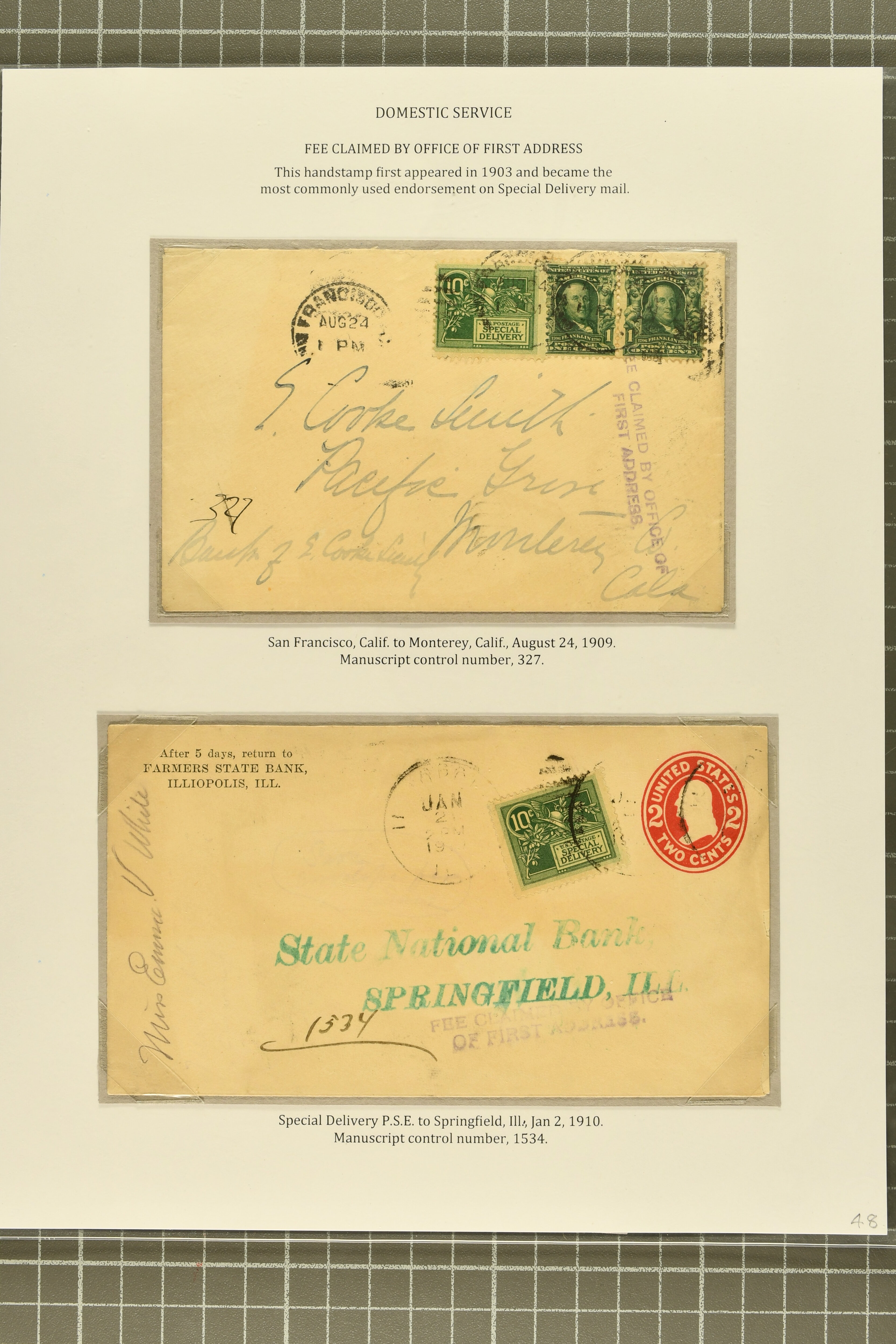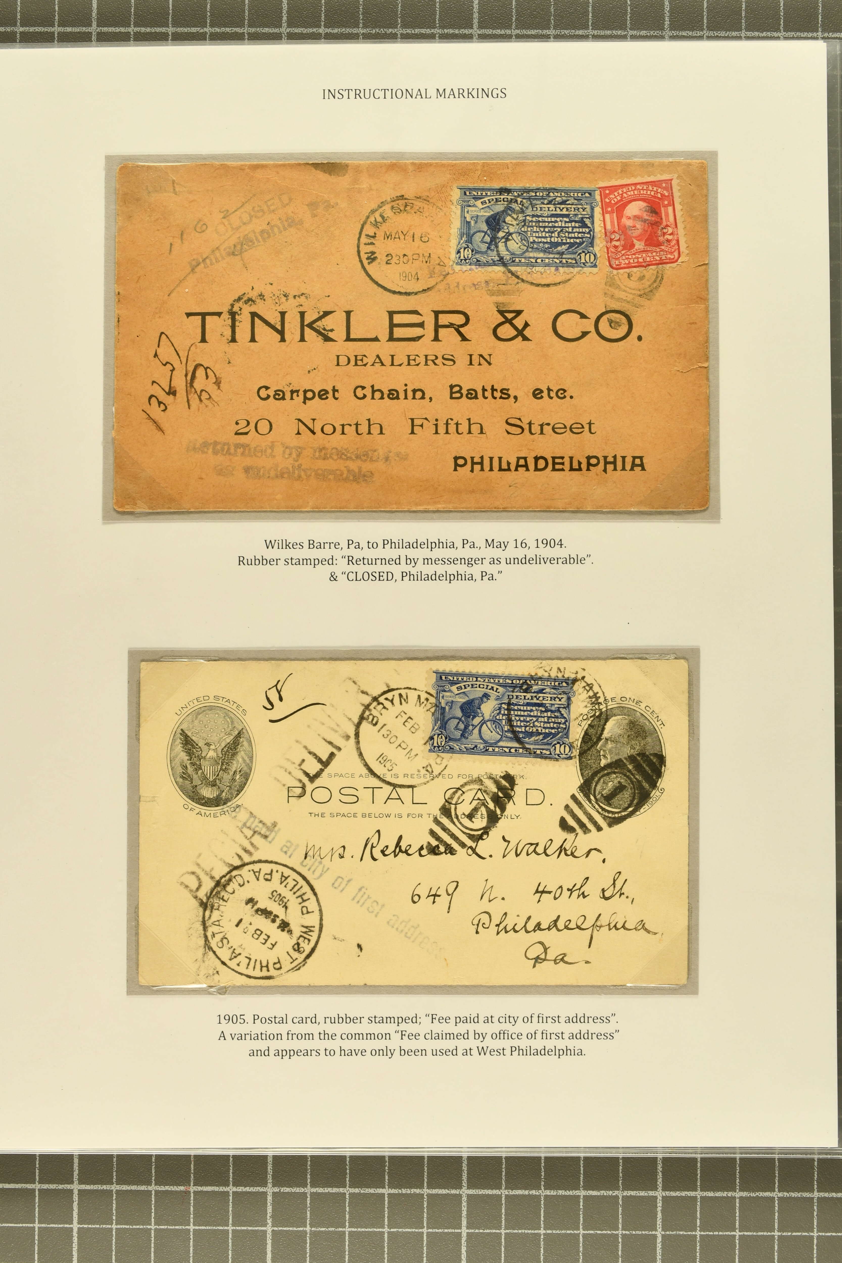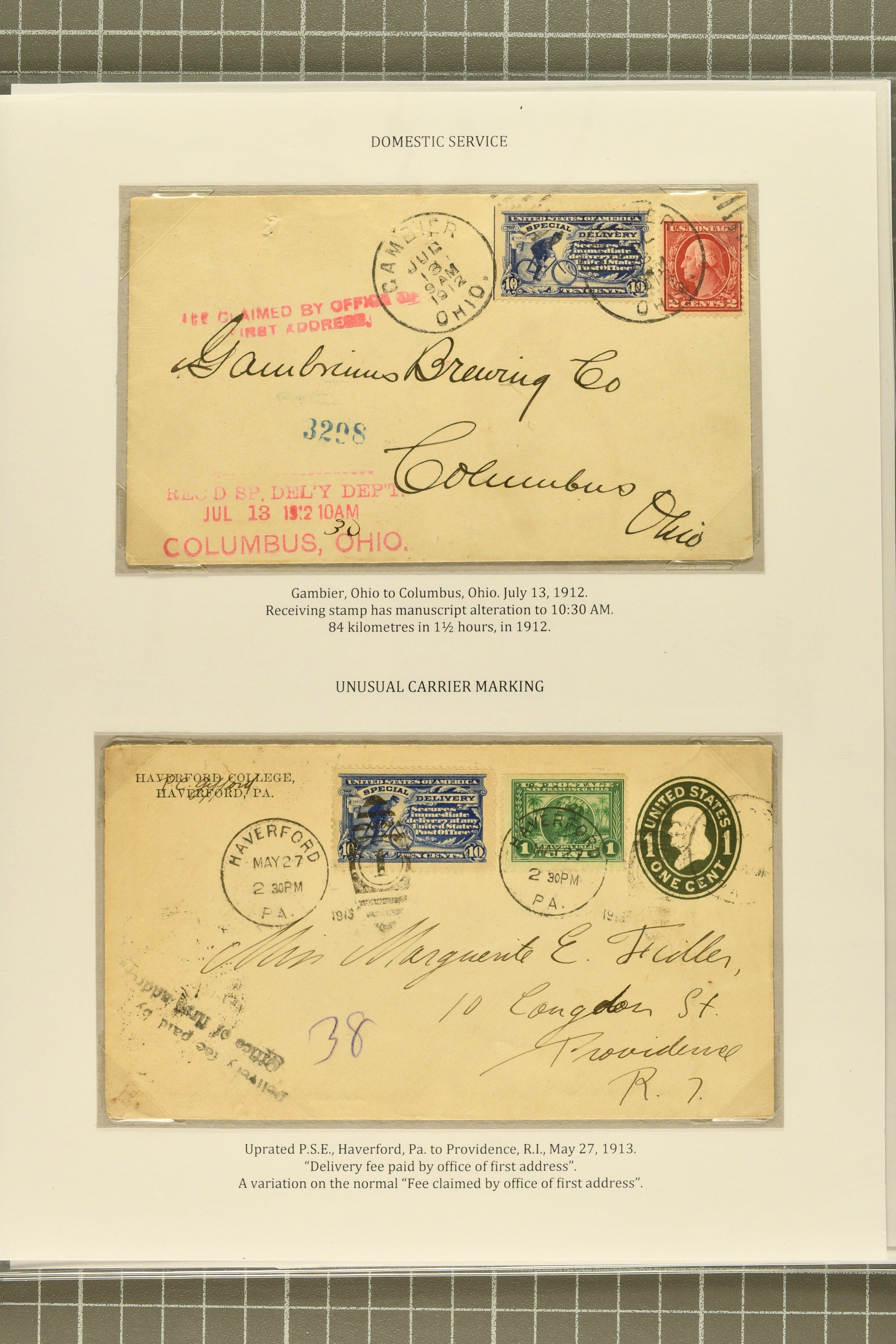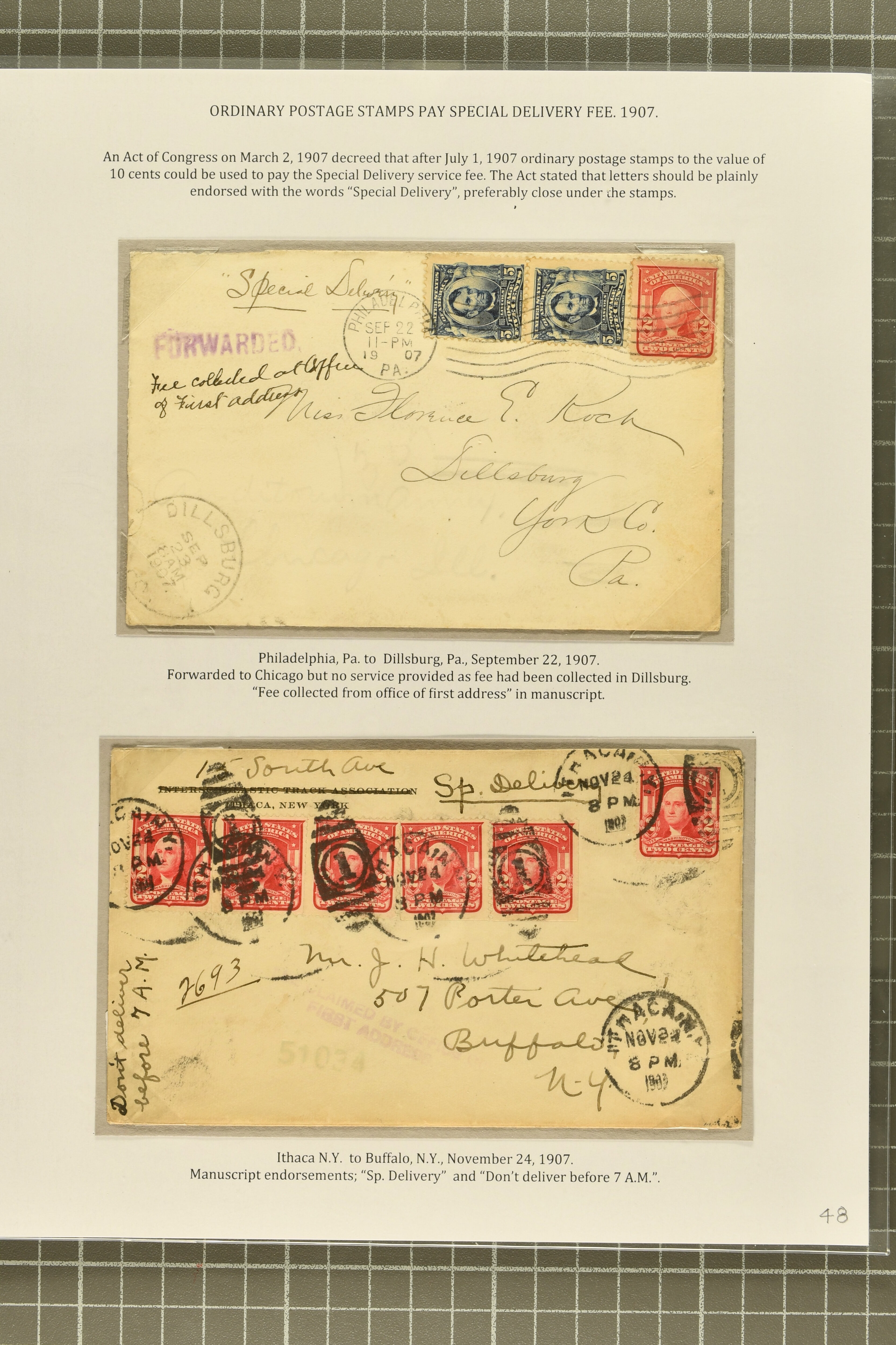 44 cover image1902: 10 c. Ultramarine Issue 1902: 10 c. ultramarine, postal history collection, with nine items, illustrating a range of usages, note foreign origins including a 1903 cover from England to Chicago, 1906 cover front from Erlangen, Bavaria to Austin, Texas, and 1908 cover from Mexico City to New York, with forwarding within the city provided free of charge, instructional markings including "Returned by messenger / as undeliverable" and "Fee paid at city of first address", examples on postal card and unusual usage on picture postcard, 1907 and 1908 examples to Boston with "clock" receiver strikes, with two additional covers, both sent within 1907, without Special Delivery frankings but showing the fee paid with regular issue postage stamps, some flaws commensurate with commercial usage, overall fresh and fine. (Image 1) (Image 2) (Image 3) (Image 4) (Image 5) (Image 6) (Image 7)