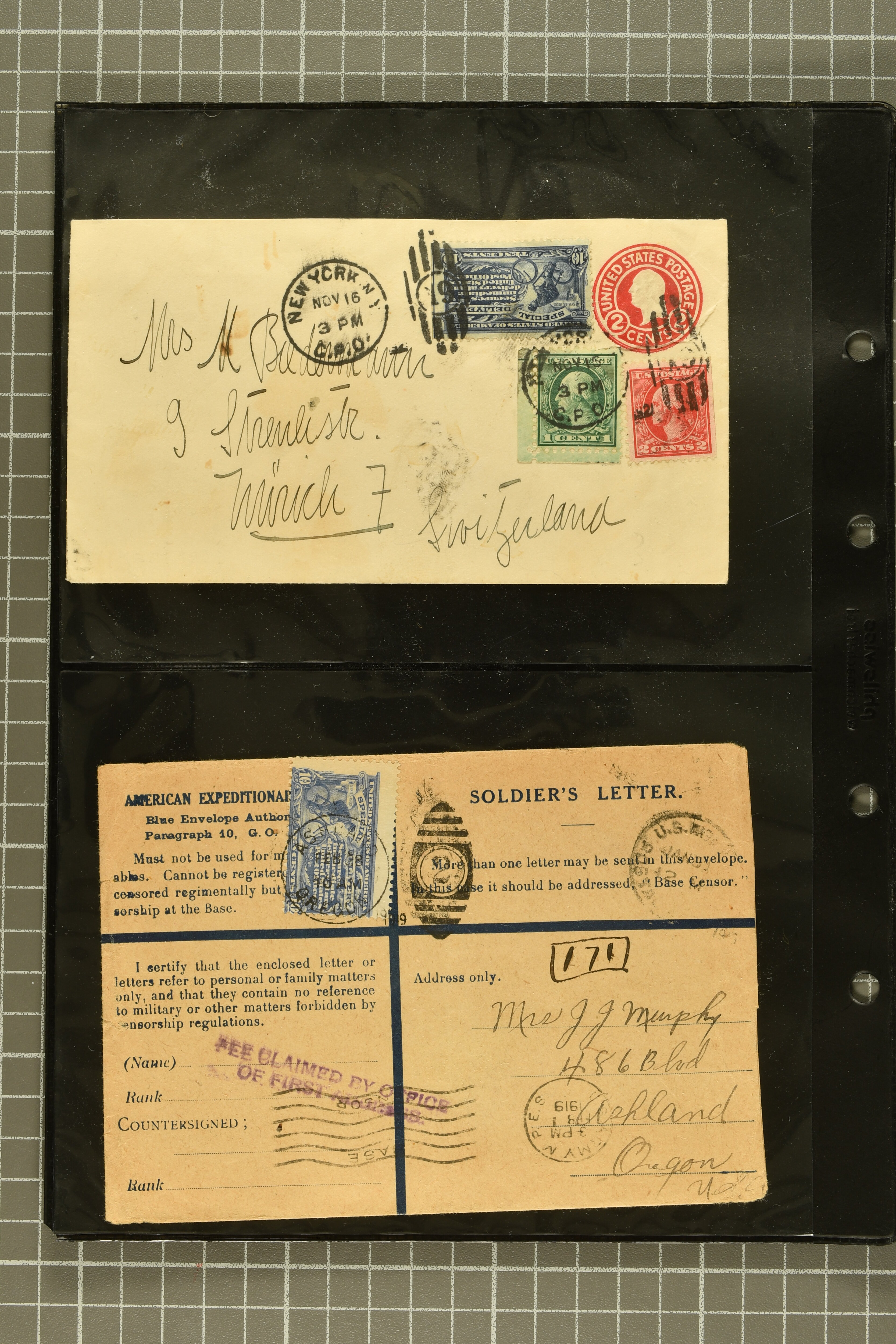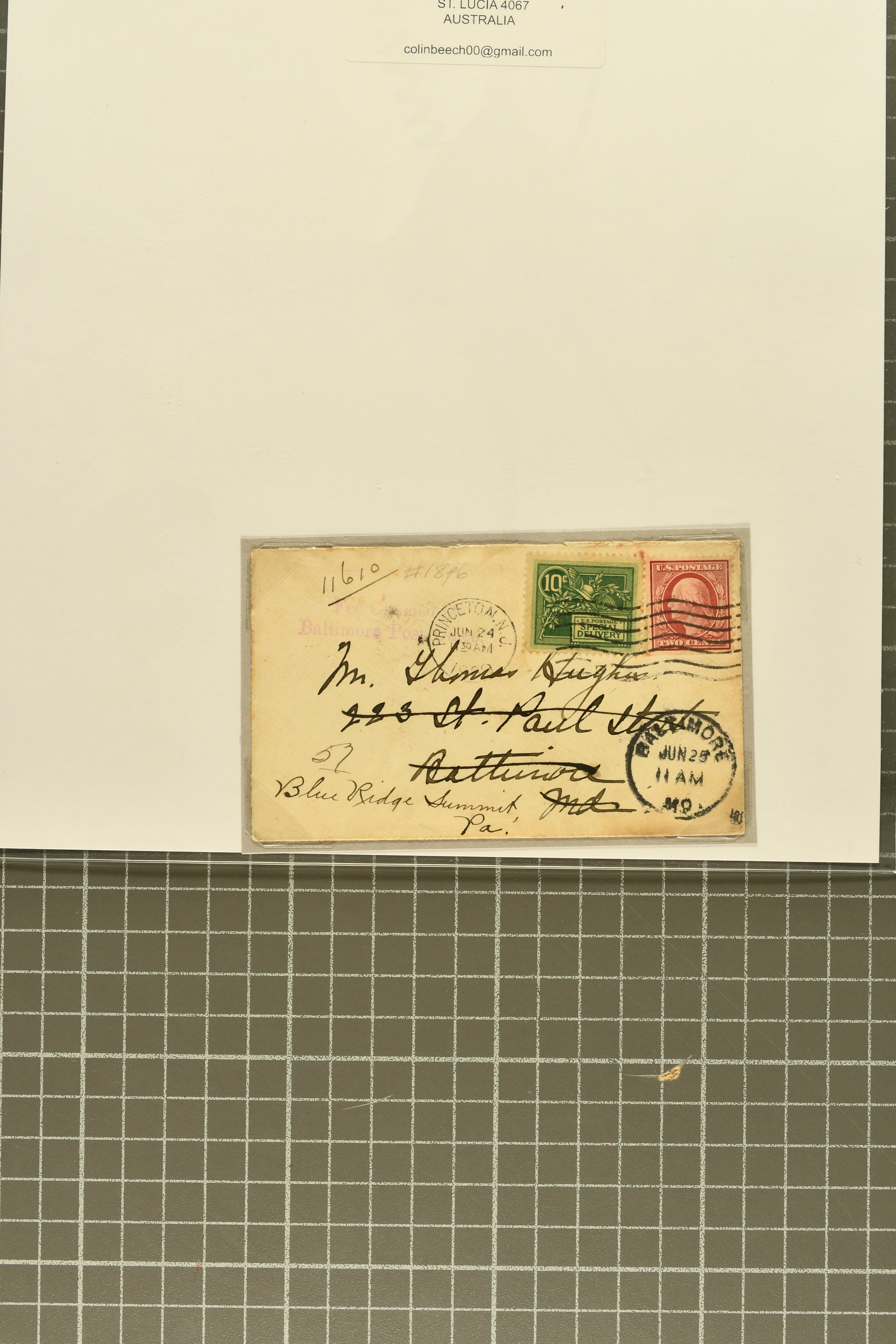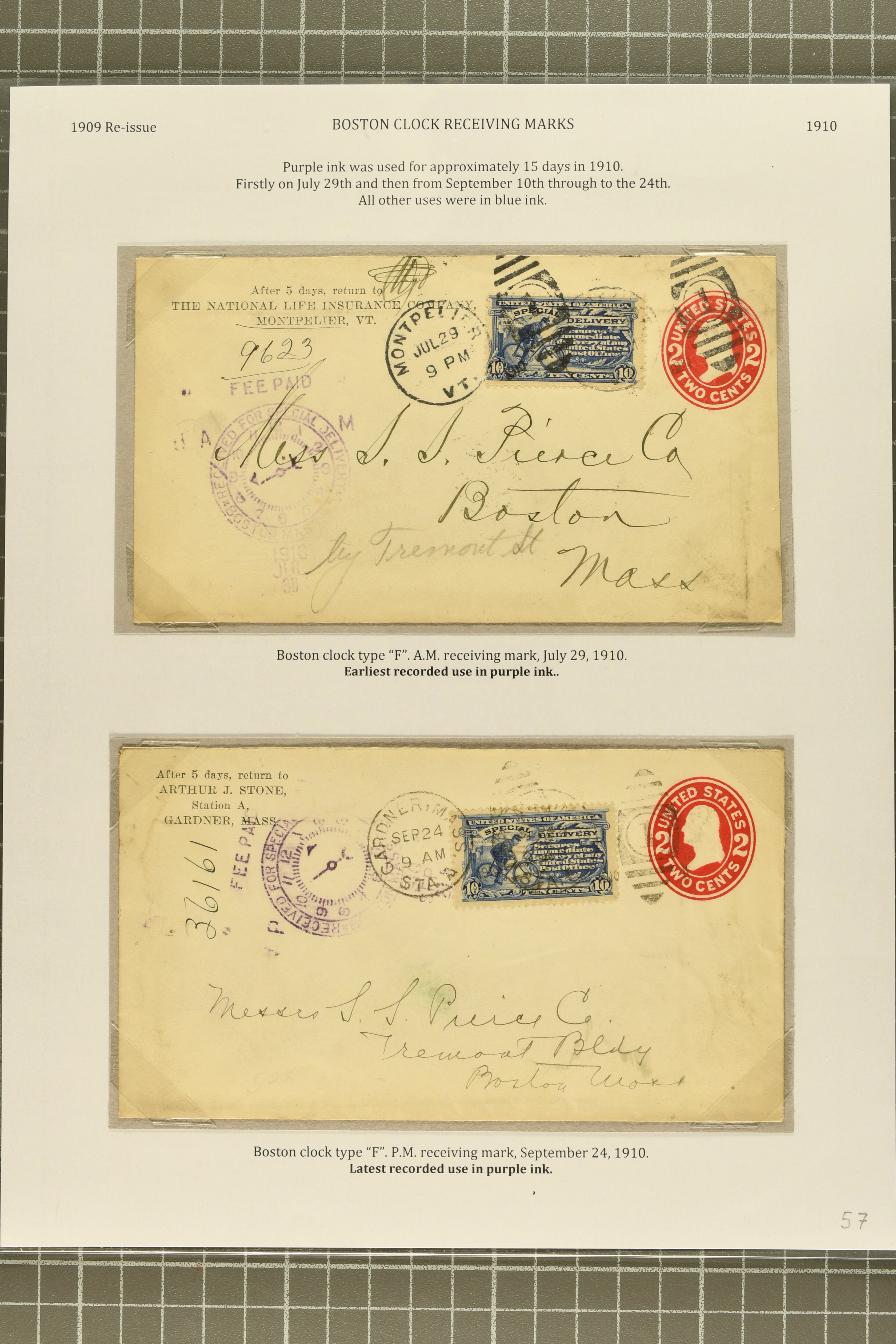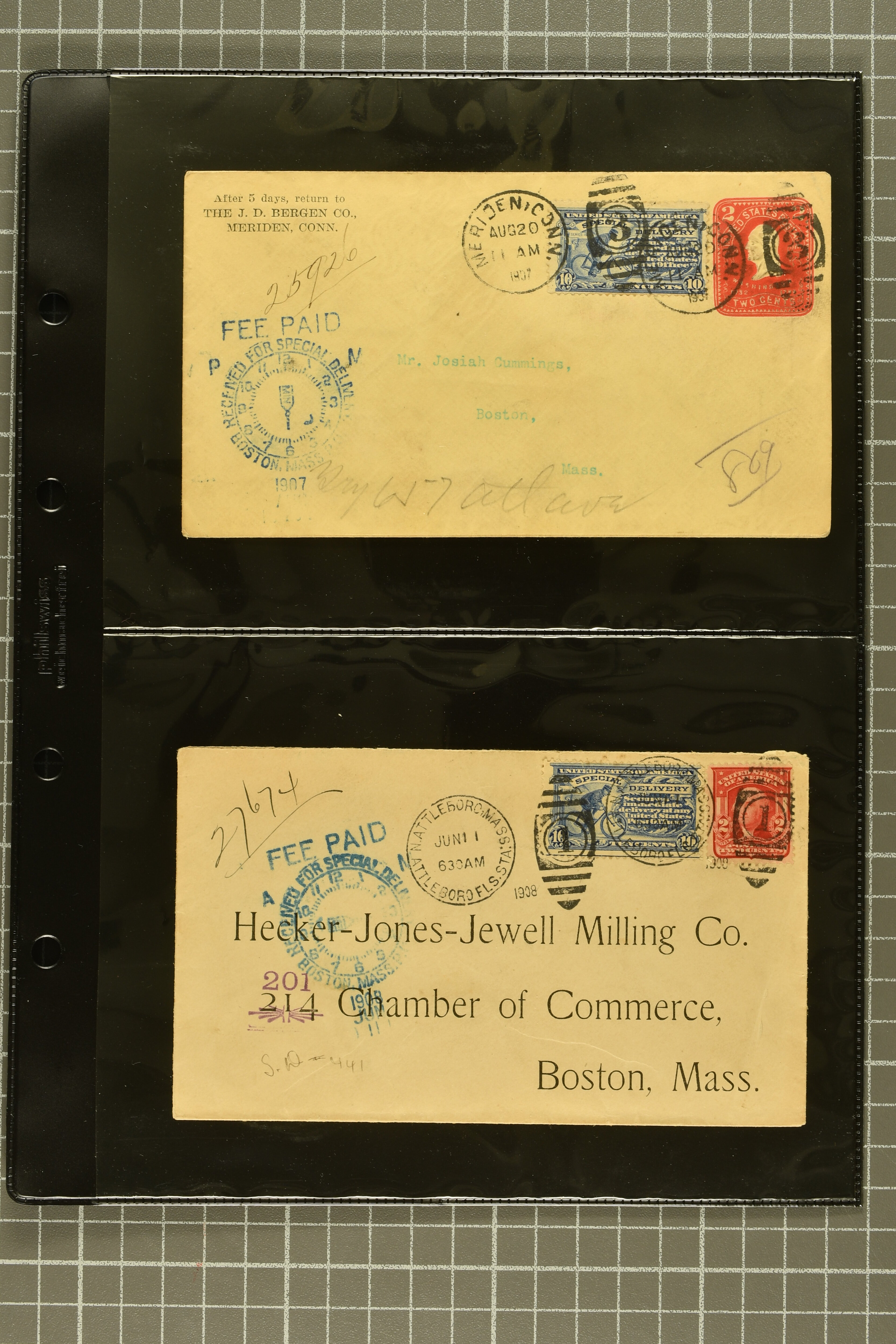 44 cover image1902: 10 c. Ultramarine Issue 1902: 10 c. ultramarine, postal history collection, with nine items, illustrating a range of usages, note foreign origins including a 1903 cover from England to Chicago, 1906 cover front from Erlangen, Bavaria to Austin, Texas, and 1908 cover from Mexico City to New York, with forwarding within the city provided free of charge, instructional markings including "Returned by messenger / as undeliverable" and "Fee paid at city of first address", examples on postal card and unusual usage on picture postcard, 1907 and 1908 examples to Boston with "clock" receiver strikes, with two additional covers, both sent within 1907, without Special Delivery frankings but showing the fee paid with regular issue postage stamps, some flaws commensurate with commercial usage, overall fresh and fine. (Image 1) (Image 2) (Image 3) (Image 4) (Image 5) (Image 6) (Image 7)