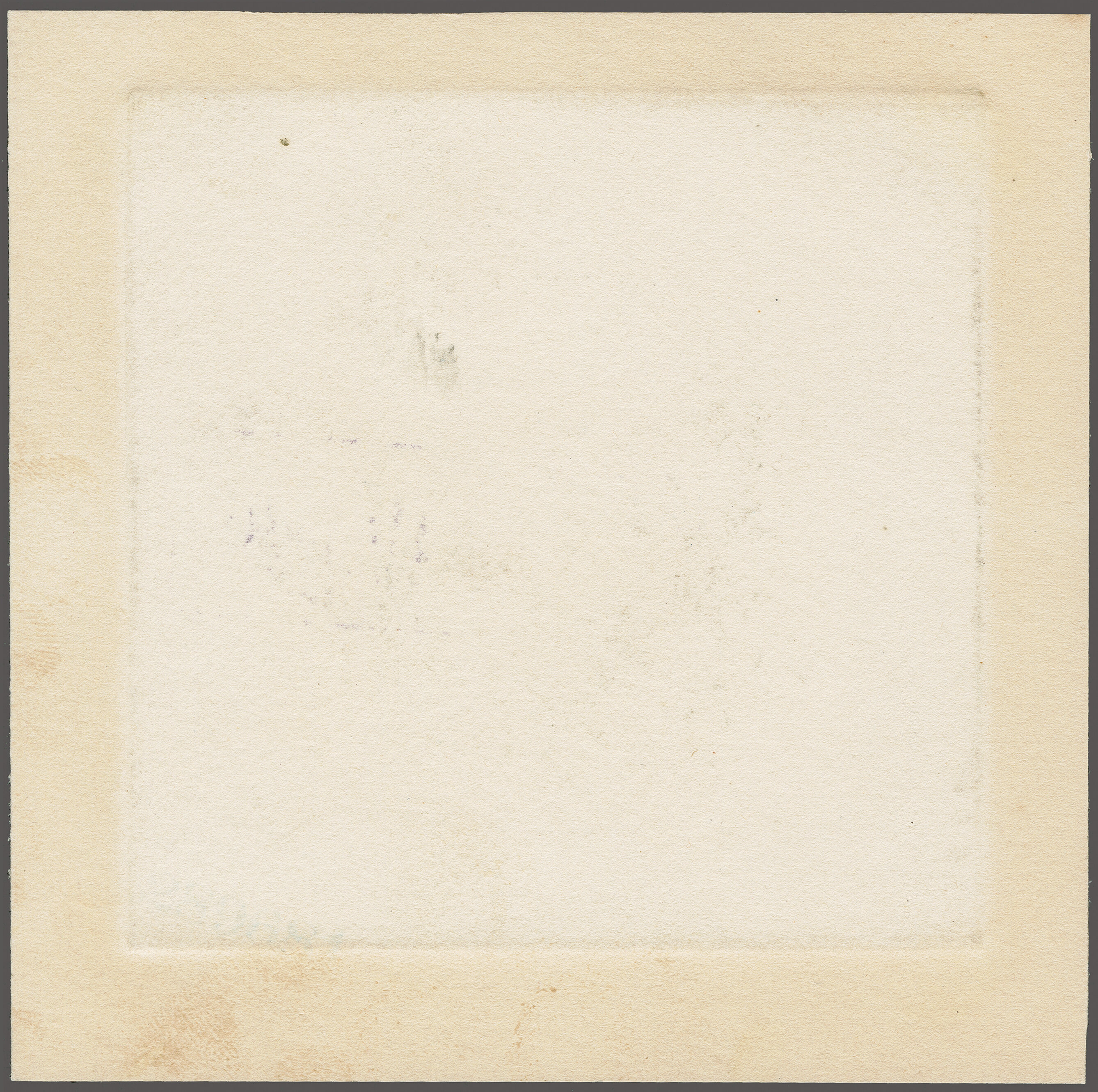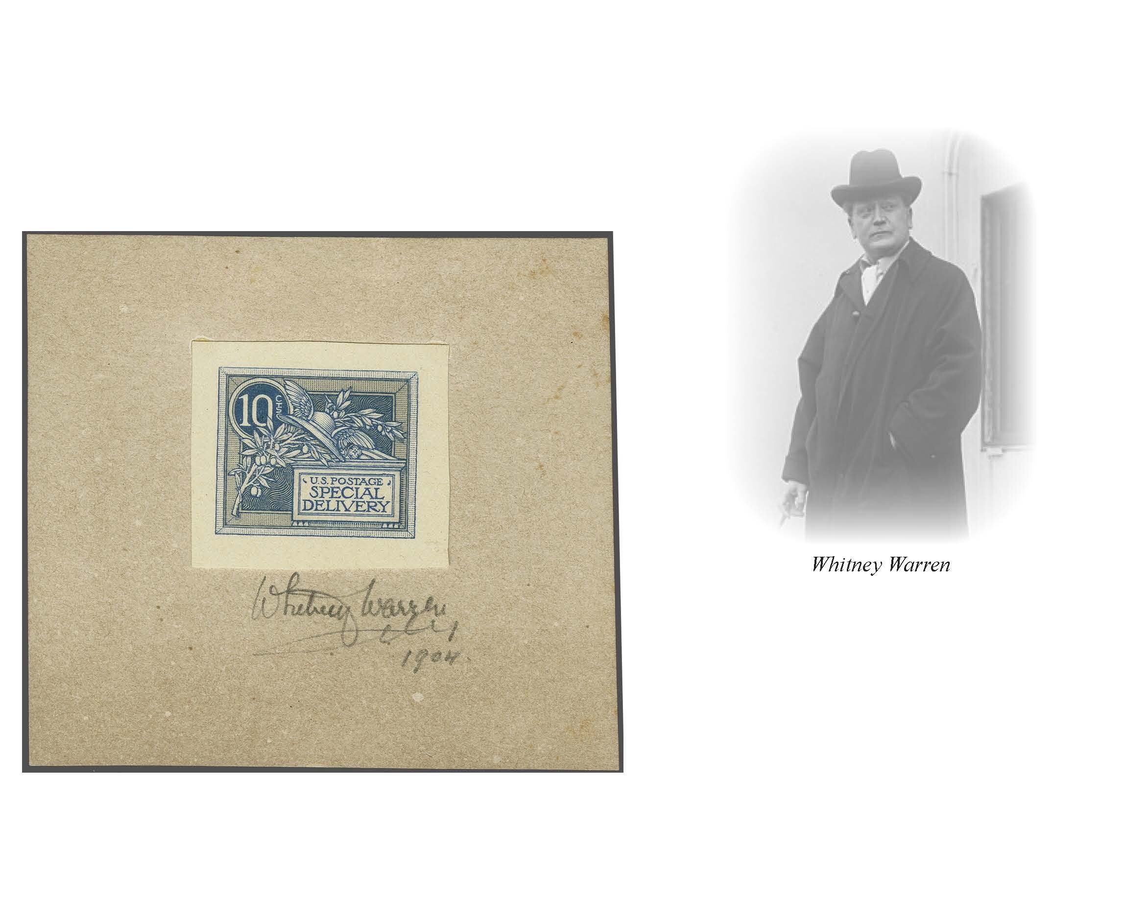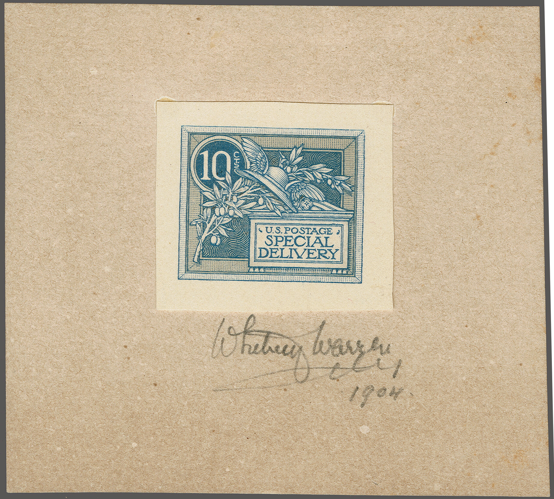 45 (*) image1908: 10 c. Green - the "Merry Widow" Issue 1908: 10 c. dusky blue Woodblock essay, showing the frameline border and greenish-blue background, approximately 33 x 30mm, mounted on larger card, signed "Whitney Warren / 1904" below, a remarkably fresh and most attractive essay, the earliest recorded designer submission, very fine. Provenance: Collection Markovits, Schuyler Rumsey Philatelic Auctions, June 1, 2016, lot 1105. (Image 1) (Image 2) (Image 3)
