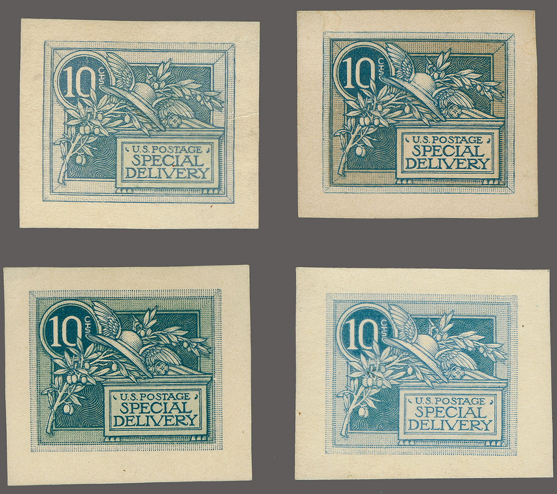 46 (*) image1908: 10 c. Green - the "Merry Widow" Issue 1908: 10 c. woodcut essays, group of four, all on yellowish card, with two early examples displaying a frameline enclosing the entire design, and two later examples with the outer frameline removed, in dim dark green-blue and dim dusky blue-green, a few small imperfections, but an otherwise very fine and scarce group. Cert. Philatelic Foundation (2006, for Type II). (Image 1) (Image 2) (Image 3)