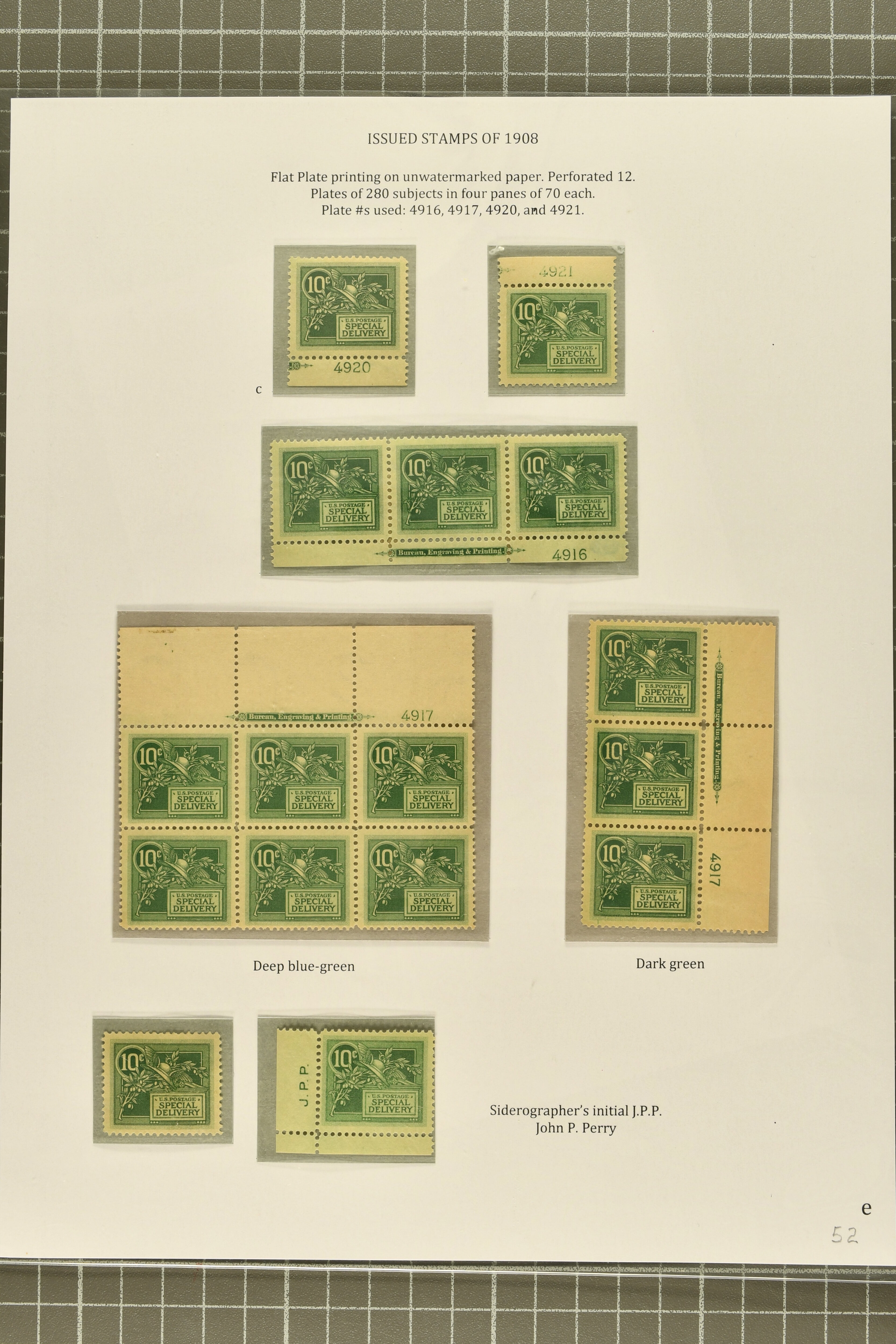 50 image1908: 10 c. Green - the "Merry Widow" Issue 1908: 10 c. green, group of issued stamps, several with full or partial plate inscriptions, with plate number 4920 and 4921 singles, plate 4916 and 4917 strips of three and plate 4917 block of six with both plate number and "Bureau Engraving & Printing" imprints, lower left corner single with sideographer's John P. Perry's initials printed in selvedge, and single issued stamp, all unmounted save for the 4916 strip which has some hinge reinforcements, and the block of six which is lightly hinged, overall fresh and very fine. Cert Philatelic Foundation (2014) for Plate 4920 single. (Image 1)