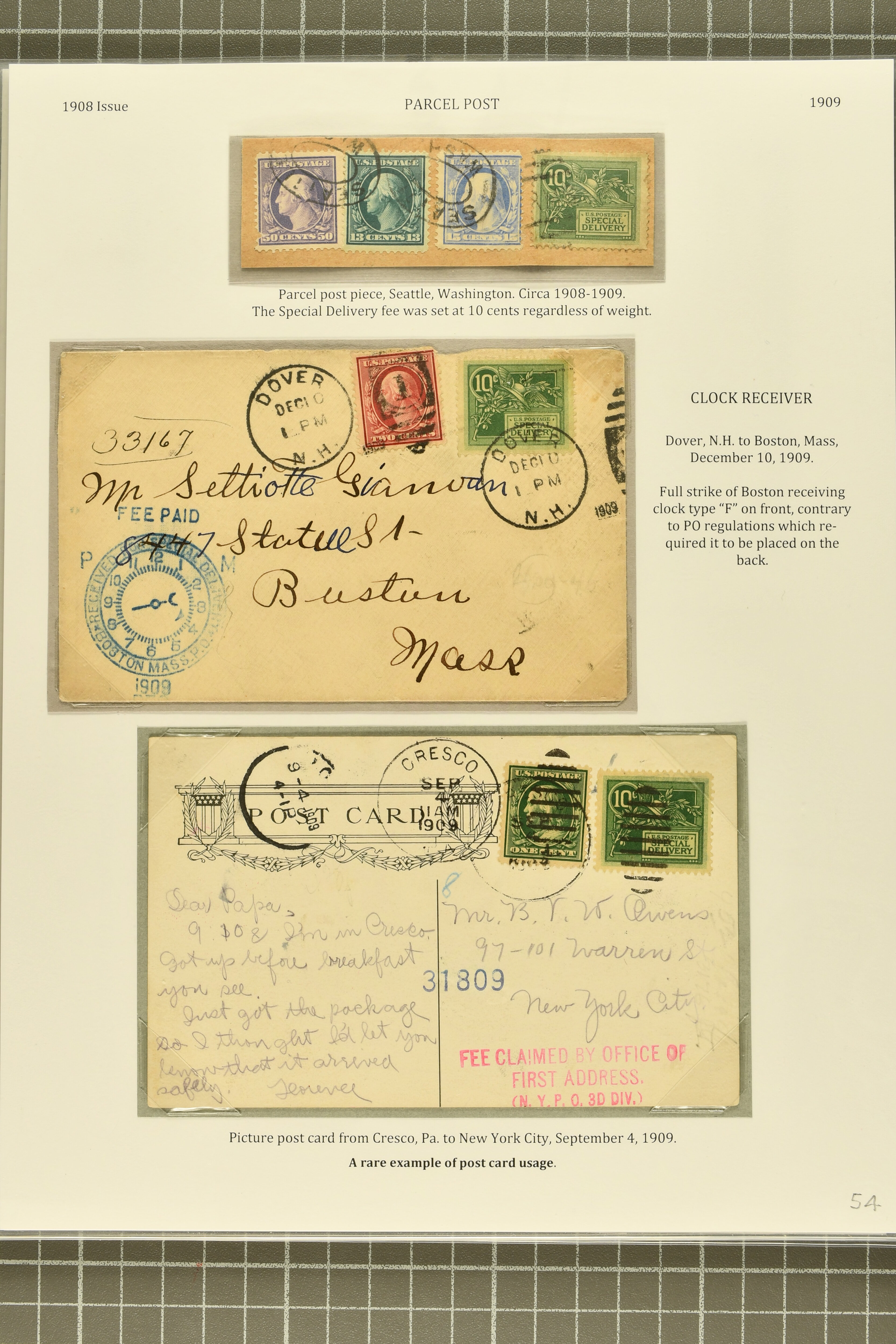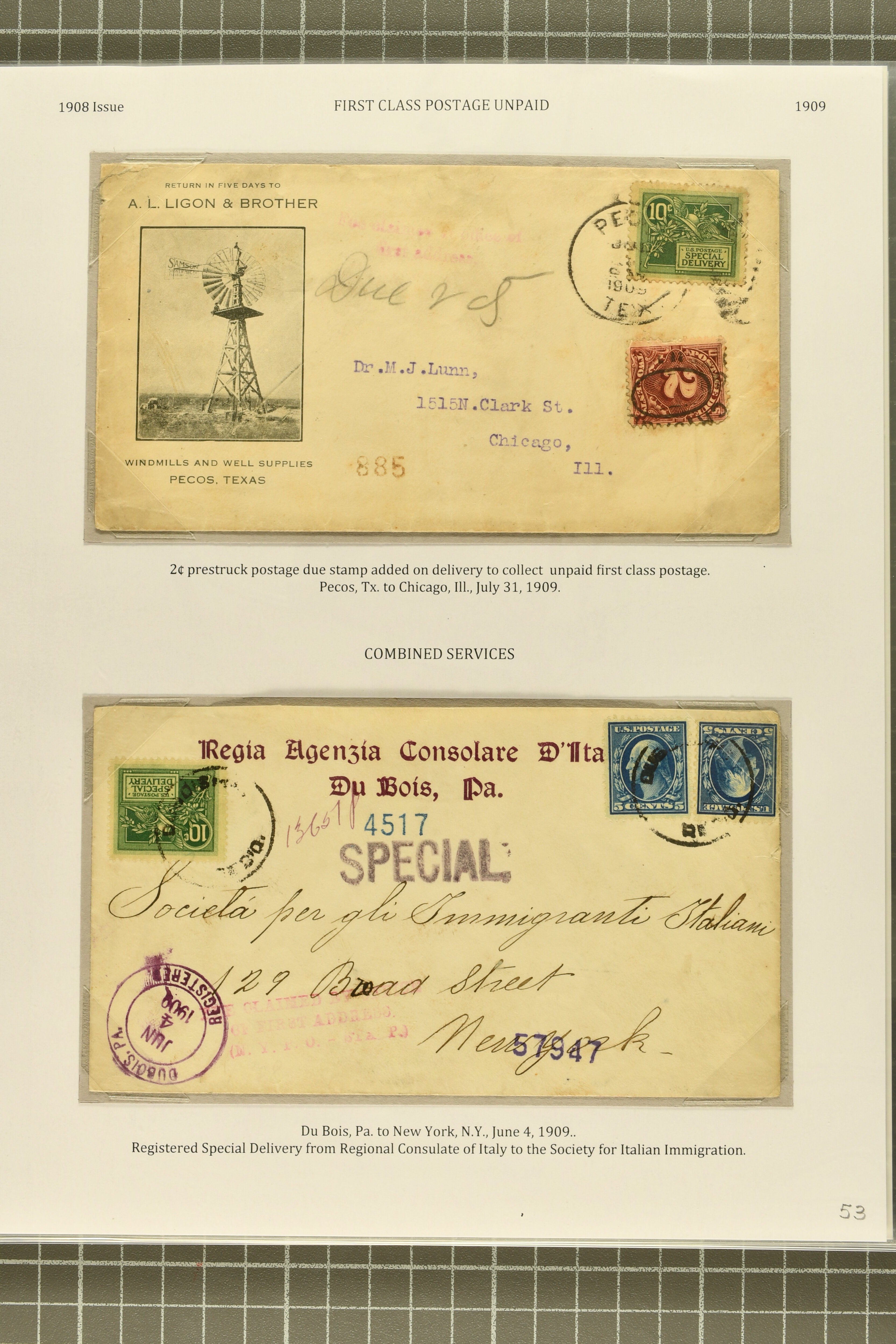 51 cover image1908: 10 c. Green - the "Merry Widow" Issue 1908: 10 c. green, postal history collection, nine covers and one piece, with two examples of unpaid first class postage, one on windmill & well supplies advertising cover, franked in combination with 2c. postage due, unusual as such, another a scarce registered special delivery usage from the Regional Consulate of Italy in Pennsylvania (ex Markovits); 1909 New Hampshire to Boston with choice strike of Boston clock-style "F" on front, contrary to regulations; 1909 use on picture postcard, unusual and scarce; 1909 from New Jersey to London, forwarded to Germany, and 1914 usage on incoming cover from Canada to Buffalo, both ex Markovits; three domestic usages struck with "Fee Claimed By Office of / First Address,"; and circa 1909 usage with 13 c., 15 c. and 50 c. Washington on parcel piece, some small faults, a fine useful group with several difficult covers. (Image 1) (Image 2) (Image 3) (Image 4) (Image 5)