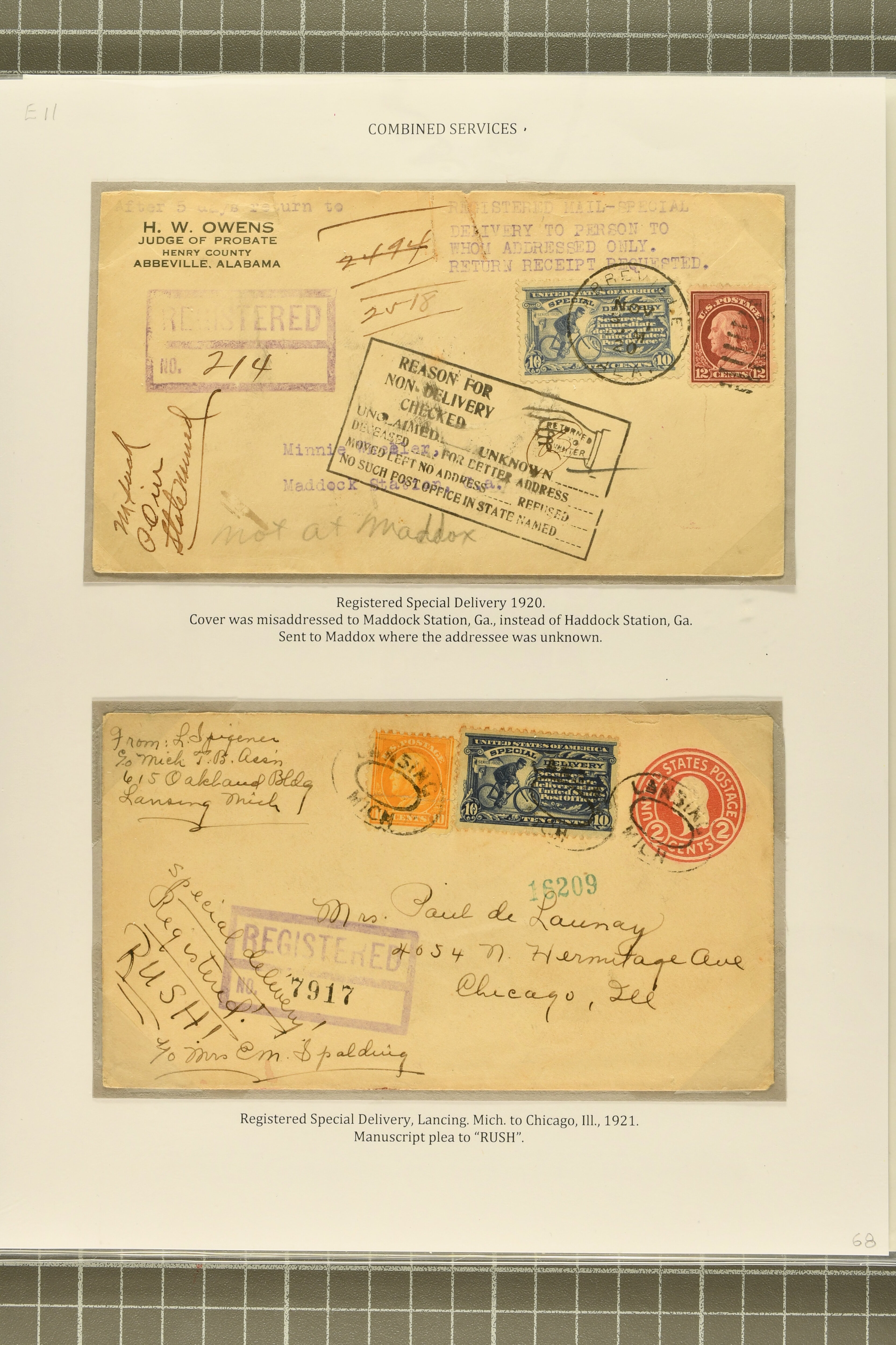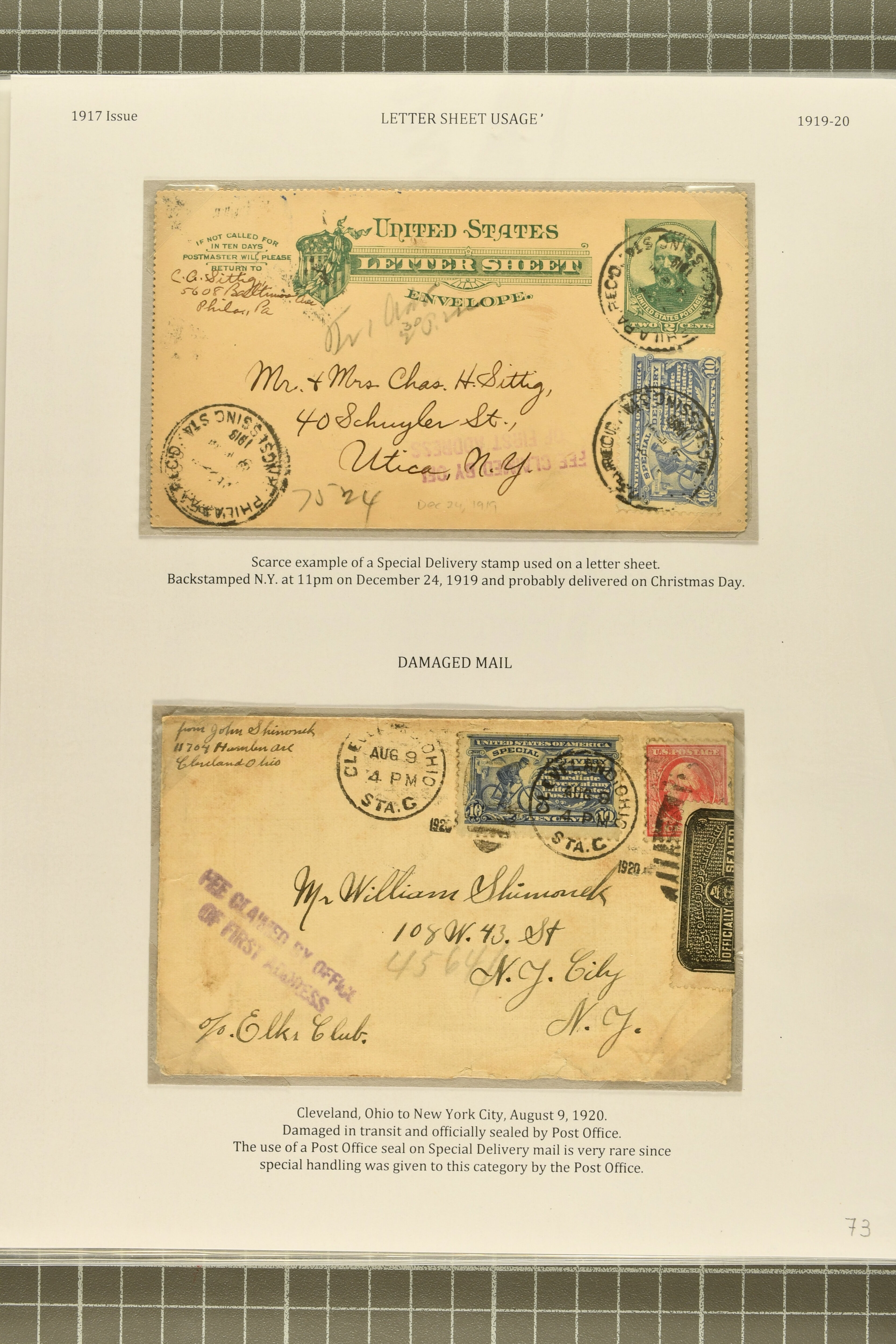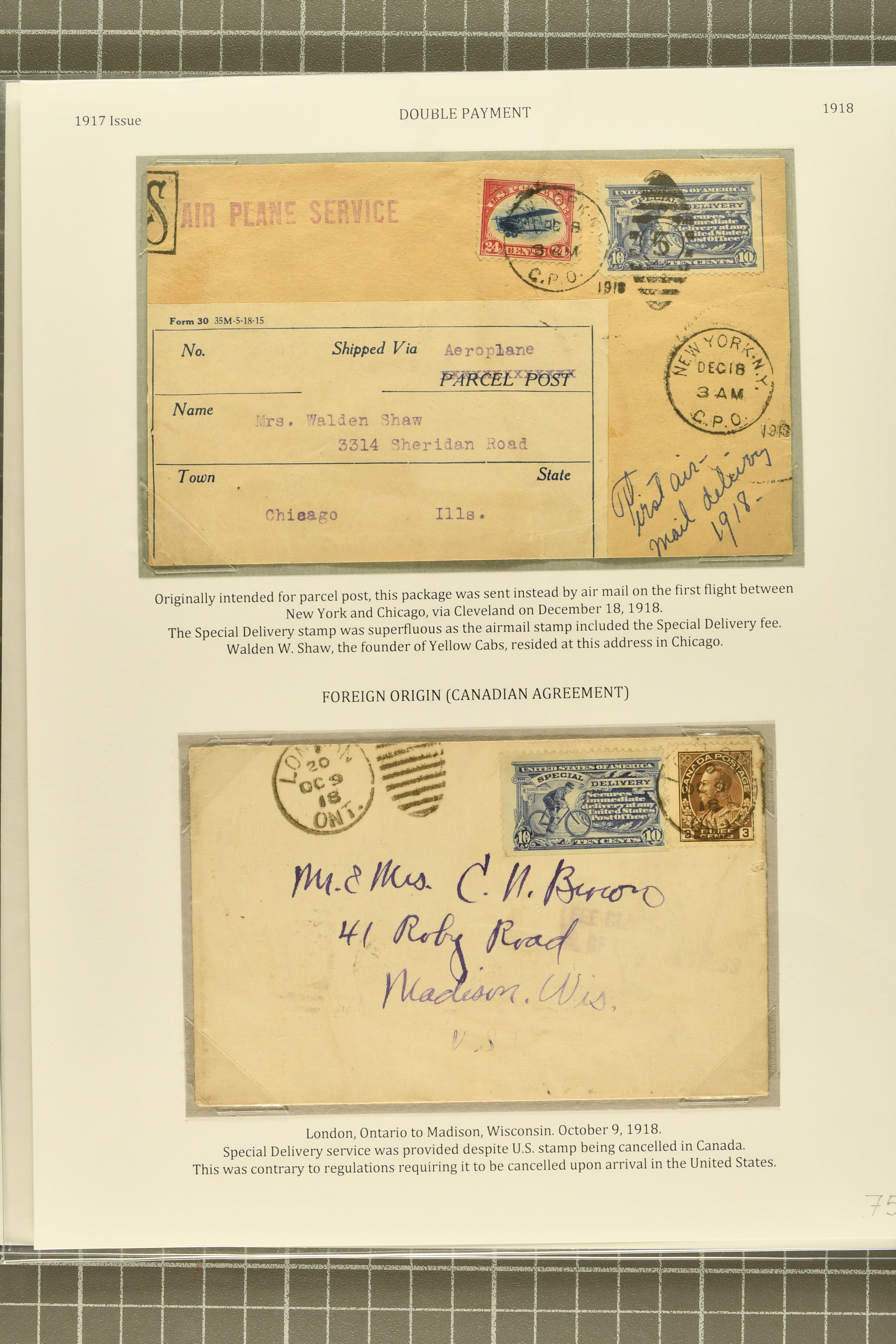 56 cover image1917, 10 c. Ultramarine Issue 1917: 10 c. ultramarine, postal history group of ten,a select group, comprising two 1920/21 examples of combined registered special delivery services, one undeliverable and returned to sender; 1918 double-payment usage on the first flight from New York to Chicago via Cleveland, the special delivery fee having already been paid by the 24 c. Air Post; 1918 example affixed to cover from London, Ontario to Madison, Wisconsin, accepted despite the stamp having been cancelled in Canada contrary to regulations; unusual 1919 usage on A.E.F. soldier's cover, affixed in Ashland, Ohio for swift local delivery; 1921 uprated stationery cover to Zurich, no service provided as reciprocal special delivery with Switzerland was not available until 1926; scarce 1919 example used on a 2 c. Grant letter sheet, likely delivered Christmas Day; 1920 officially sealed cover damaged in transit; Reserve Bank of New York perfin used on registered bank tag; and 1919 use on parcel post piece, paying a total of $1.59 postage + 10c Special Delivery, some small faults, but a desirable group, highlighting a diversity of usages of this issue, fine-very fine. (Image 1) (Image 2) (Image 3) (Image 4) (Image 5)