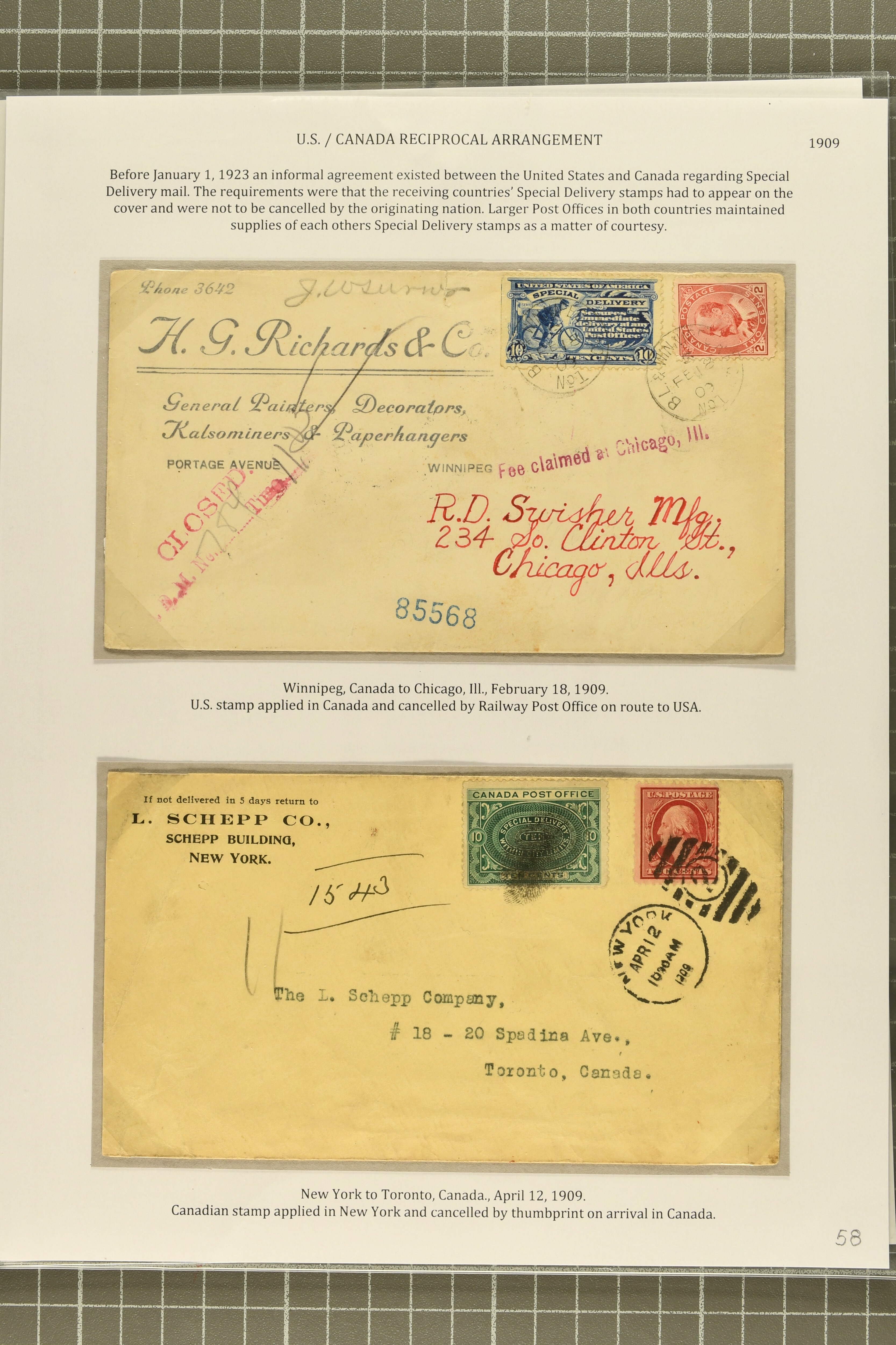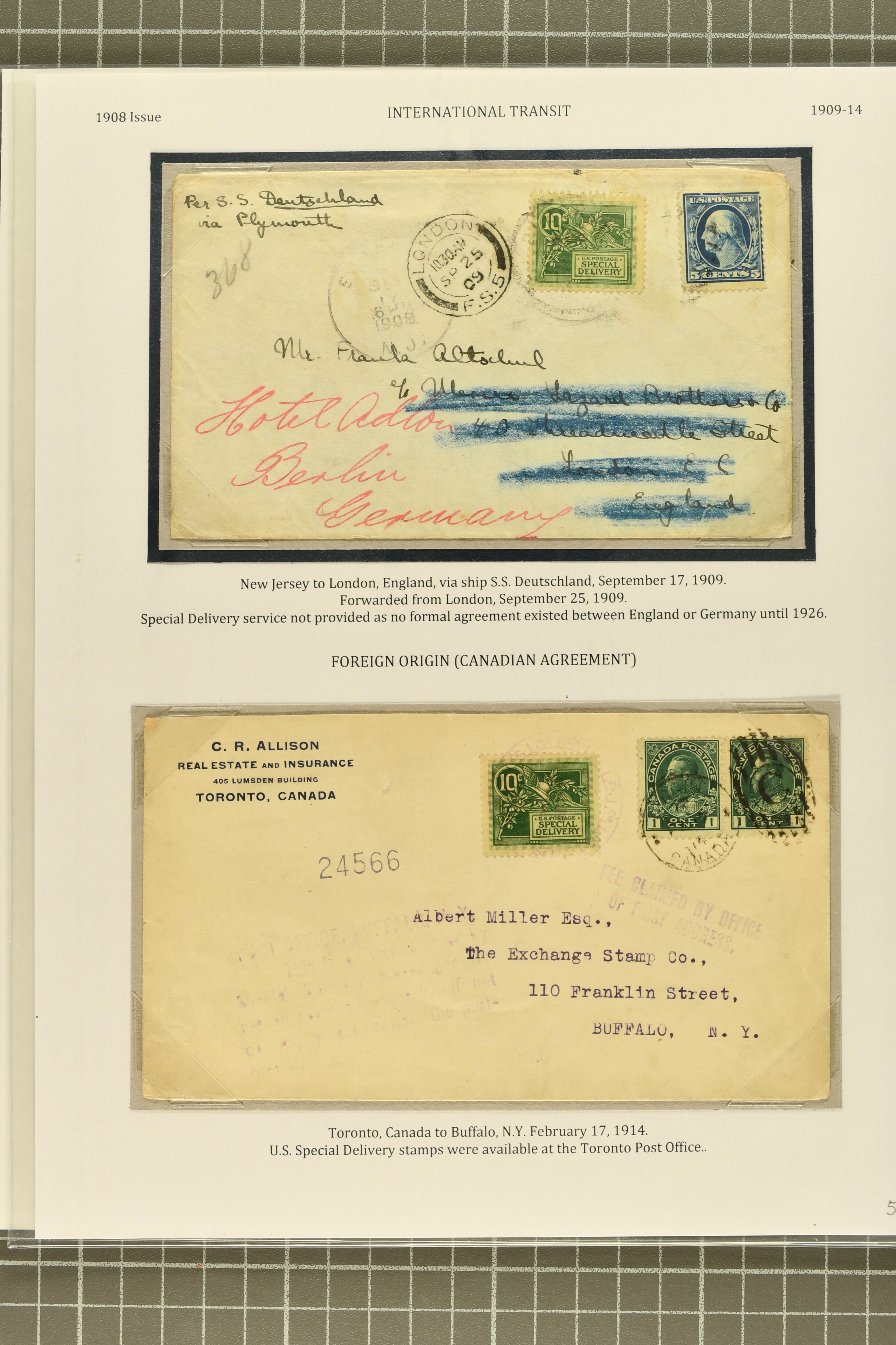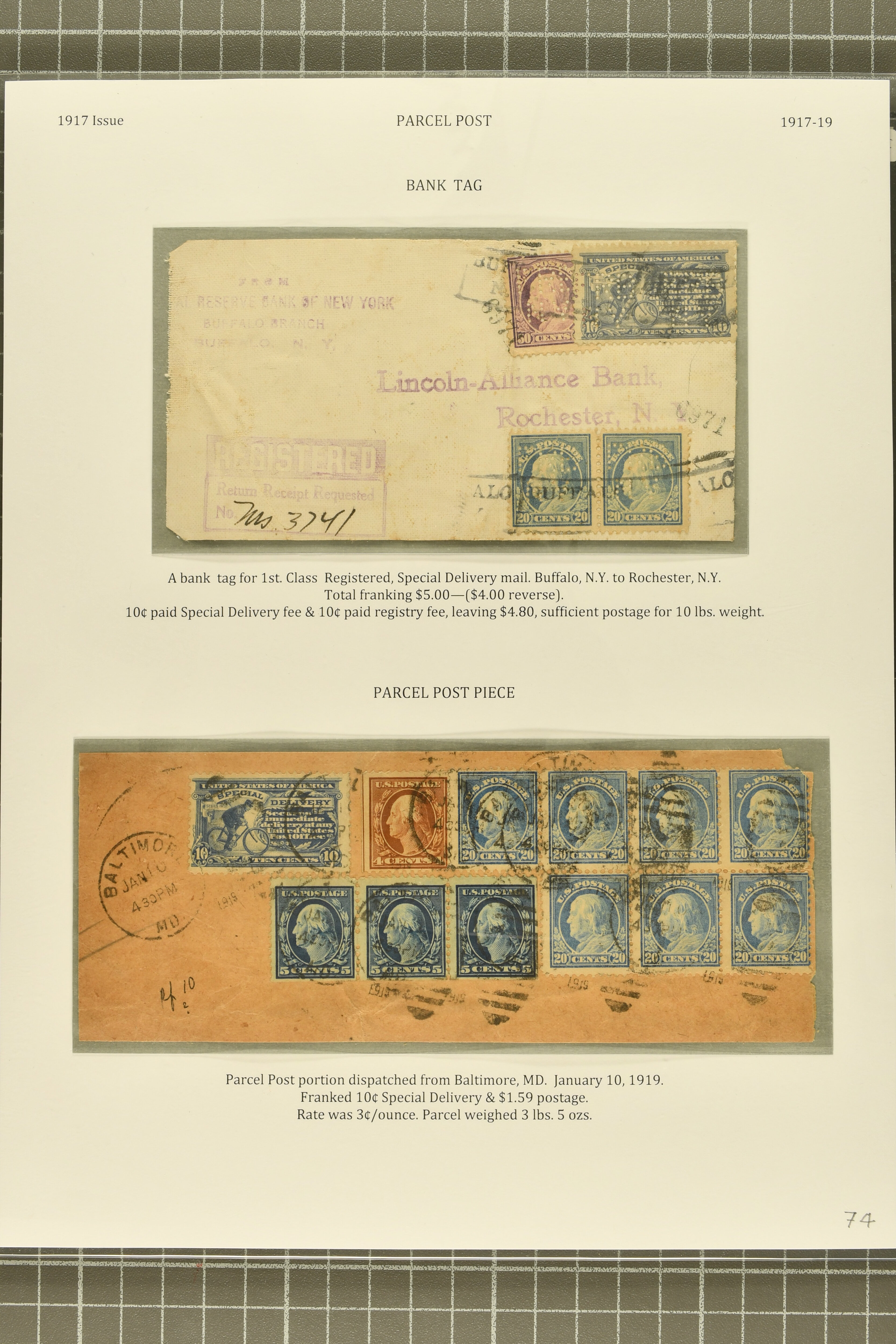 56 cover image1917, 10 c. Ultramarine Issue 1917: 10 c. ultramarine, postal history group of ten,a select group, comprising two 1920/21 examples of combined registered special delivery services, one undeliverable and returned to sender; 1918 double-payment usage on the first flight from New York to Chicago via Cleveland, the special delivery fee having already been paid by the 24 c. Air Post; 1918 example affixed to cover from London, Ontario to Madison, Wisconsin, accepted despite the stamp having been cancelled in Canada contrary to regulations; unusual 1919 usage on A.E.F. soldier's cover, affixed in Ashland, Ohio for swift local delivery; 1921 uprated stationery cover to Zurich, no service provided as reciprocal special delivery with Switzerland was not available until 1926; scarce 1919 example used on a 2 c. Grant letter sheet, likely delivered Christmas Day; 1920 officially sealed cover damaged in transit; Reserve Bank of New York perfin used on registered bank tag; and 1919 use on parcel post piece, paying a total of $1.59 postage + 10c Special Delivery, some small faults, but a desirable group, highlighting a diversity of usages of this issue, fine-very fine. (Image 1) (Image 2) (Image 3) (Image 4) (Image 5)