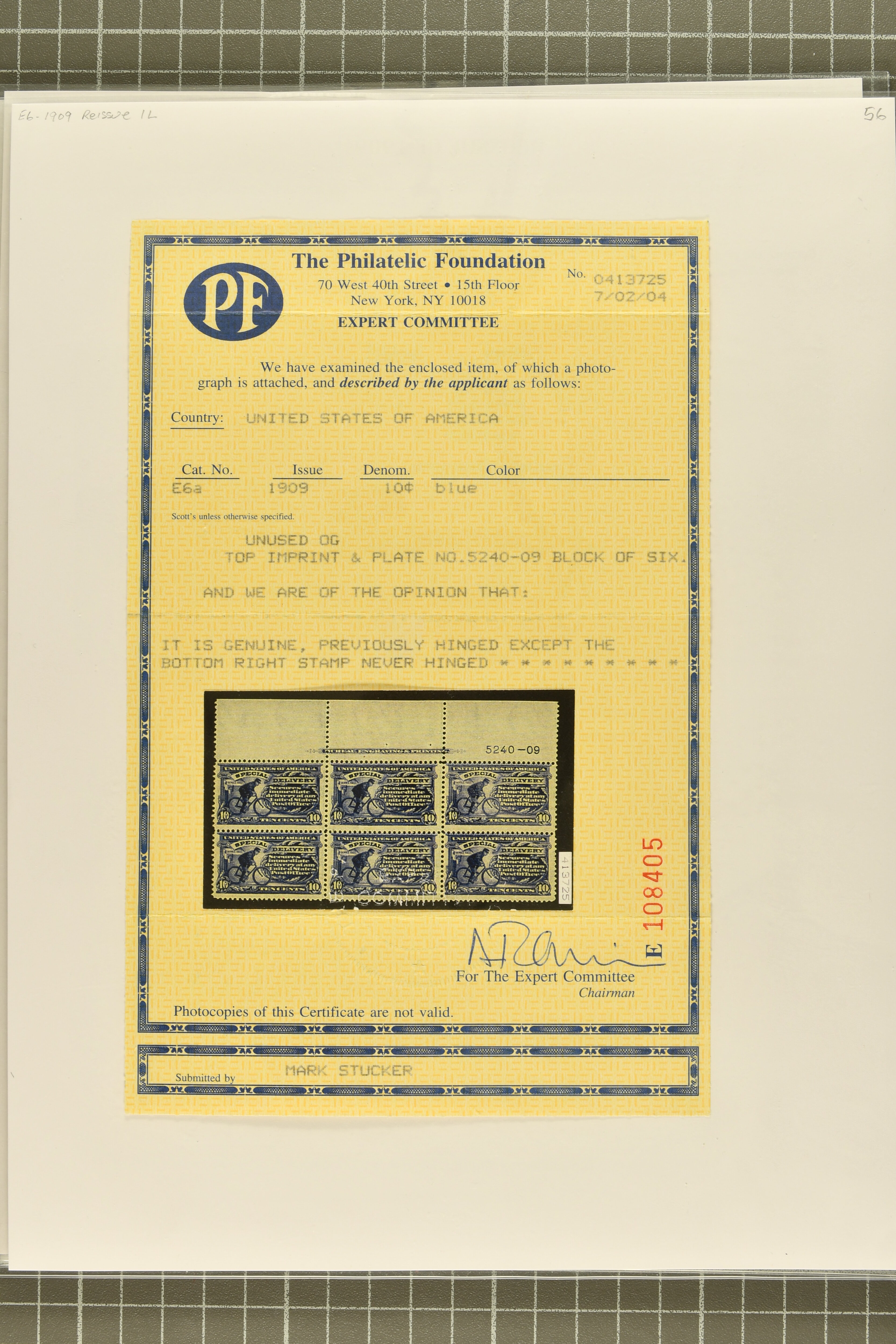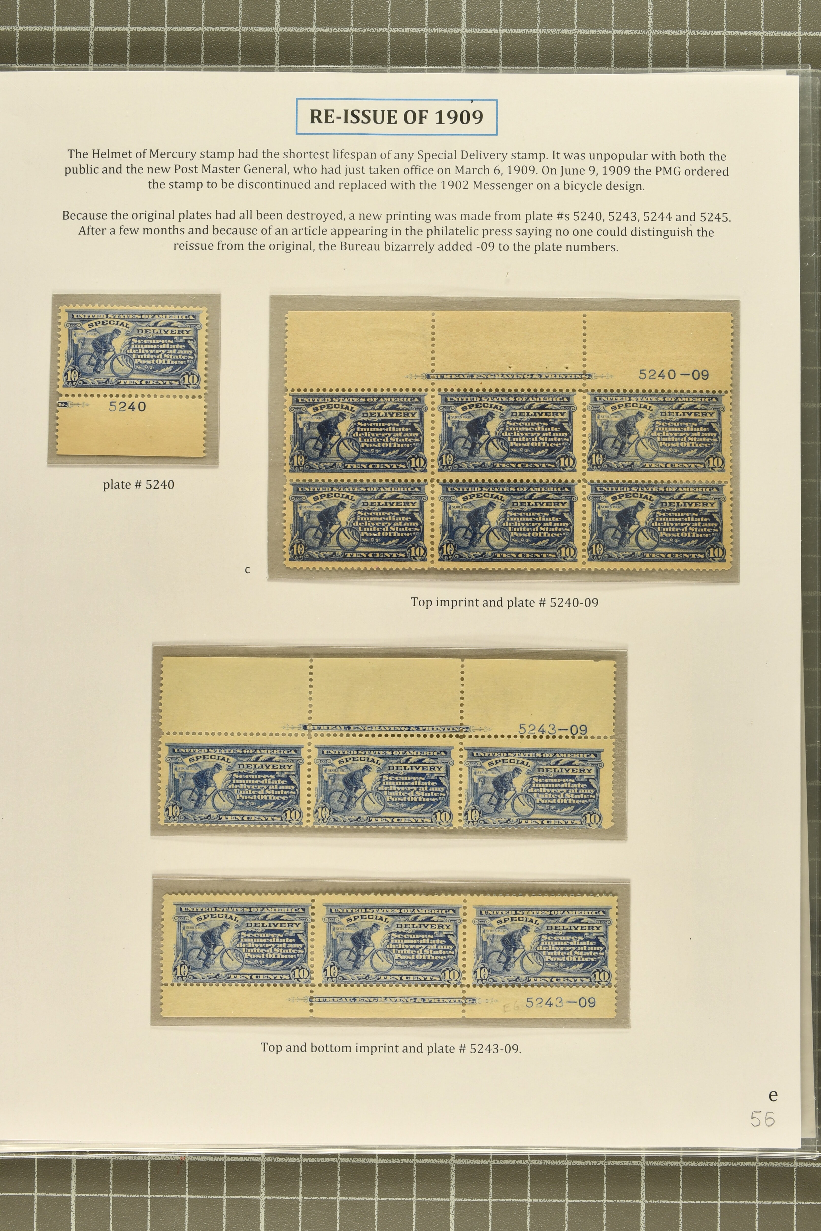 41 **/* image1902: 10 c. Ultramarine Issue 1902: 10 c. ultramarine, 1909 re-issue in blue, stamp and postal history group, with plate number single and multiples comprising plate 5240 single, plate 5240-09 upper margin inscription block of six, and plate 5243-09 top and bottom inscription strips of three, all but the single showing the full "Bureau Engraving & Printing" inscription and plate number, all with large part original gum, and four covers, two 1910 usages showing Boston "clock-type" receivers, showing both the earliest and latest recorded usages in purple ink, and two illustrating the Canada / United States Reciprocal Arrangement, one franked with 10 c. Special Delivery and sent from Winnipeg to Chicago, the second from New York to Toronto, franked with 10c green Canadian Special Delivery issue, a scarce group, overall fresh and fine. Cert. Philatelic Foundation (2004) for block of six. Scott = $6,750+ covers (Image 1) (Image 2) (Image 3) (Image 4)