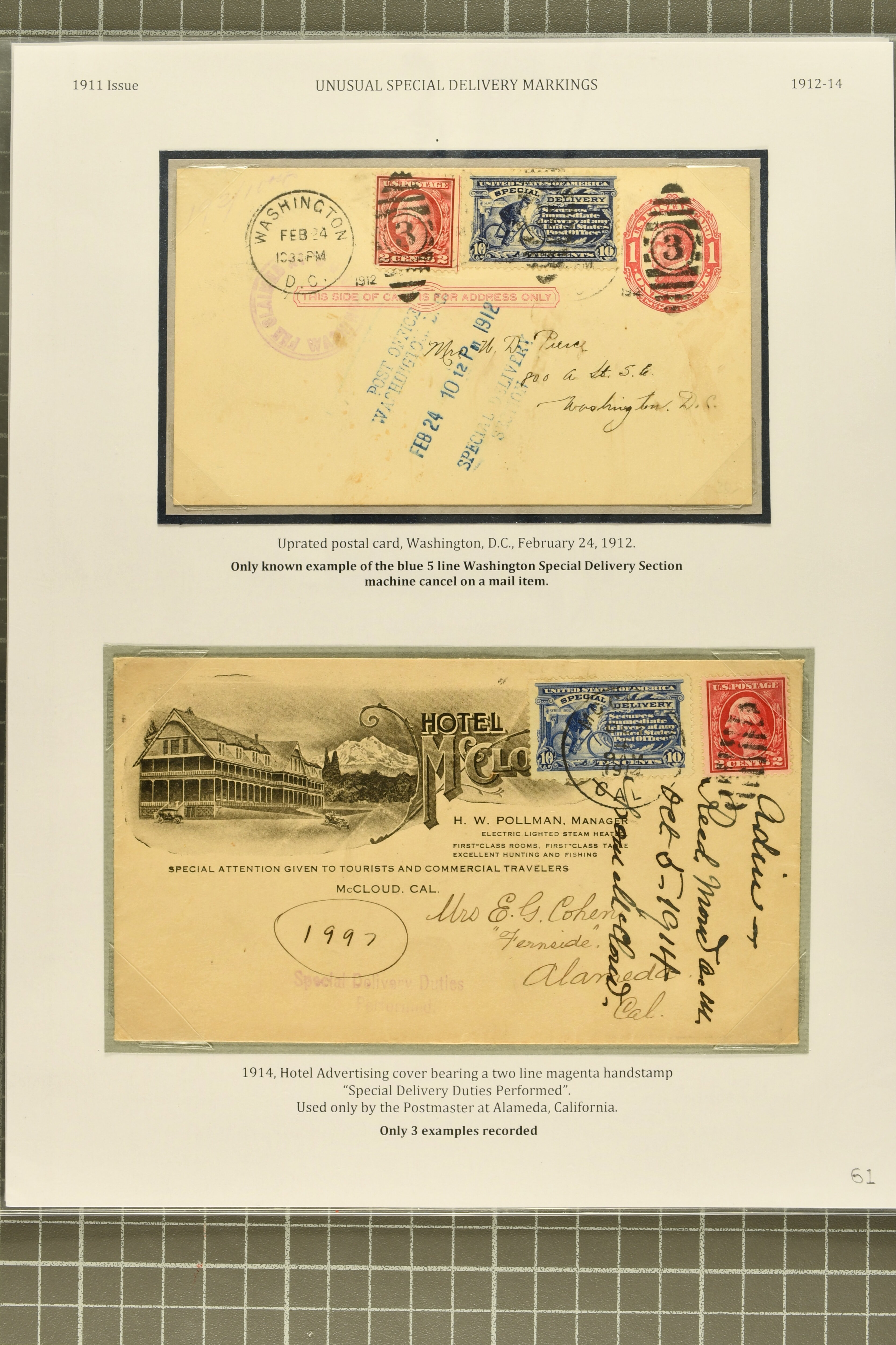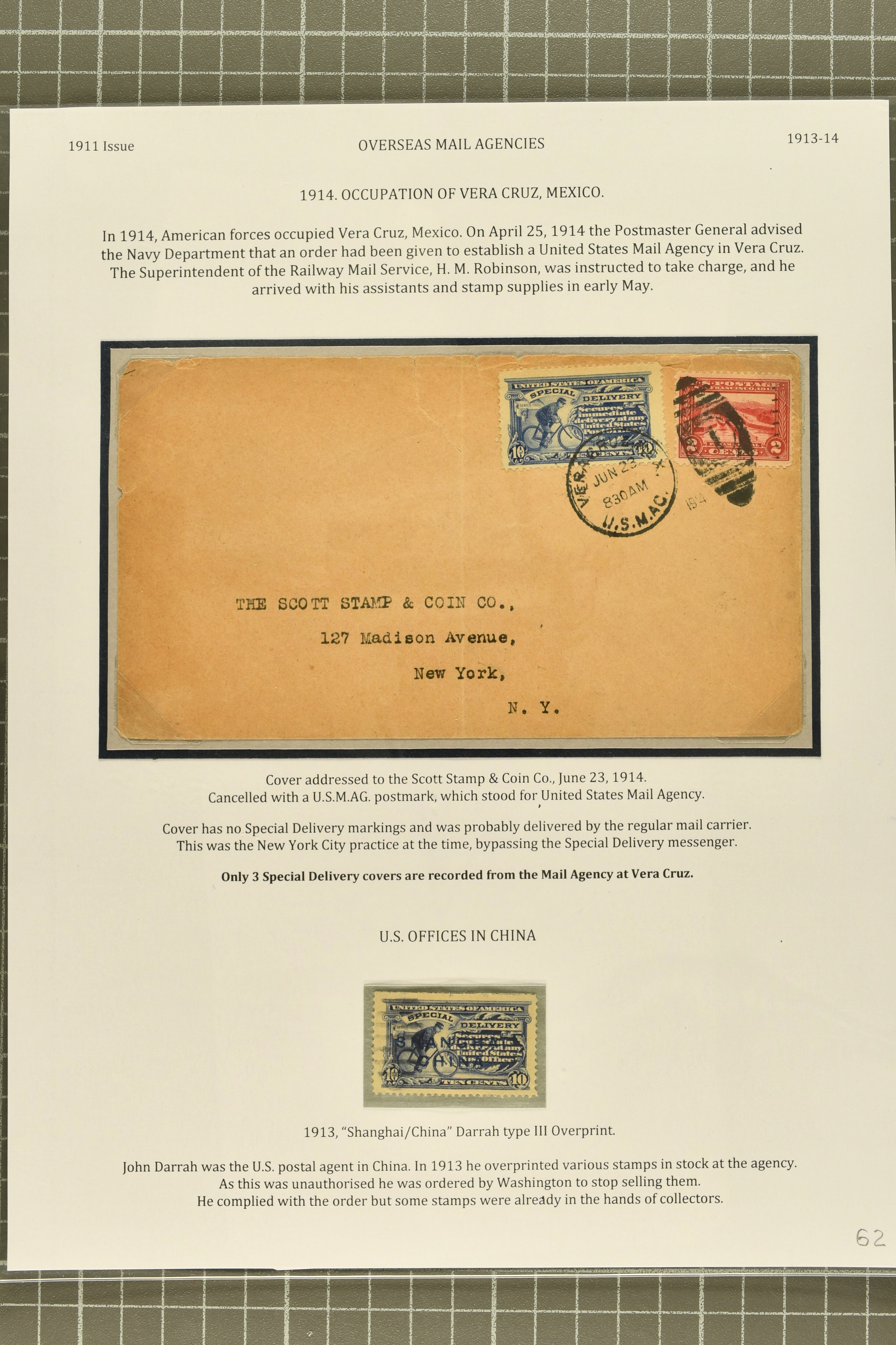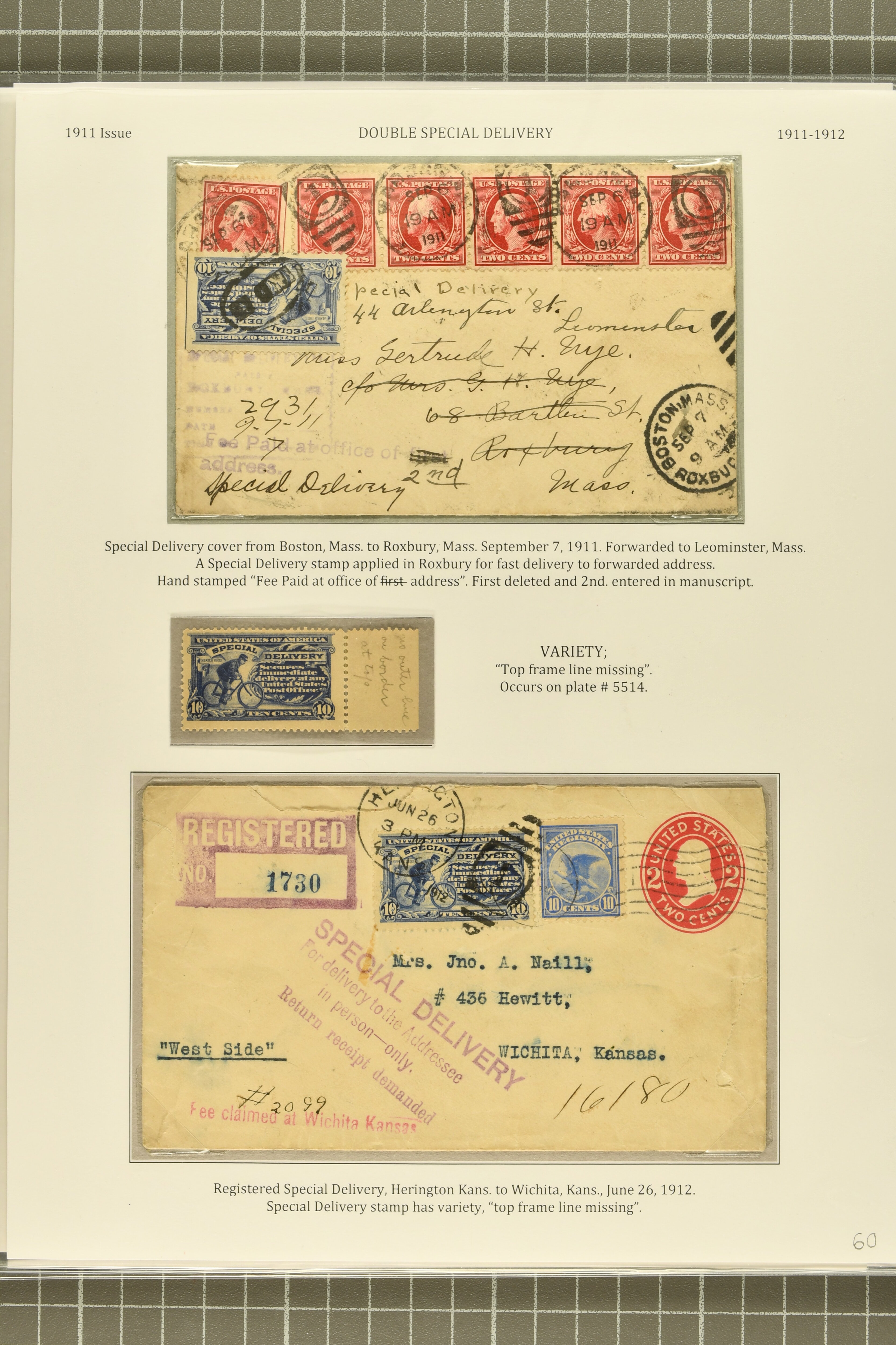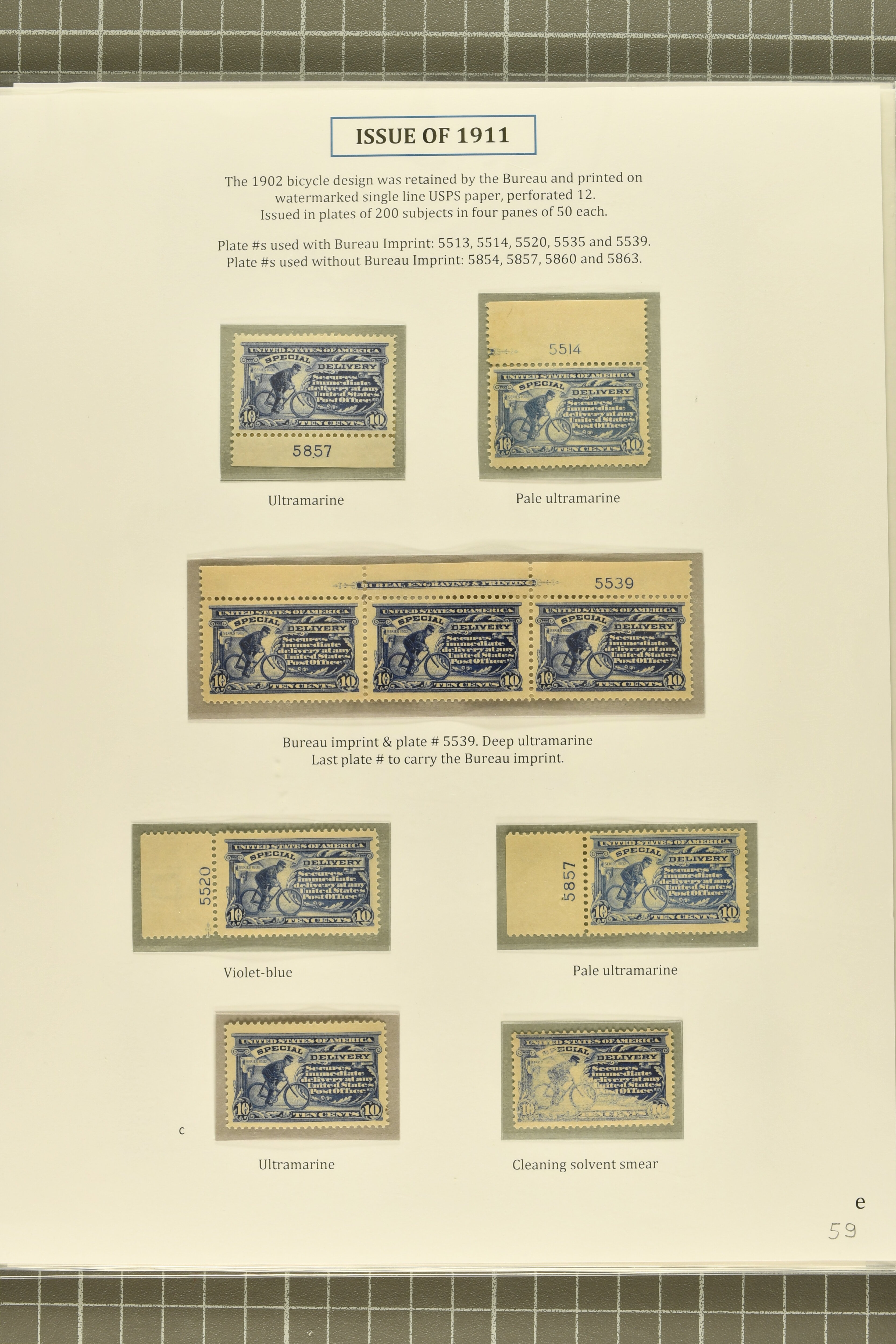 52 */cover image1911, 10 c. Ultramarine Issue 1911, 10 c. ultramarine, stamp and postal history study, with plate number singles in ultramarine (plate 5857), pale ultramarine (2, plates 5514 and 5857) and violet-blue (plate 5520), plate 5539 strip of three showing the complete "Bureau Engraving & Printing" inscription, the last such plate to carry that imprint, three singles in ultramarine, one showing a dramatic cleaning solvent smear, another showing the variety "top frame line missing" from plate 5514, and one displaying the unauthorized 1913 Shanghai/China Darrah Type III overprint, the covers (8) including 1911 Special Delivery cover from Boston to Roxbury, affixed in Roxbury with 10 c. ultramarine and forwarded to Leominster; 1912 registered special delivery from Herington to Wichita, Kansas; domestic service from Gambier to Columbus, Ohio, delivered in one and a half hours; uncommon markings including a fine 1913 example from Haverford to Rhode Island with "Delivery fee paid by / office of first address", 1912 cover sent within Washington D.C.struck with the only known example of the blue five-line Washington Special Delivery Section, 1914 Hotel McCloud advertising cover struck with one of three recorded "Special Delivery Duties / Performed" two-line handstamps in violet; scarce special delivery usage postmarked with Vera Cruz, Mexico duplex (Jun 23, 1914), one of three such recorded from the Mail Agency in Vera Cruz; and 1912 usage on potal card from Grayling to Bay City via RPO, a few small flaws, but a select and uncommon group, overall fine-very fine. Cert PSE (2011) for E8. (Image 1) (Image 2) (Image 3) (Image 4) (Image 5)