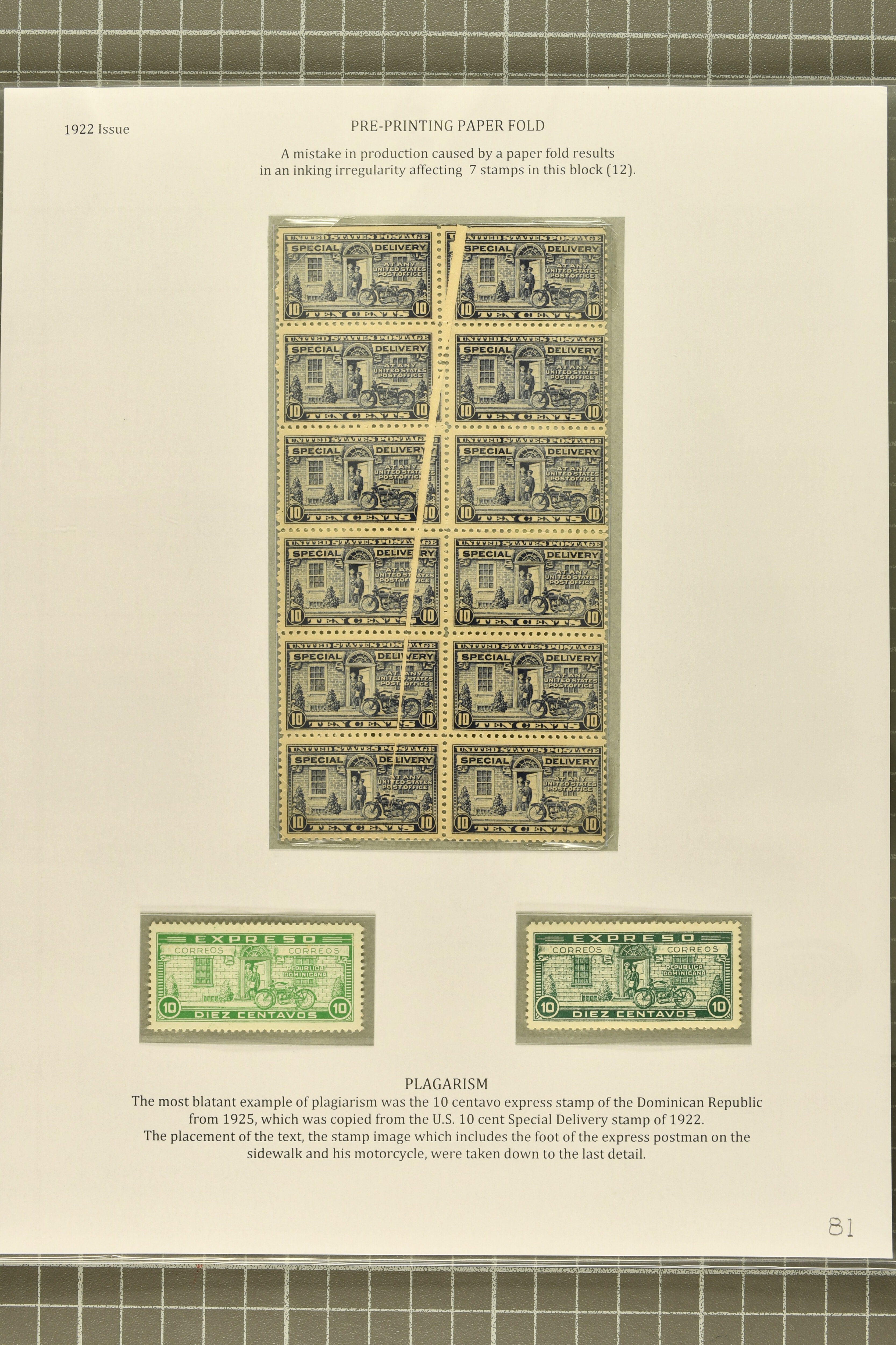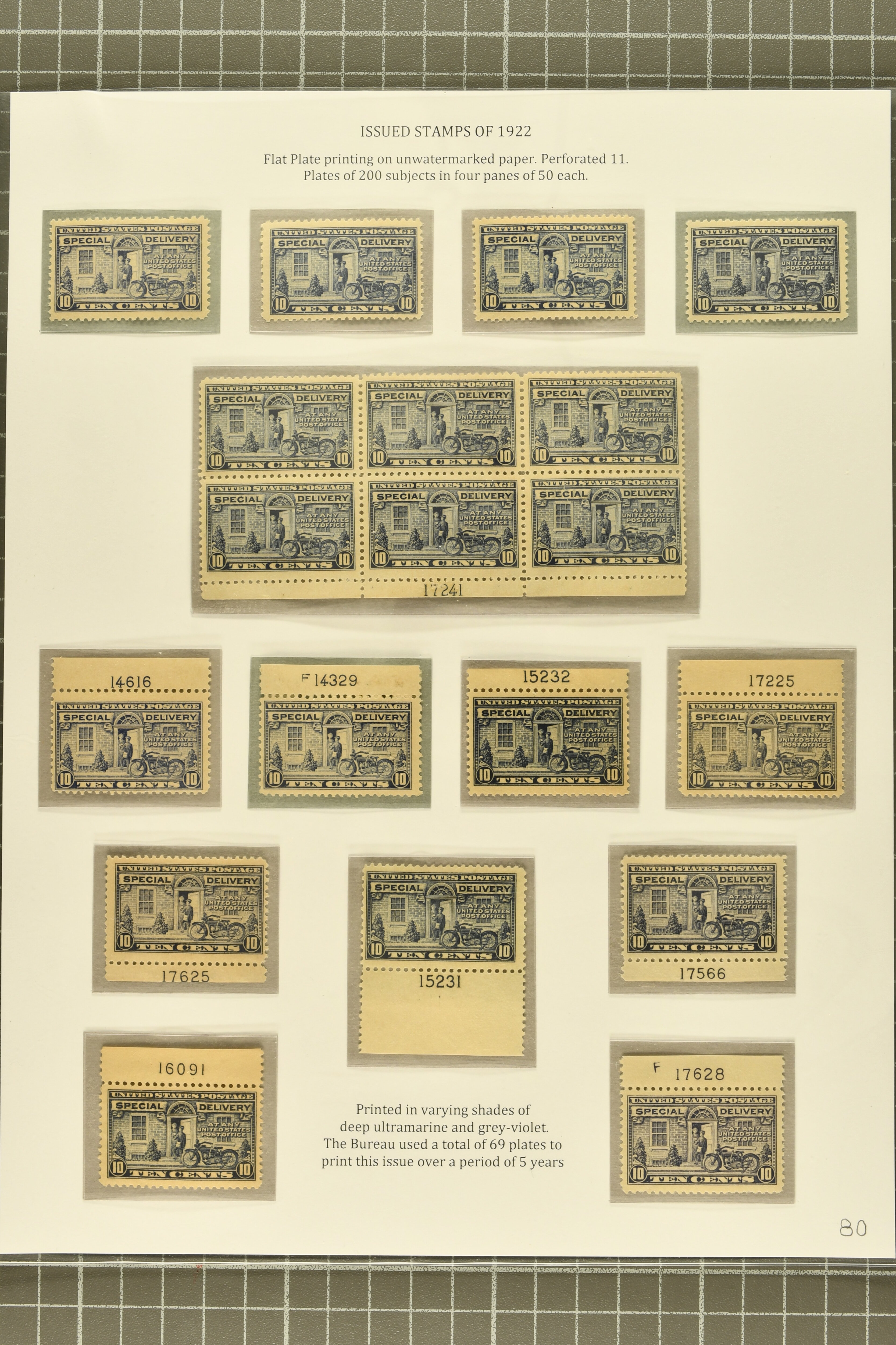 58 image1922 10 c. Gray Violet Issue 1922: 10c. ultramarine and 10 c. grey violet, a study of the issued stamp, mounted on two exhibit pages, comprising four examples of the two listed shades, ten plate number singles, each from a different plate, a scarce bottom plate #17241 block of six, and a block of twelve with a dramatic pre-printing paper fold, part to large part original gum, overall fresh and fine. (Image 1) (Image 2)