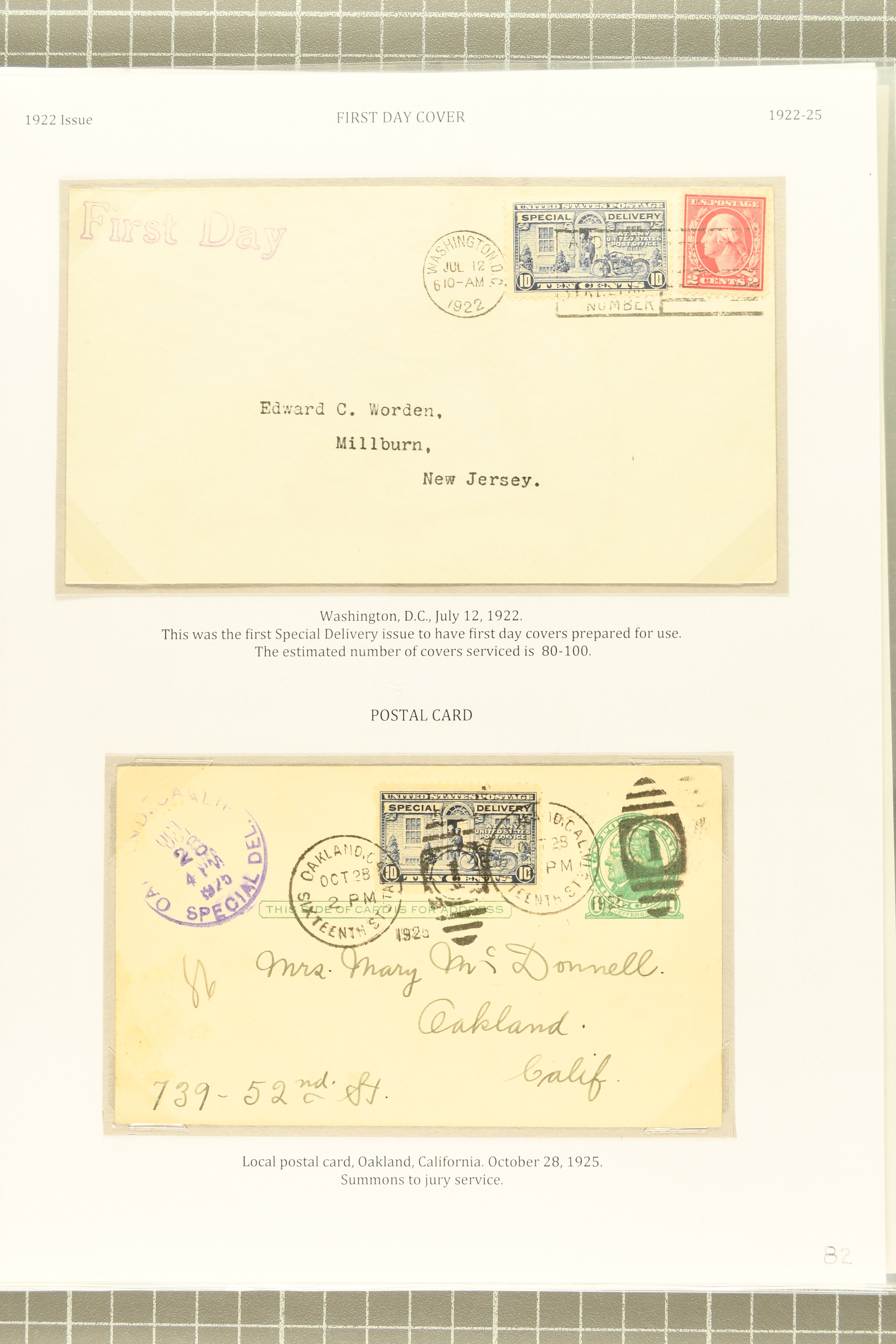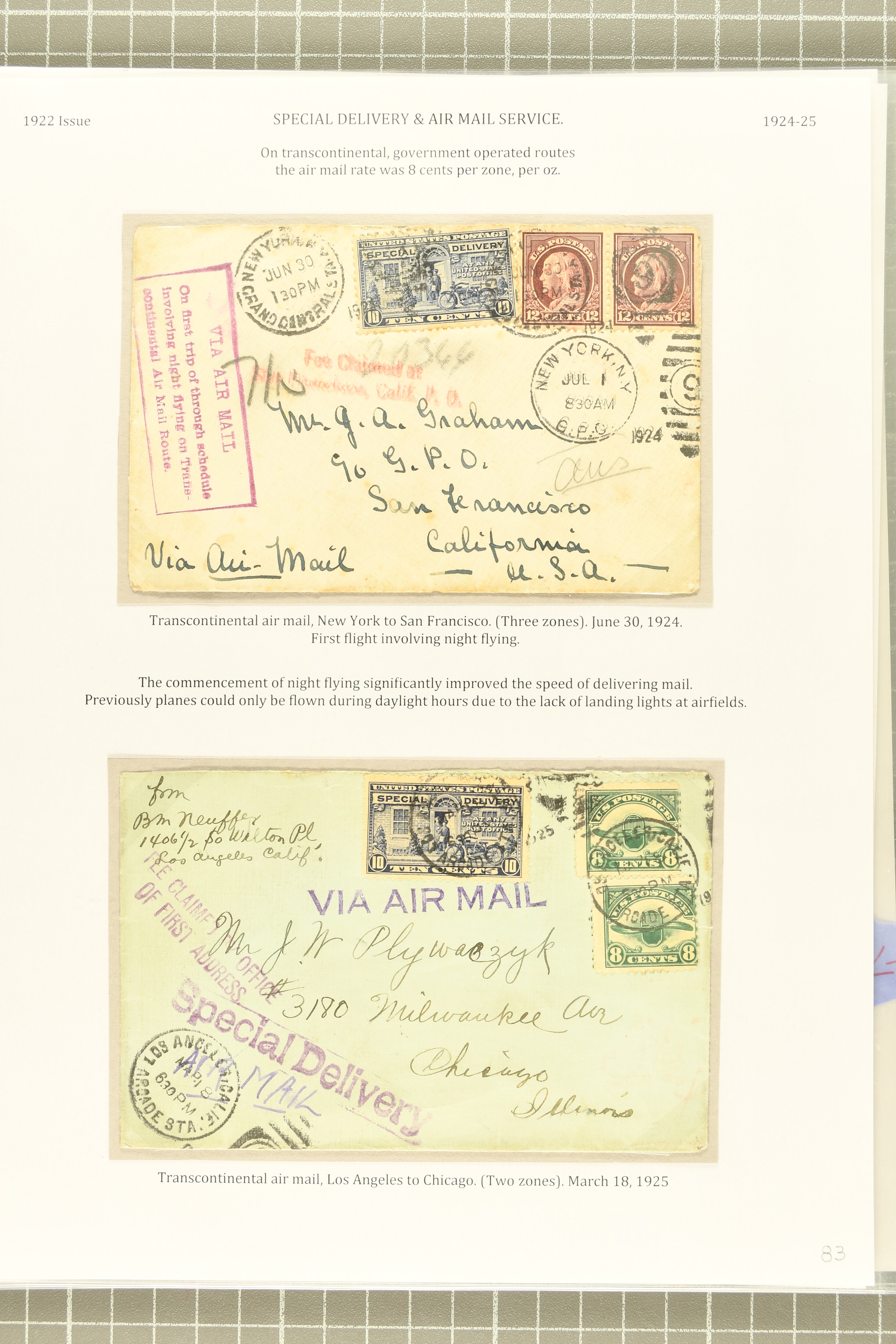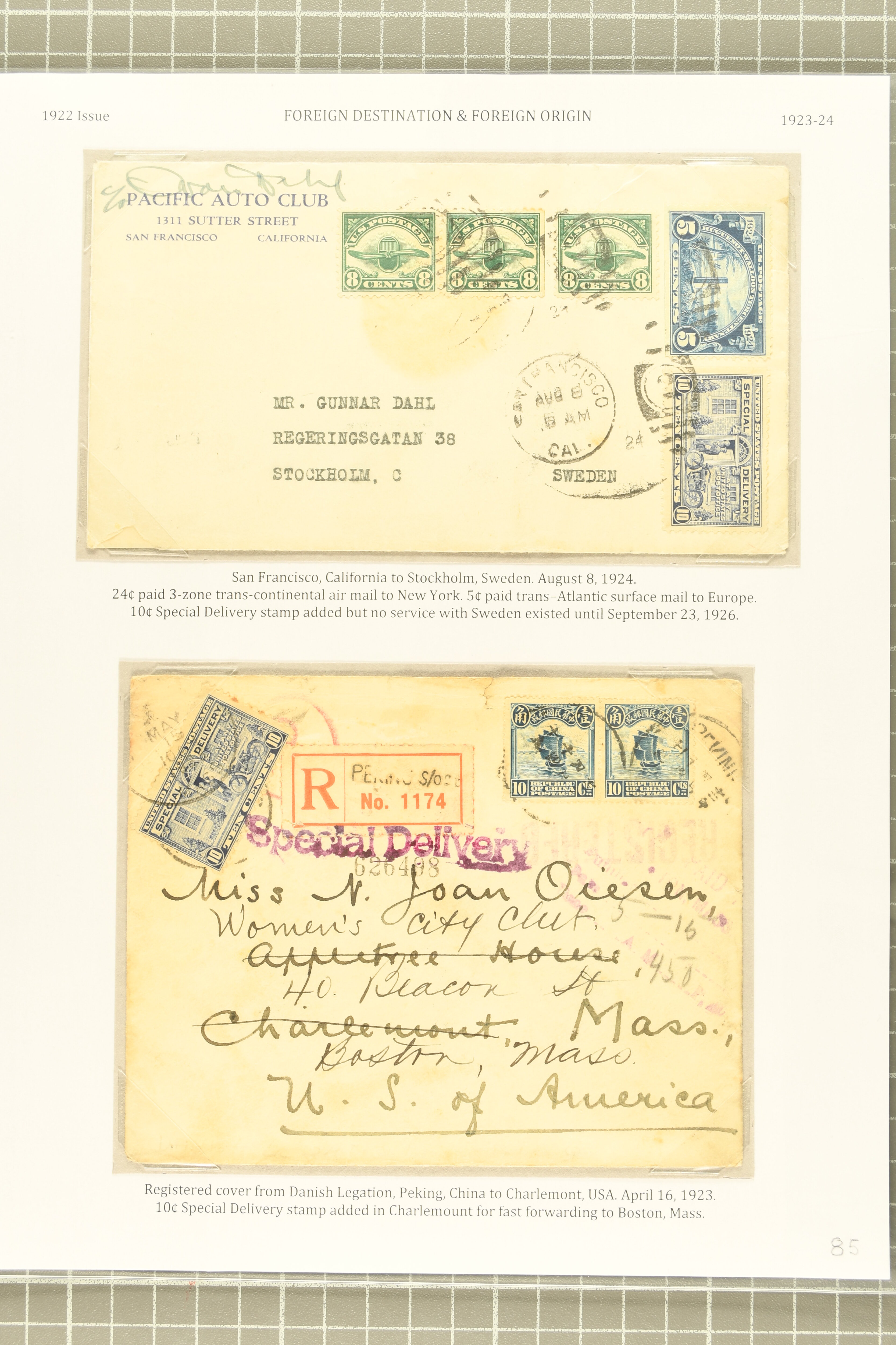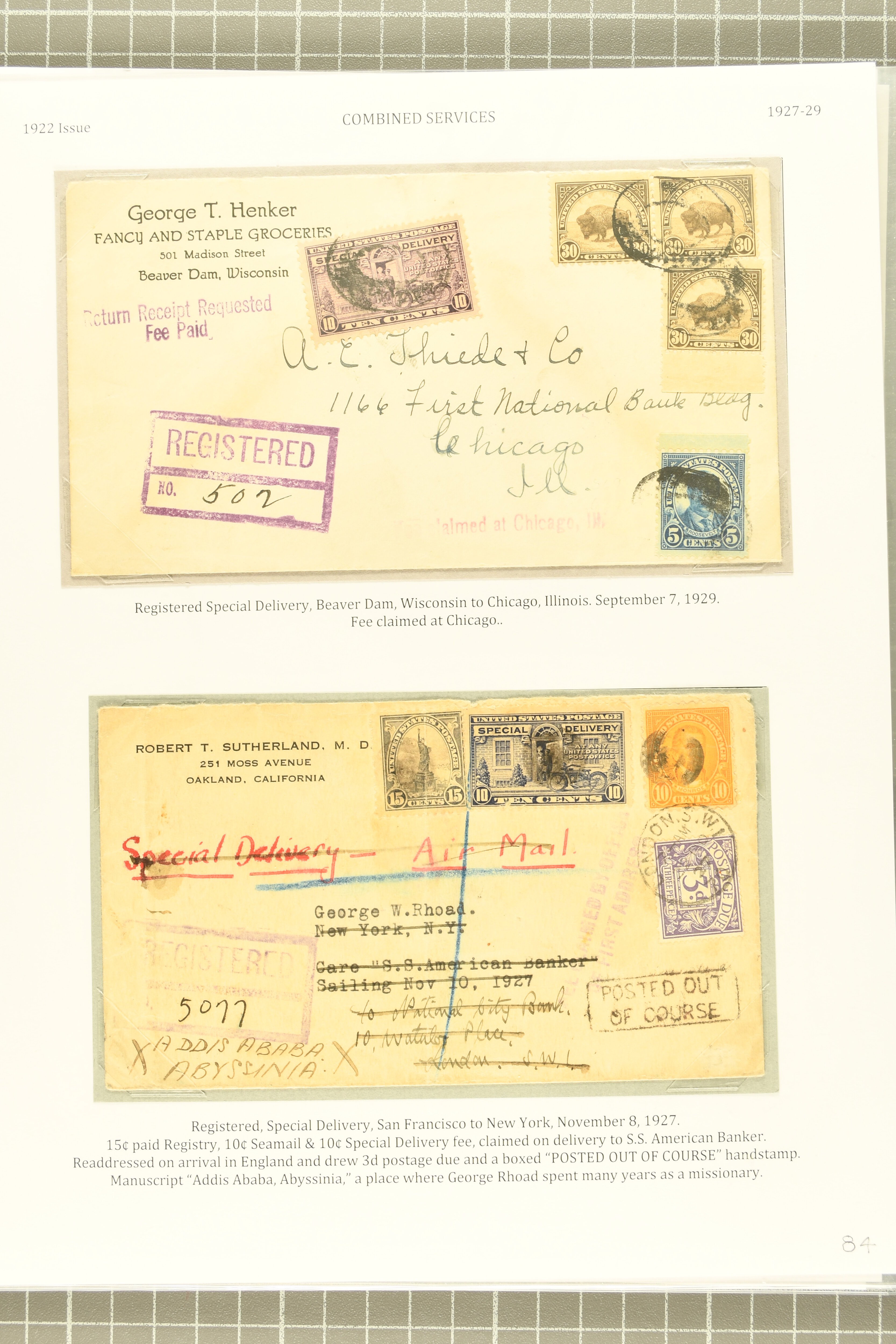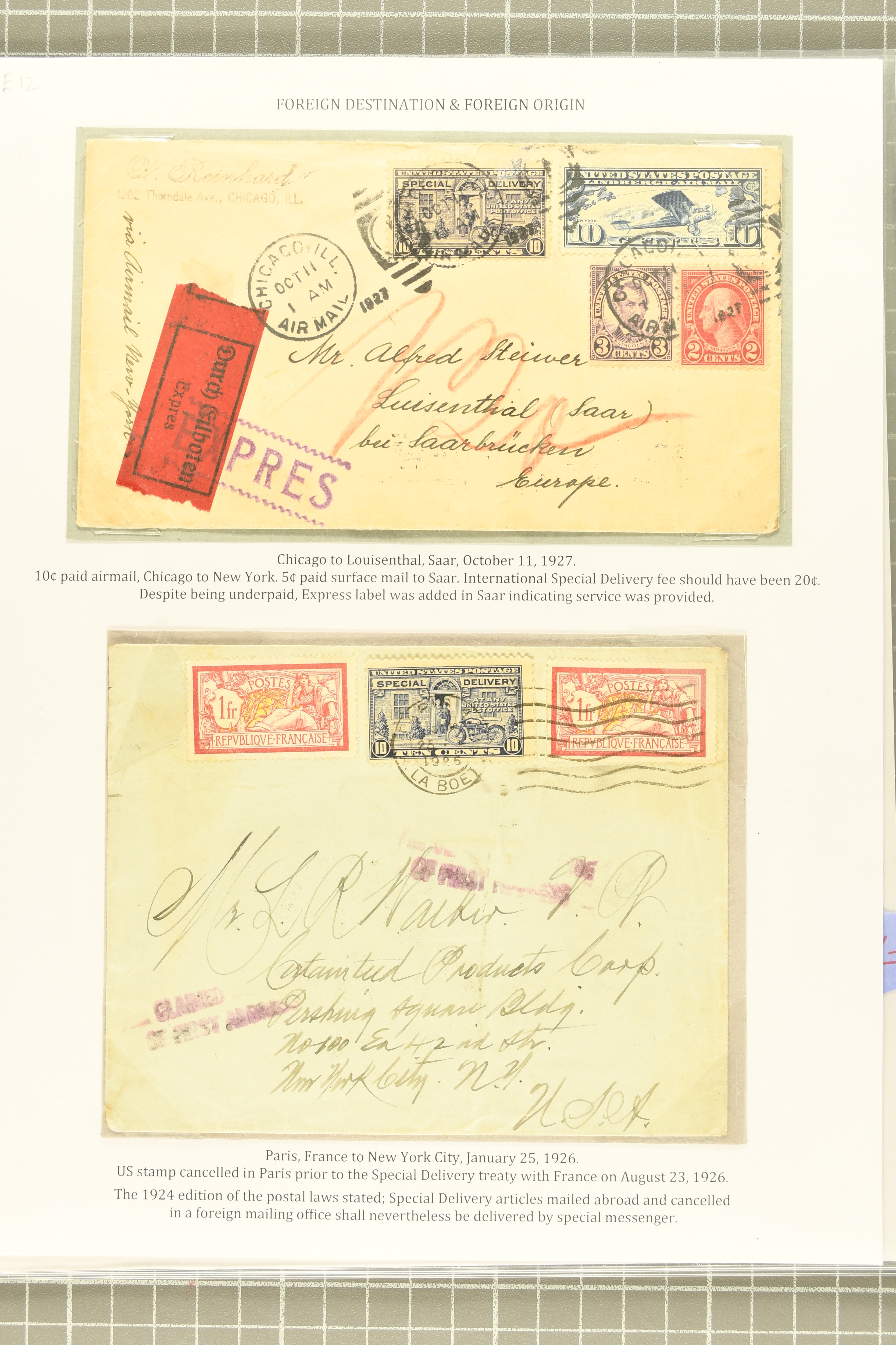 59 cover image1922 10 c. Gray Violet Issue 1922: 10 c. ultramarine & gray violet, postal history selection of eleven items, comprising a scarce first day cover, this being the first Special Delivery issue to have FDCs prepared for use, 1925 use on 1 c. Jefferson stationery card, two combined registered special delivery covers, one of which forwarded upon receipt in England to Addis Abeba; three combined special delivery airmail covers; desirable 1927 airmail special delivery cover from Chicago to the Saar, with Express label affixed upon arrival in the Saar, indicating the service was provided despite the cover being unpaid; and two unusual usages on covers of foreign origin, from France and China, the latter being registered, some typical creasing, a fine group. (Image 1) (Image 2) (Image 3) (Image 4) (Image 5)