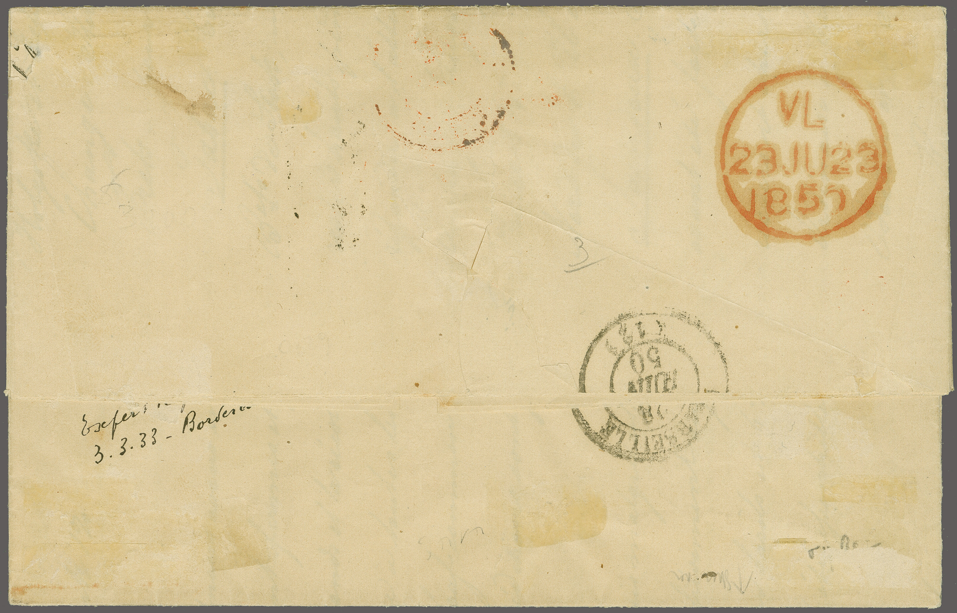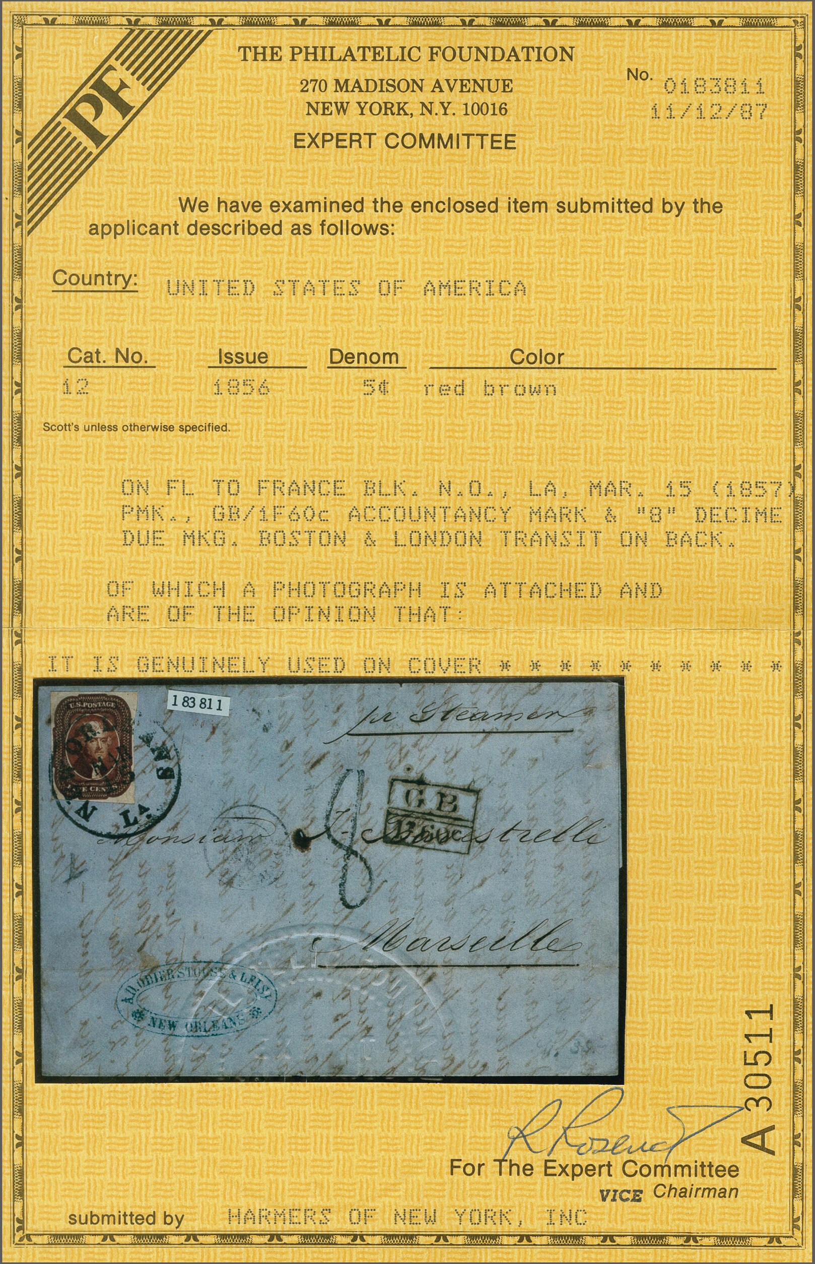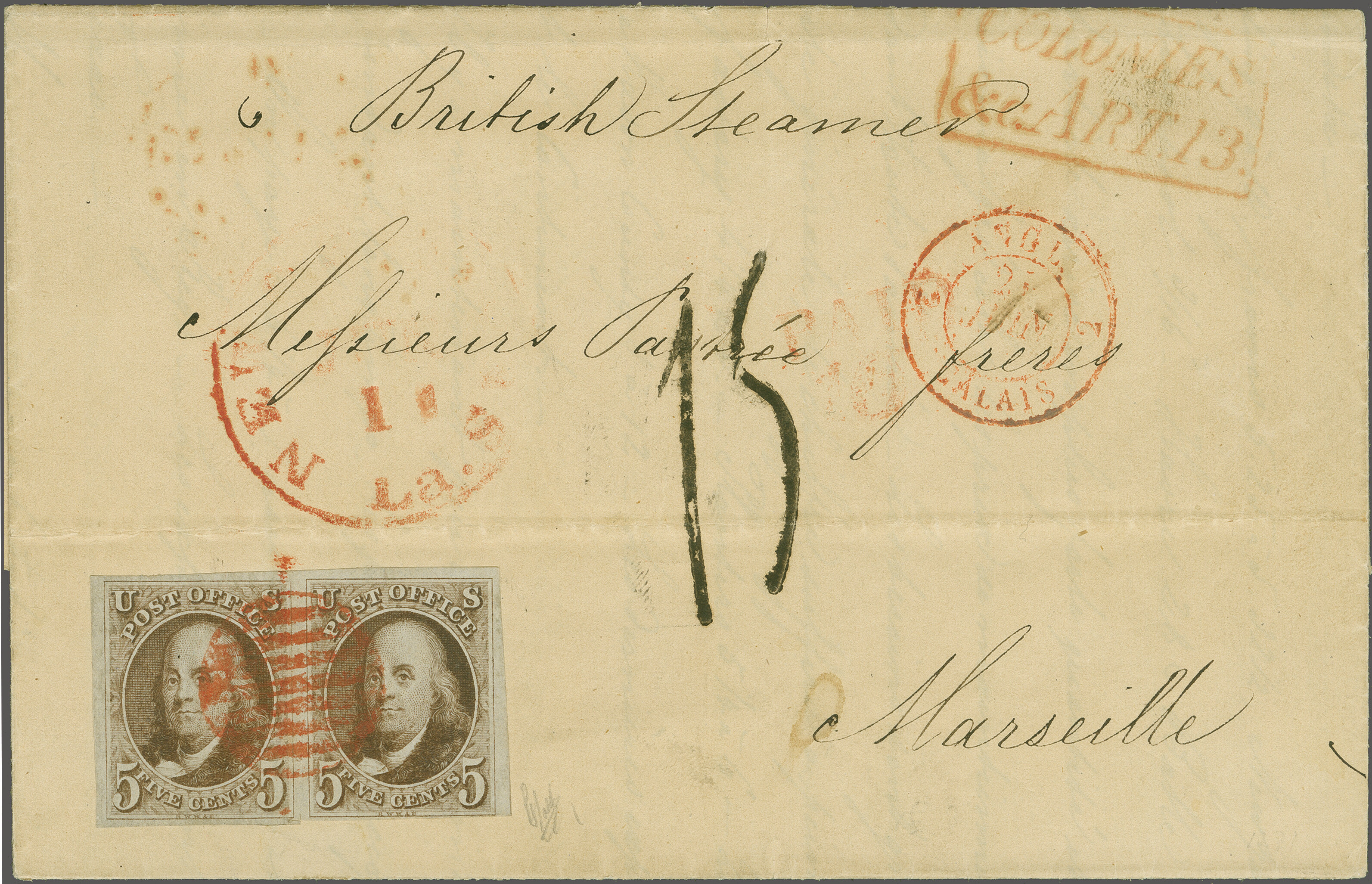 on reverse and framed "COLONIES / &c. ART. 13" in red; thence via Calais with Marseille arrival on reverse where charged "15" décimes due. A rare and most attractive Transatlantic usage. Signed Holcombe Scott = $ 2'500+. (Image 1)
