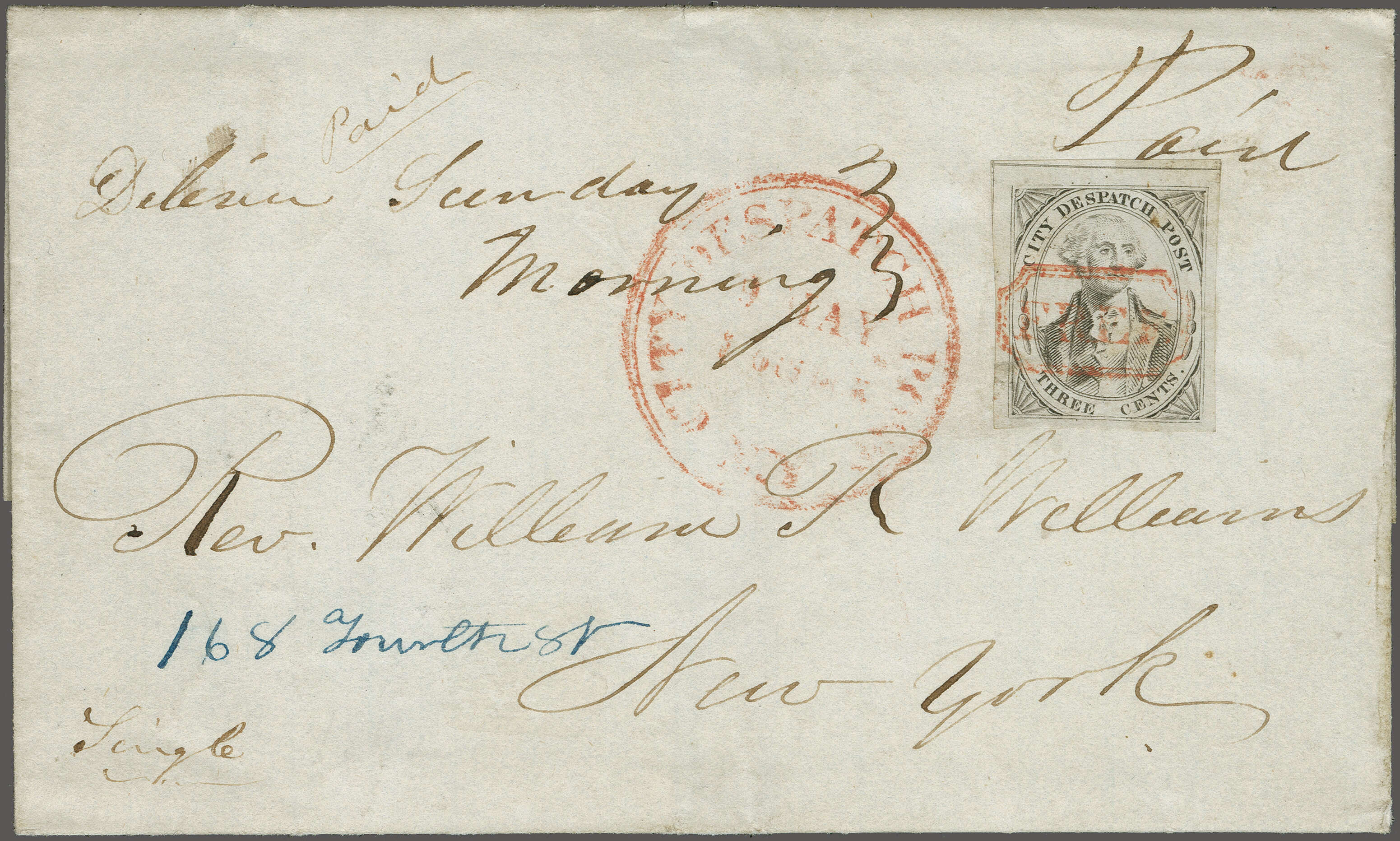 cancelled by framed "FREE" in red with double ring "CITY DESPATCH POST / N.Y" datestamp in red (May 9) alongside. A most unusual usage. (Image 1)