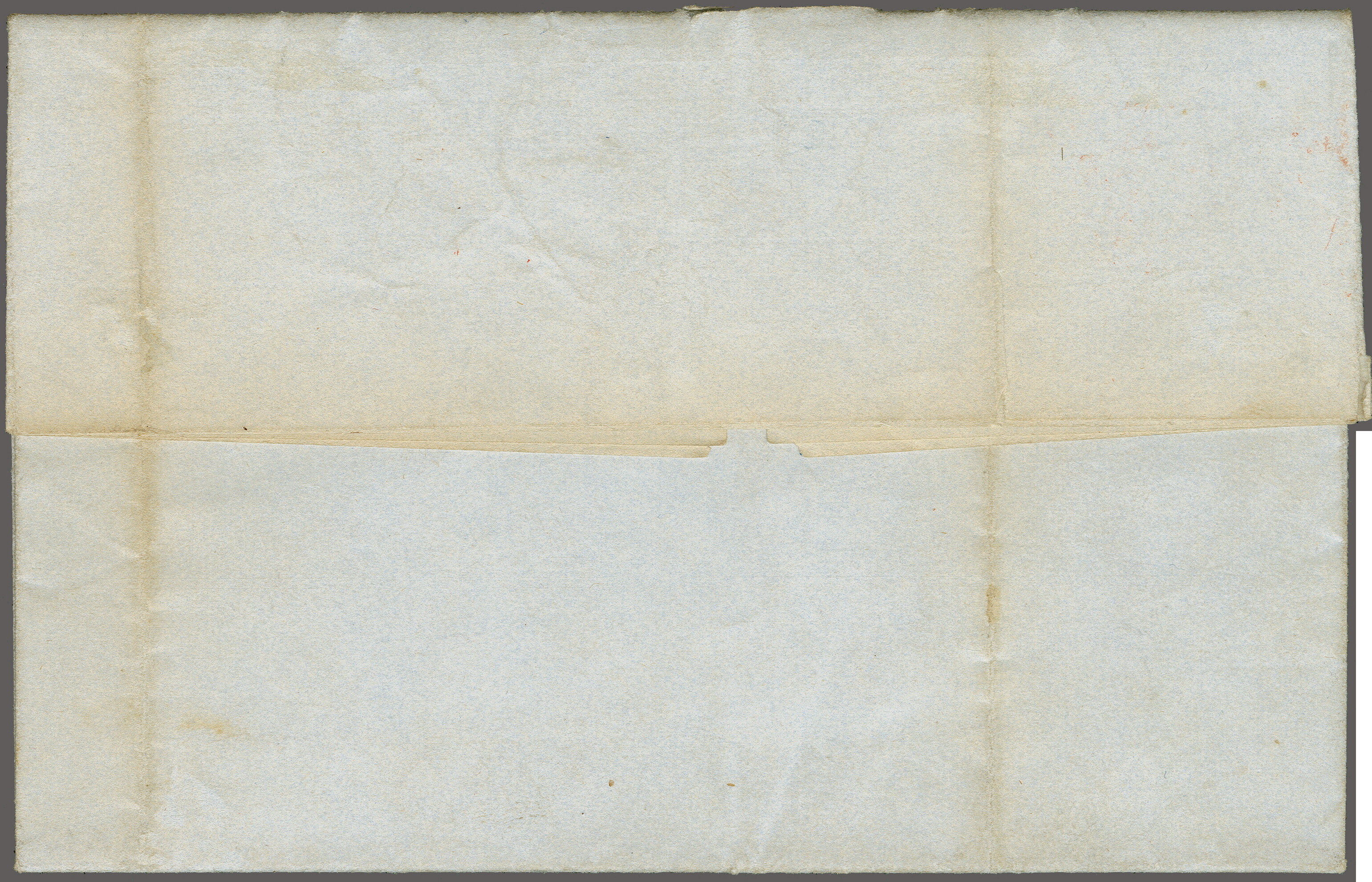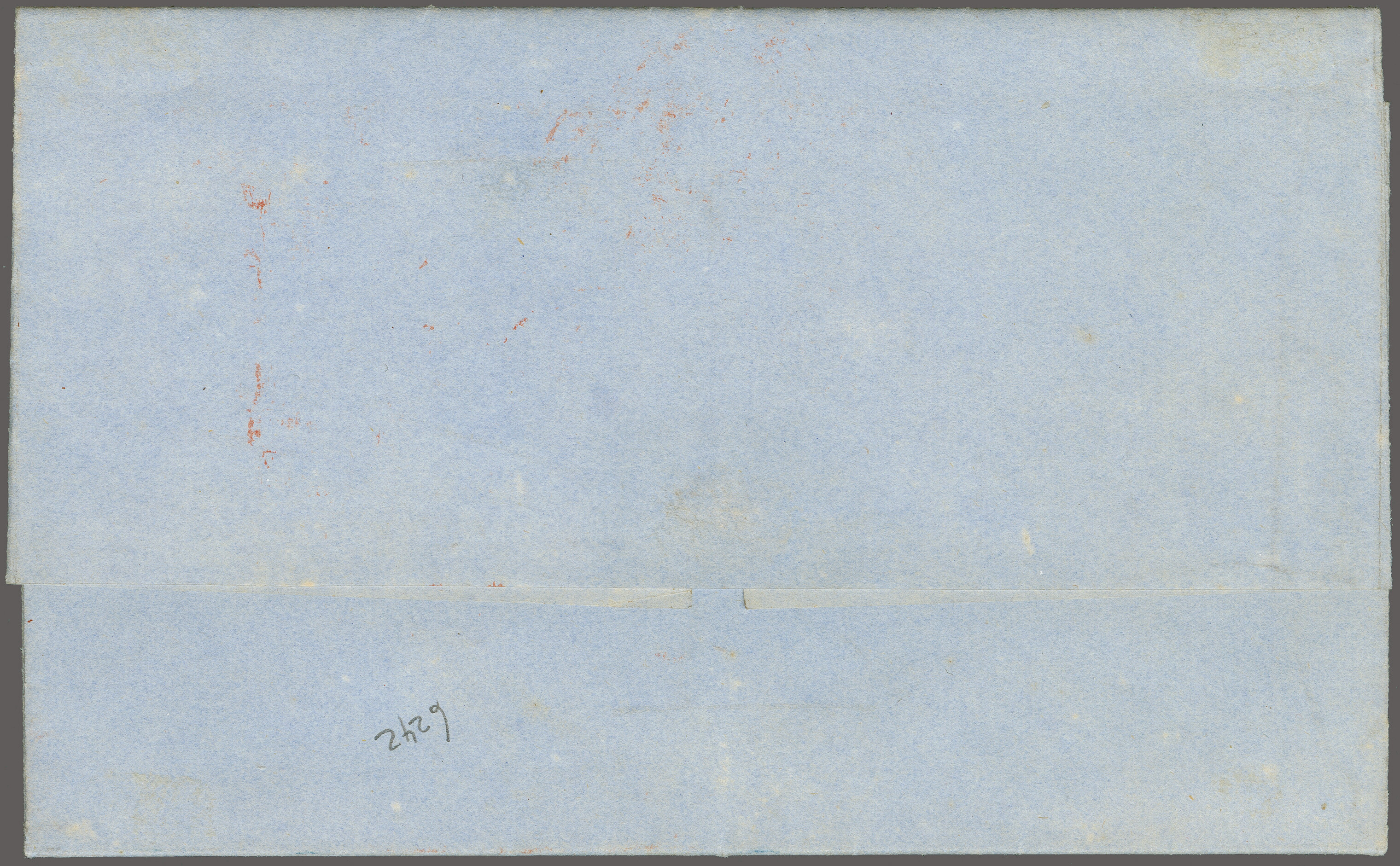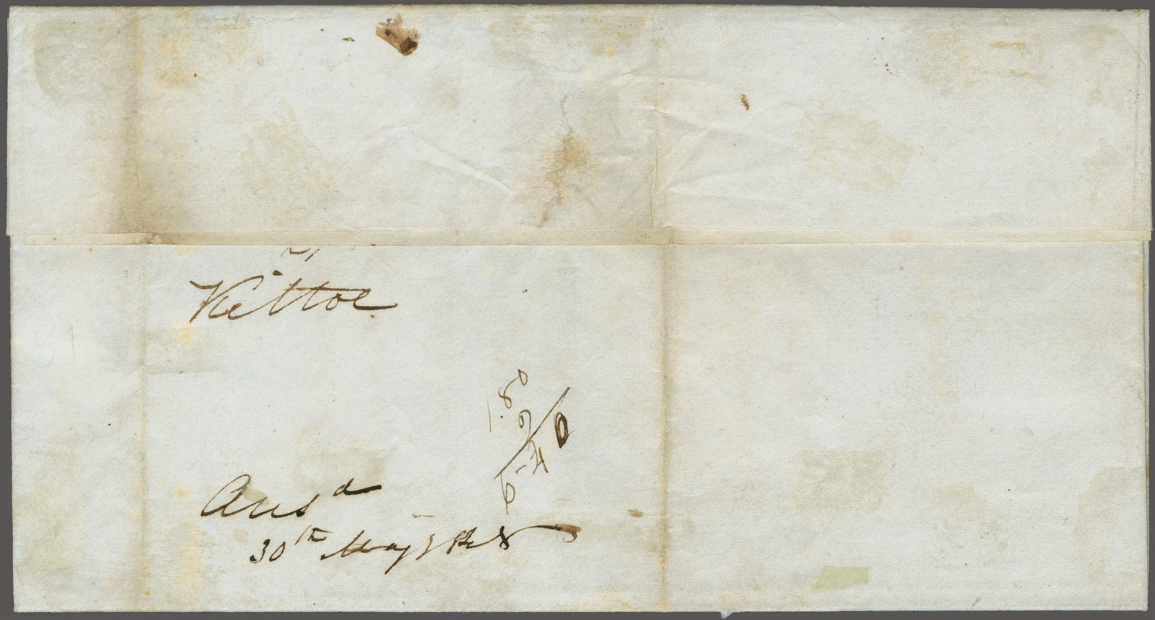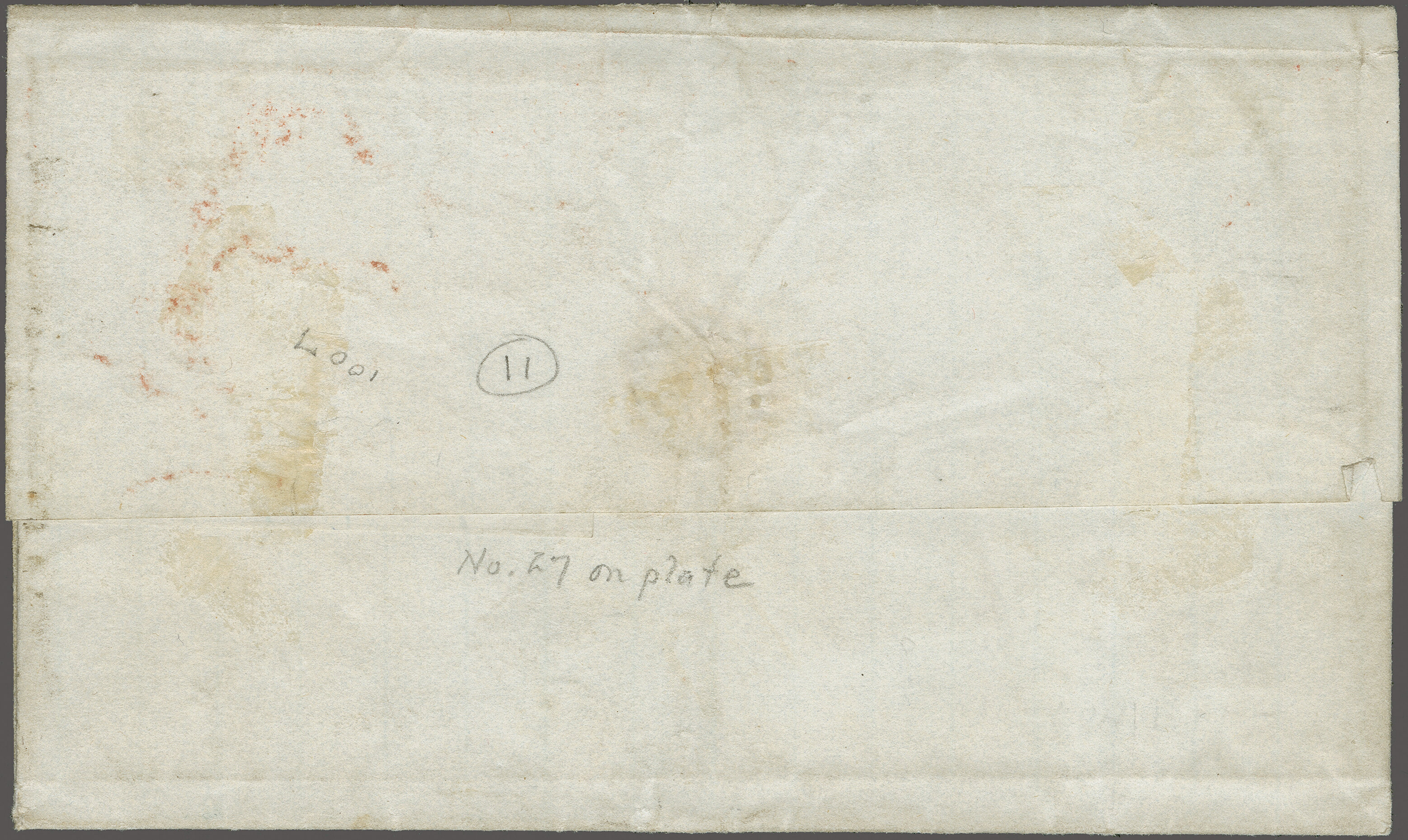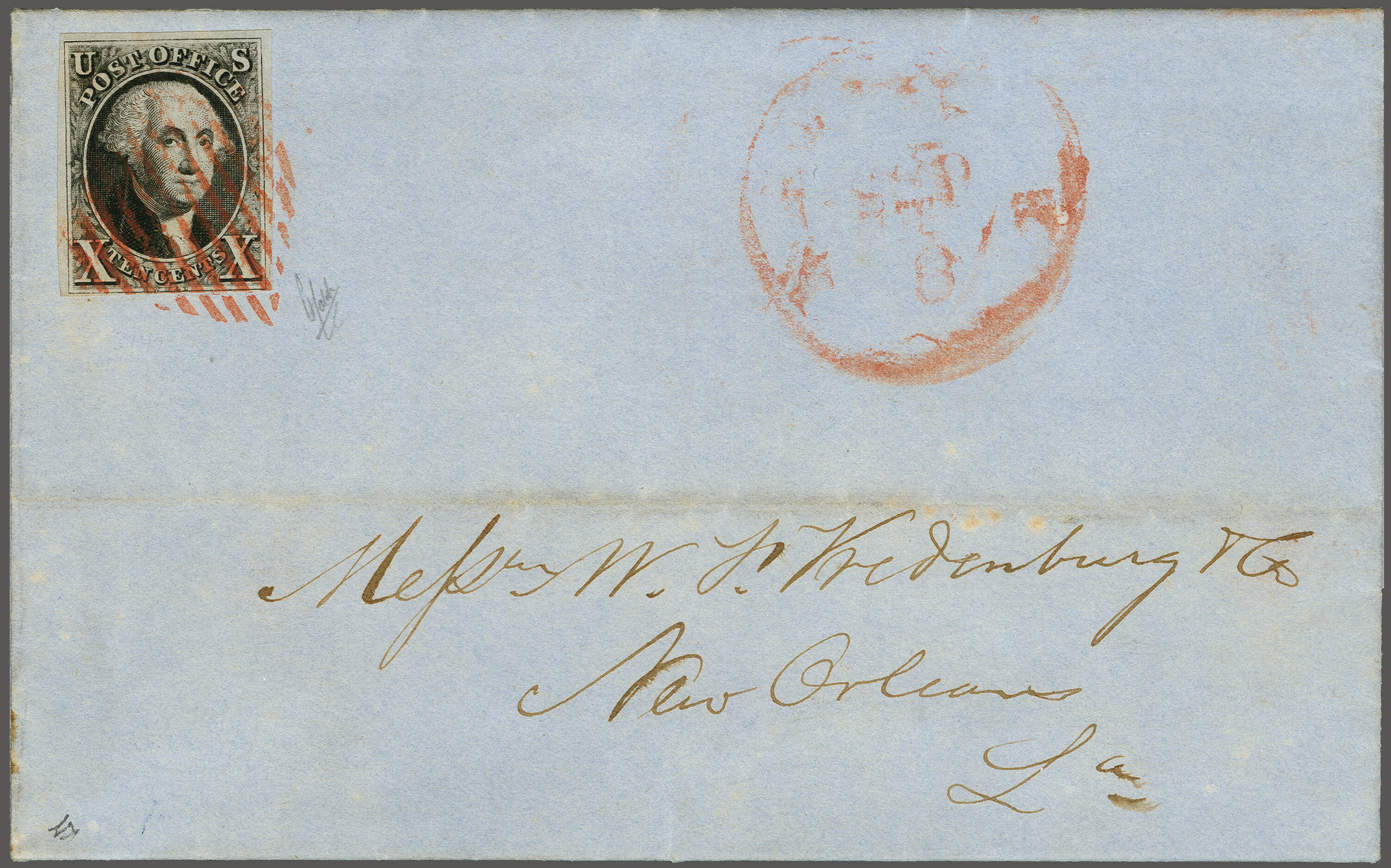 1847: Washington 10 c. black on bluish paper, a used example with ample to large margins all round on 1849 entire letter to New Orleans at single rate above 300 miles, neatly tied by barred grid handstamp in red with "New