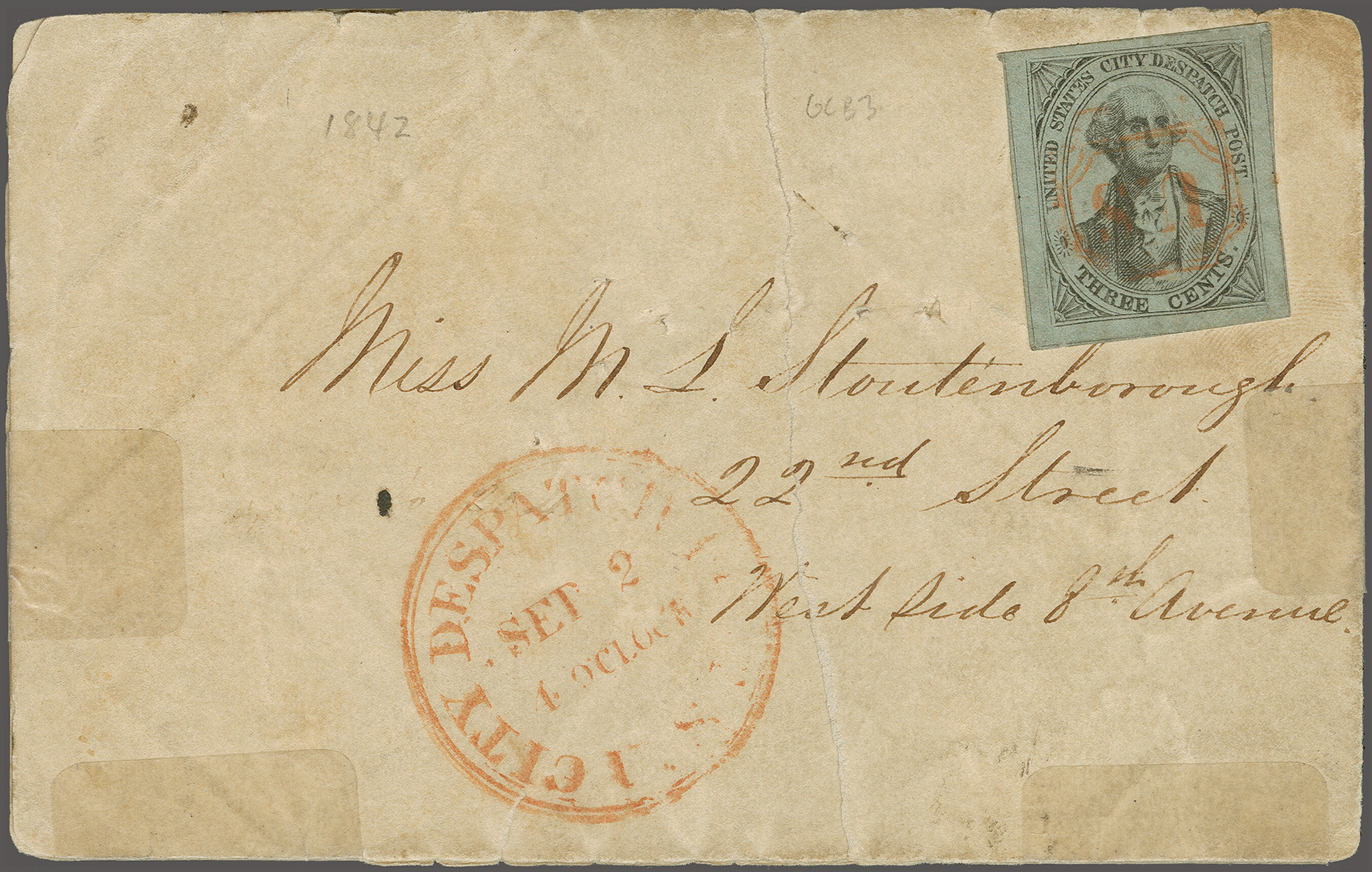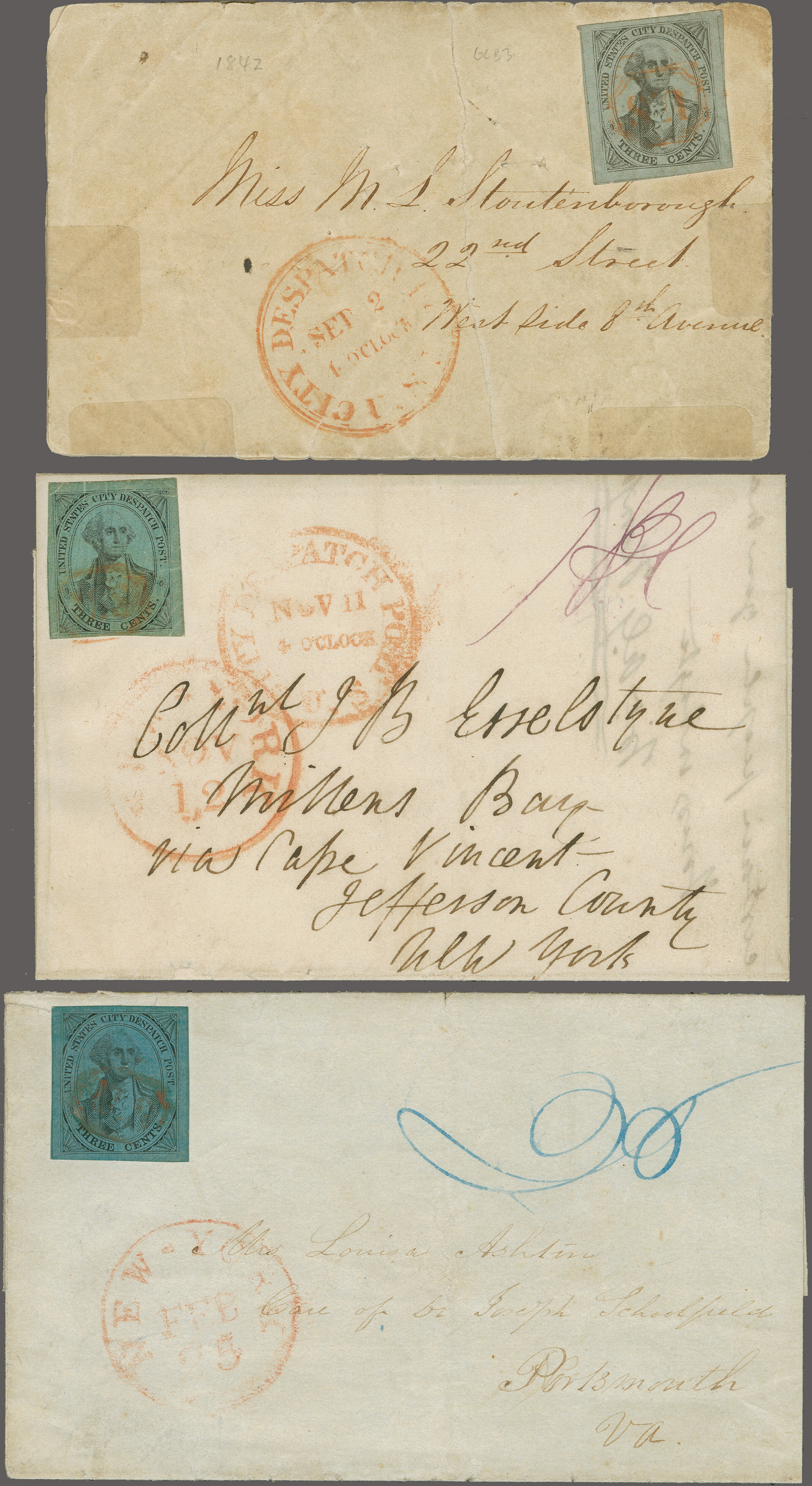 New York City Despatch 1842/45: Covers (3) with 3 c. black on light blue wove paper, a fine large margined example on cover cancelled by octagonal "U.S" in orange-red with double lined "CITY DESPATCH POST / US" (Sept 2, 6