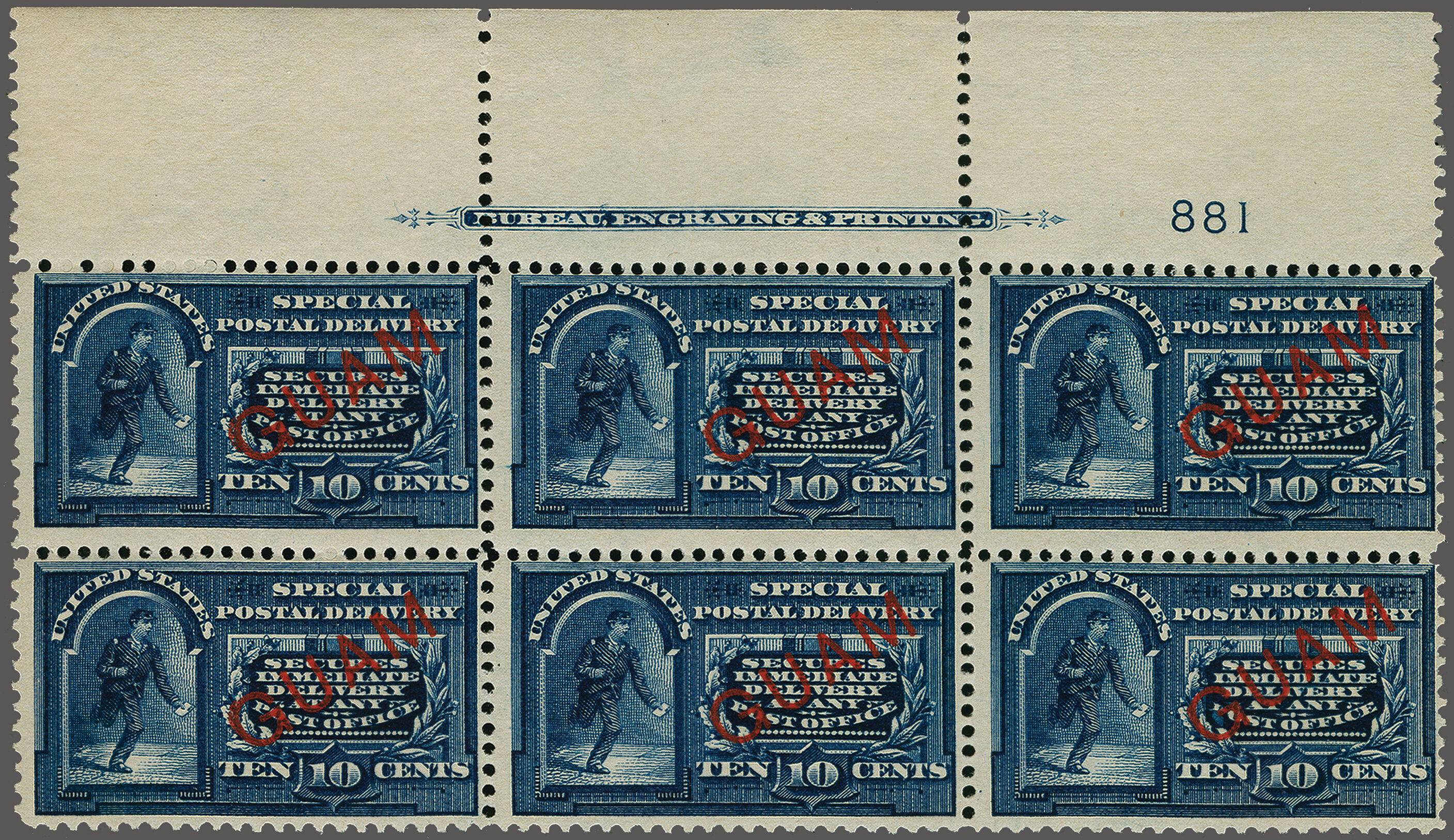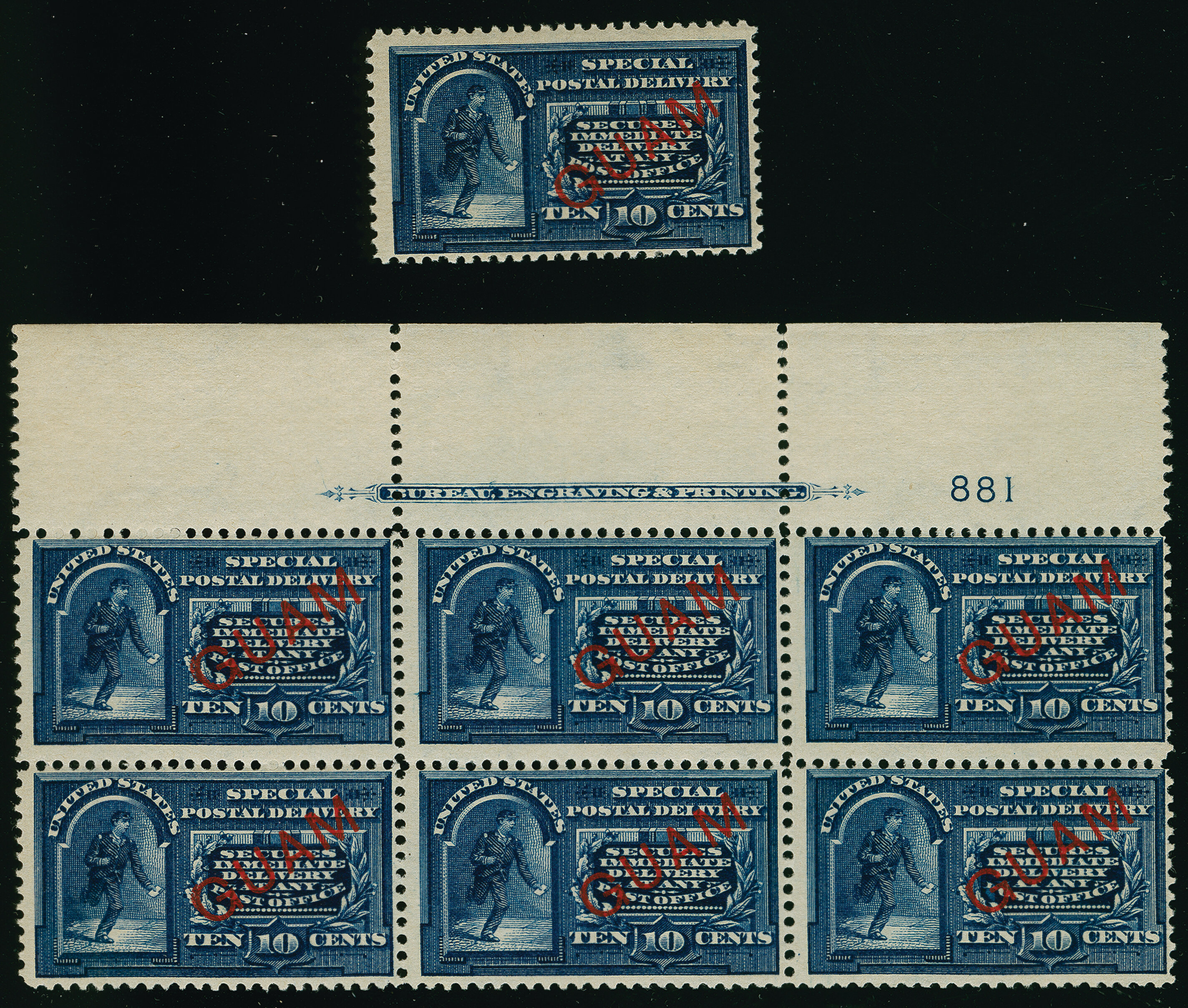 Guam: Special Delivery Issues 1899: 10 c. blue, an unused single showing the variety "dots in curved frame above messenger", ocurring only on plate 882, and an unused upper plate block of six, displaying the complete "BUREAU