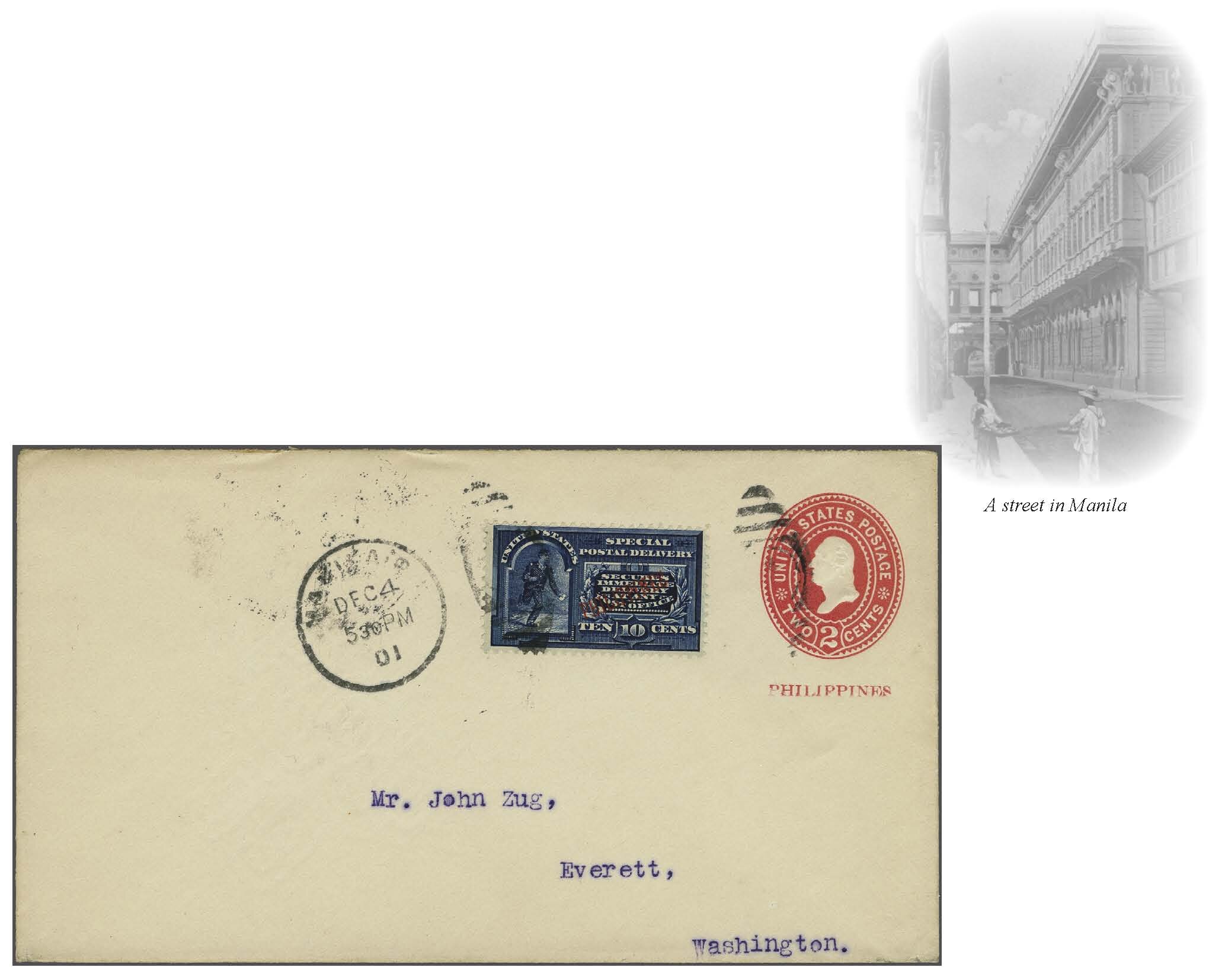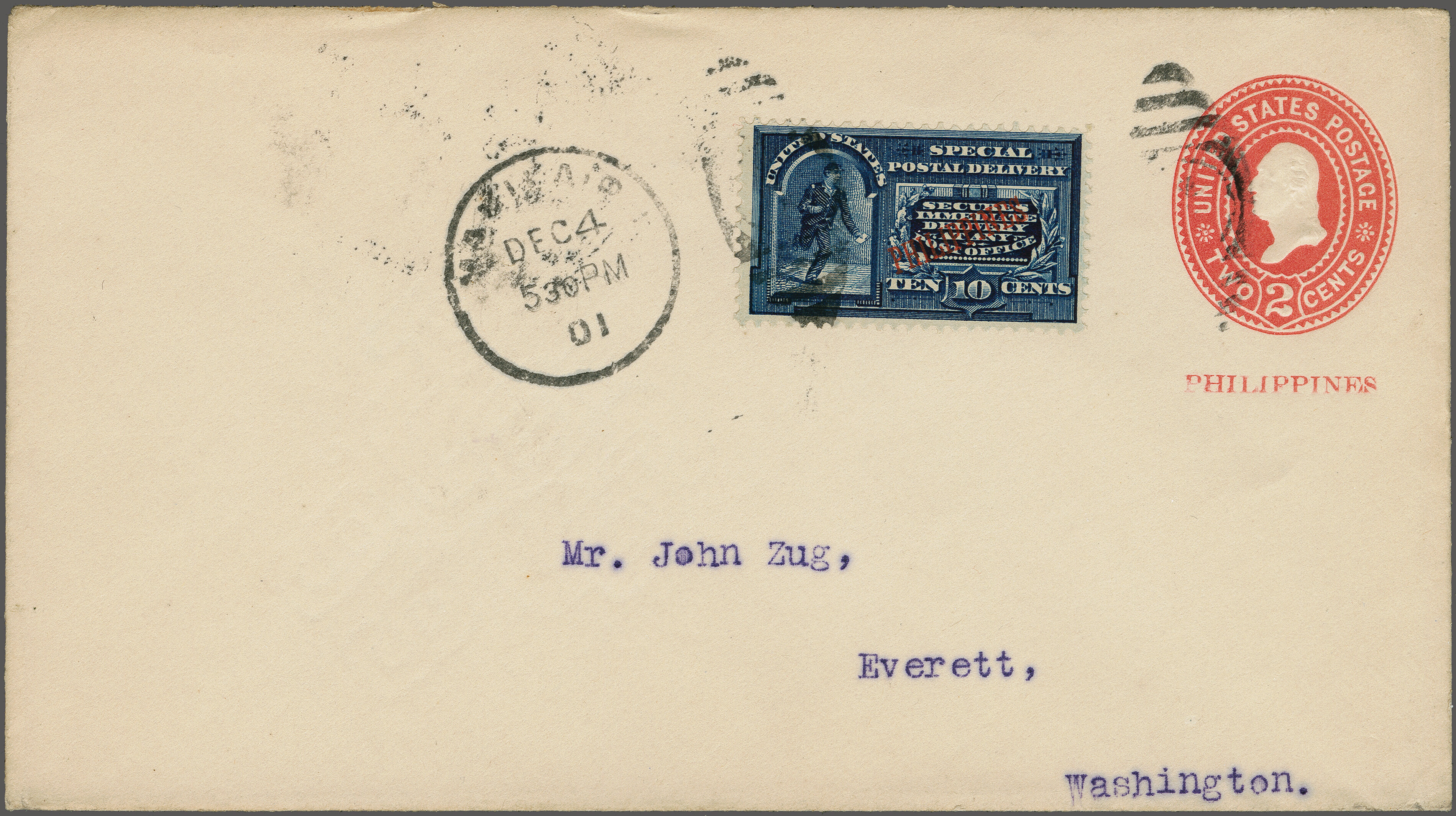 Philippines: Special Delivery Issues 1901: 10 c. blue, variety "five dots in curved frame above messenger", tied to 2 c. postal stationery cover to Everett, Washington, by Manila P.I. duplex (Dec 4, 1901), remarkably fresh, a