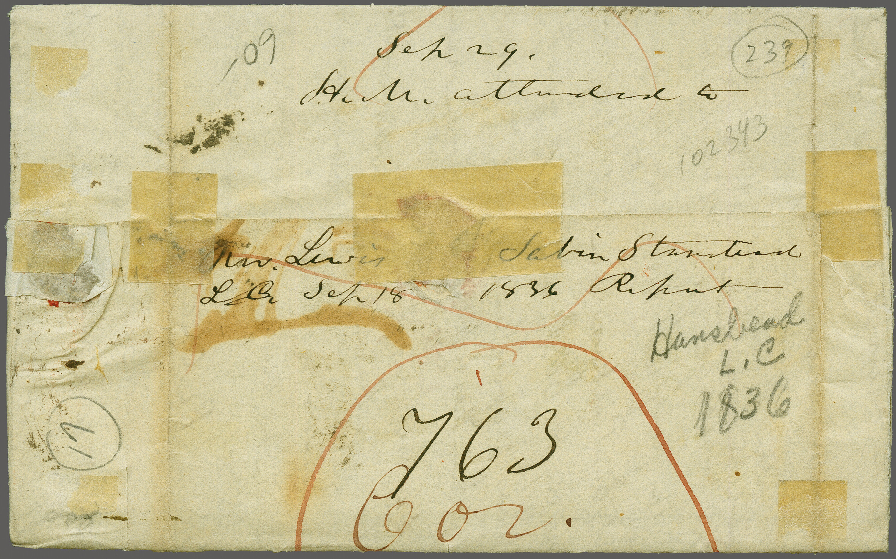 1836 (Sept. 24): Entire letter from Derby Line Vermont to New York, struck on obverse with fancy intaglio handstamp "DERBY LINE / VT." in notched arc band in black dated in manuscript "Sept 24", "18¾" rate to New York, file