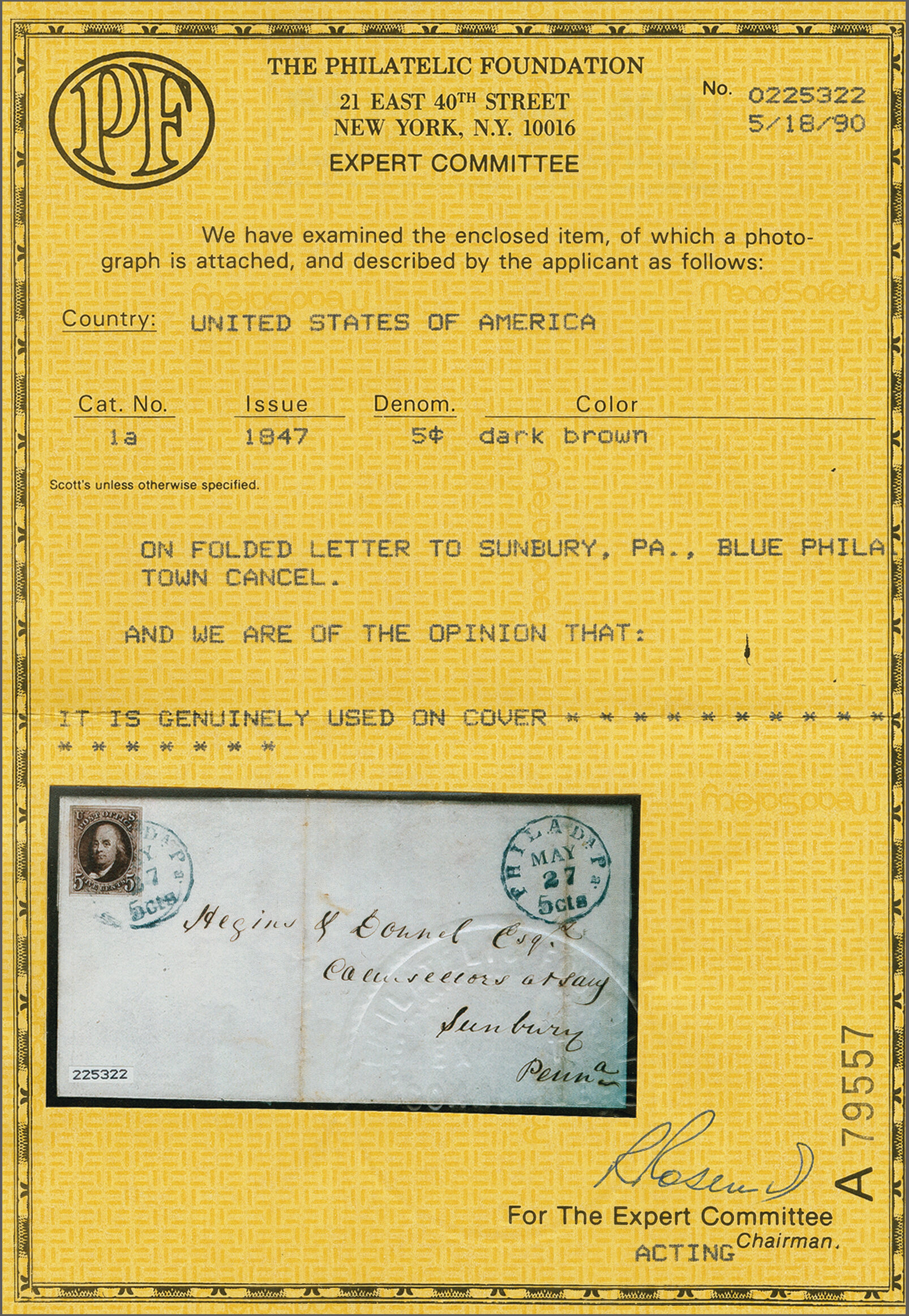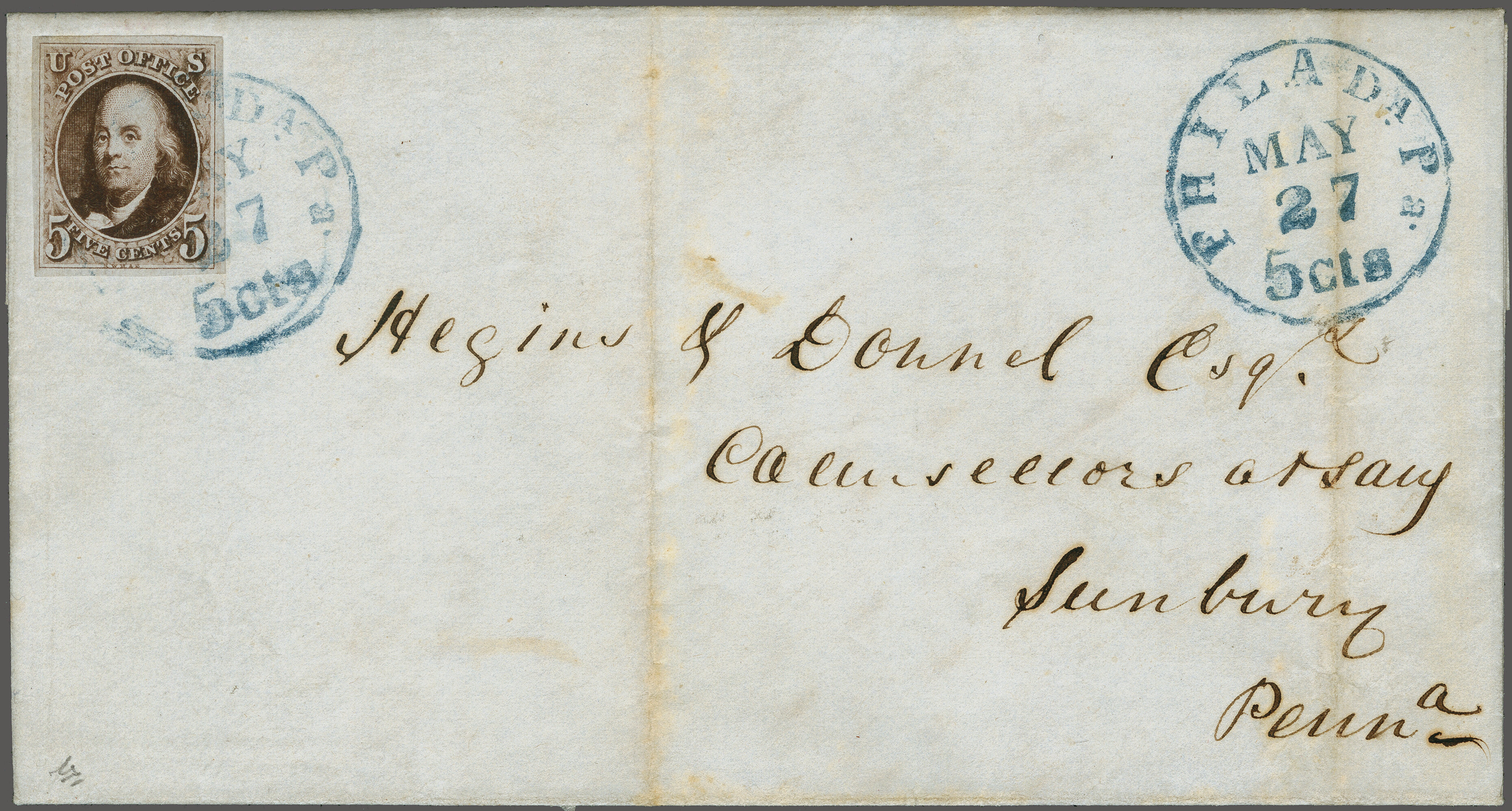 1847: Franklin 5 c. dark brown on blued paper, a fine example with large margins all round, used on 1848 entire letter (with printed heading for V.B. Palmer's U.S. Collection Agency) to Sunbury, Pa., tied by "PHILADA Pa. / 5