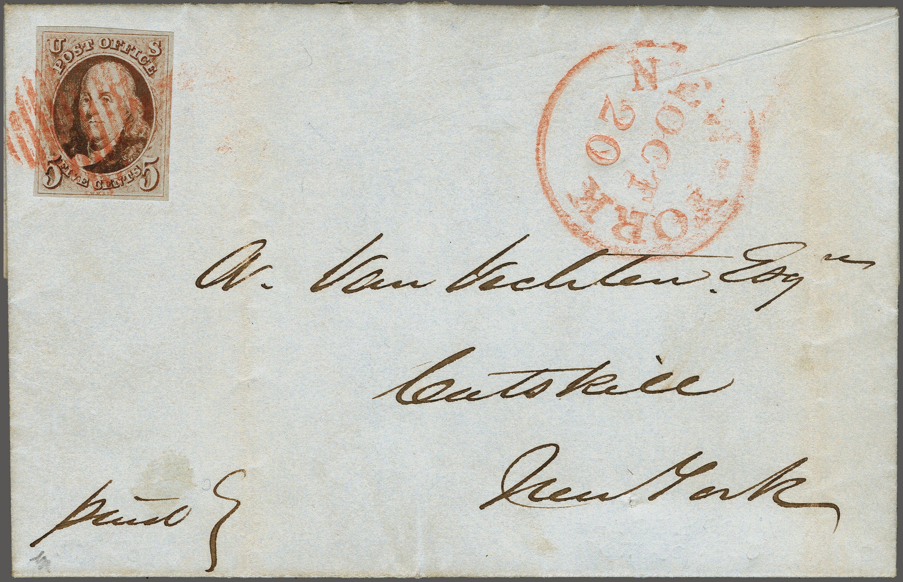 1847: Franklin 5 c. red-brown on blued paper, a fine example with large margins all round, used on 1850 entire letter endorsed "Paid" to Catskill, tied by barred obliterator of New York in red with despatch cds at right (Oct