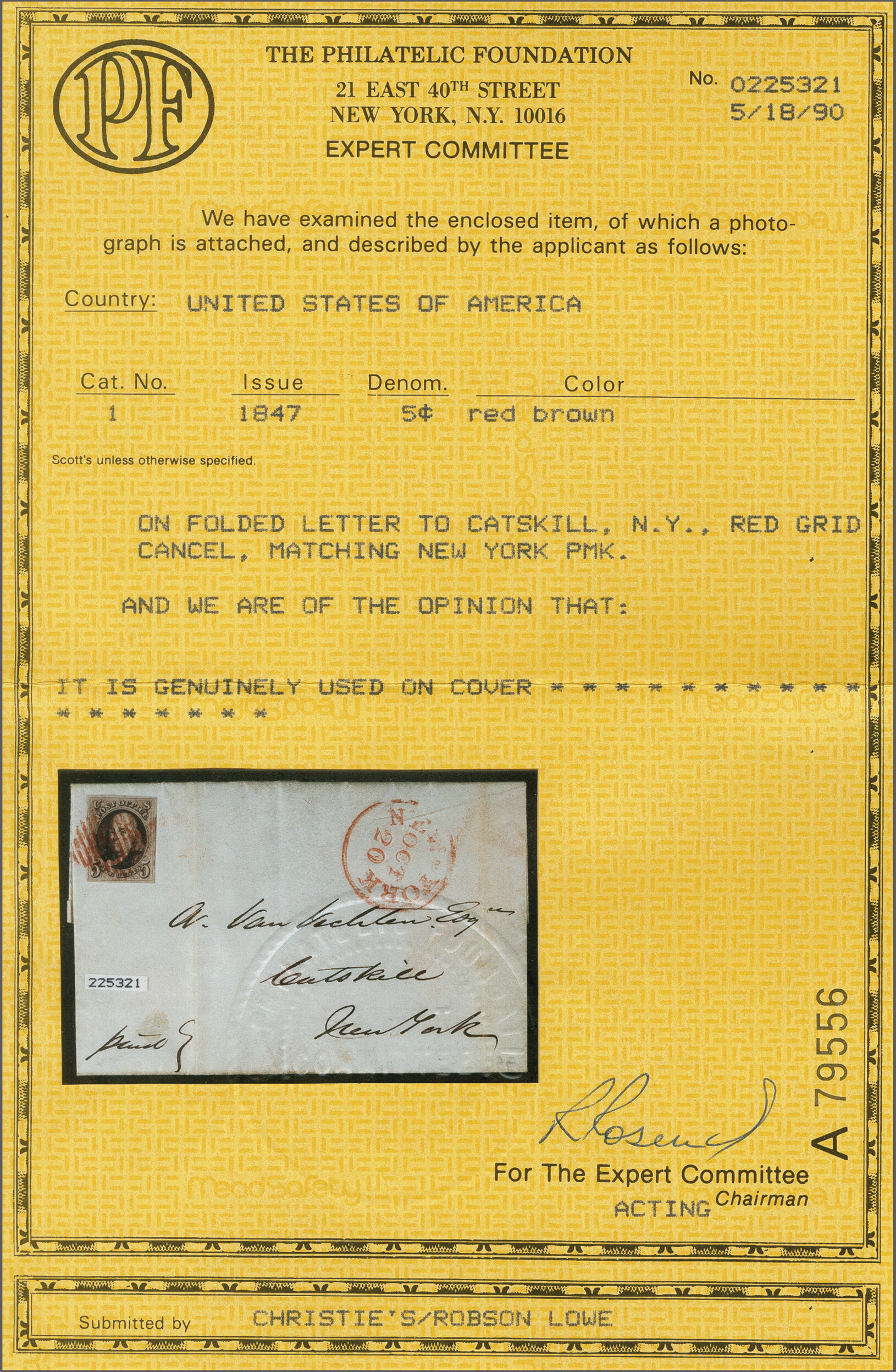 1847: Franklin 5 c. red-brown on blued paper, a fine used example with good to large margins all round, lightly cancelled by circular grid handstamp in red Scott = $ 400. (Image 1)