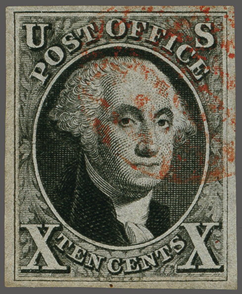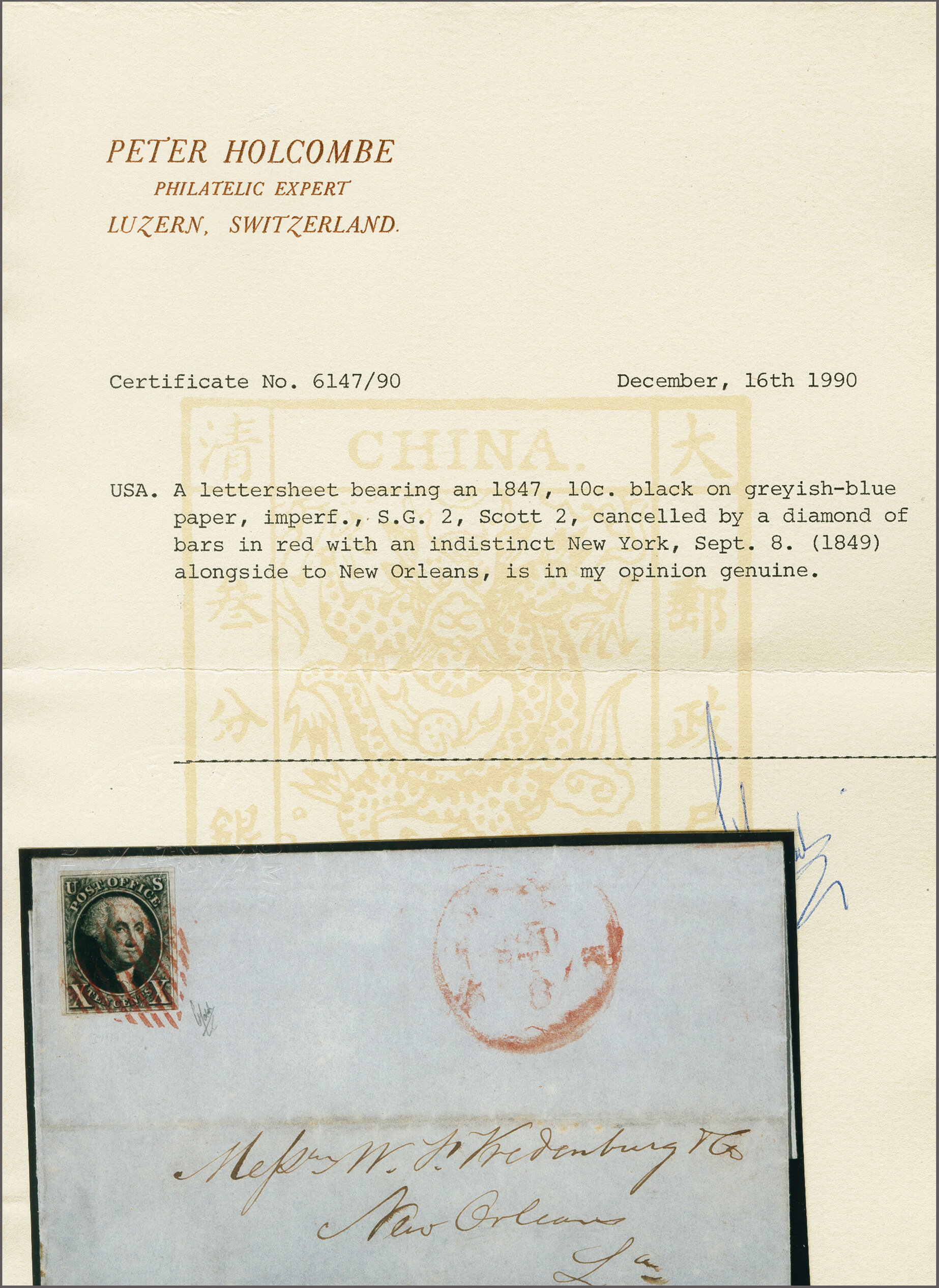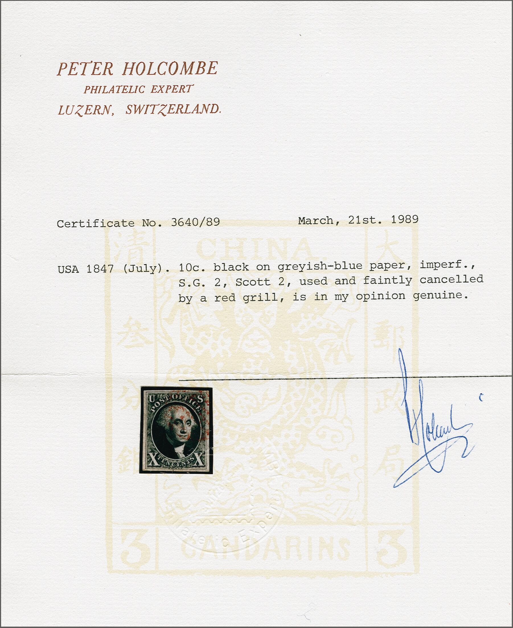 1847: Washington 10 c. black on blued, a used example with good even margins all round, very lightly cancelled in red. A fine stamp. Cert. Holcombe (1989) Scott = $ 850. (Image 1)