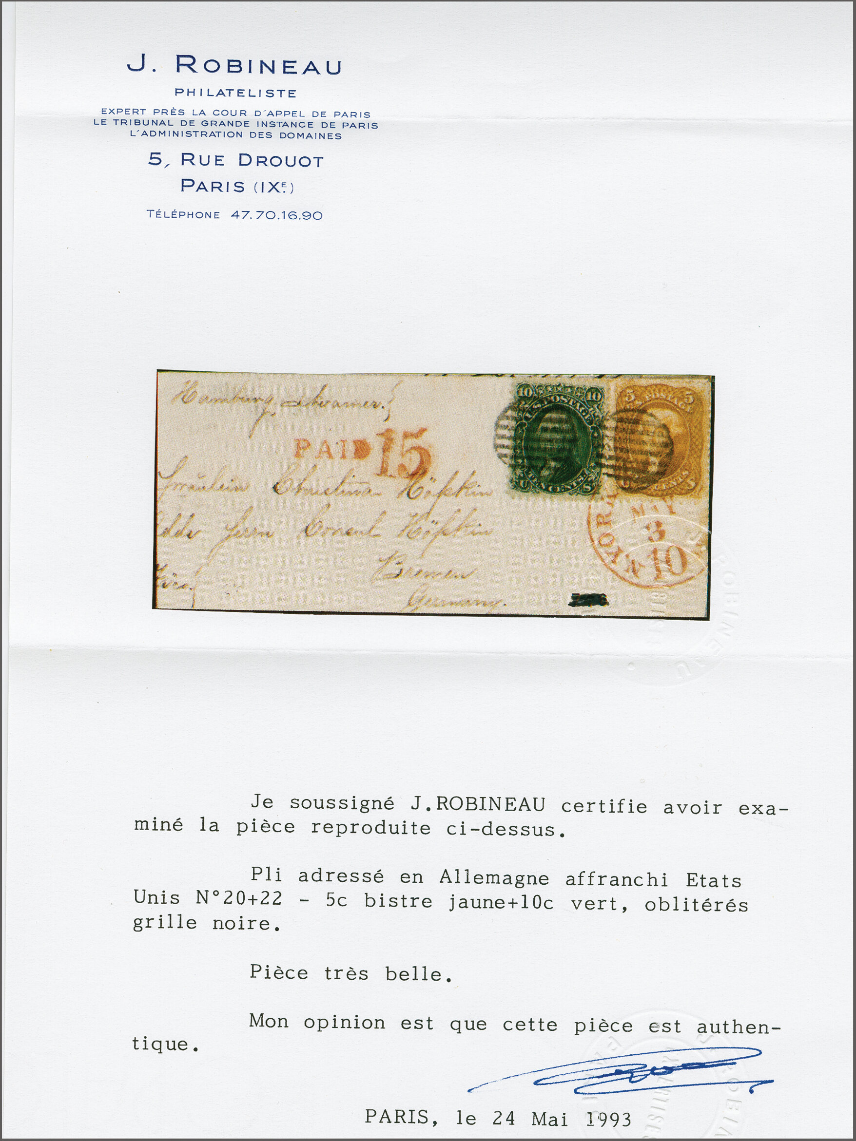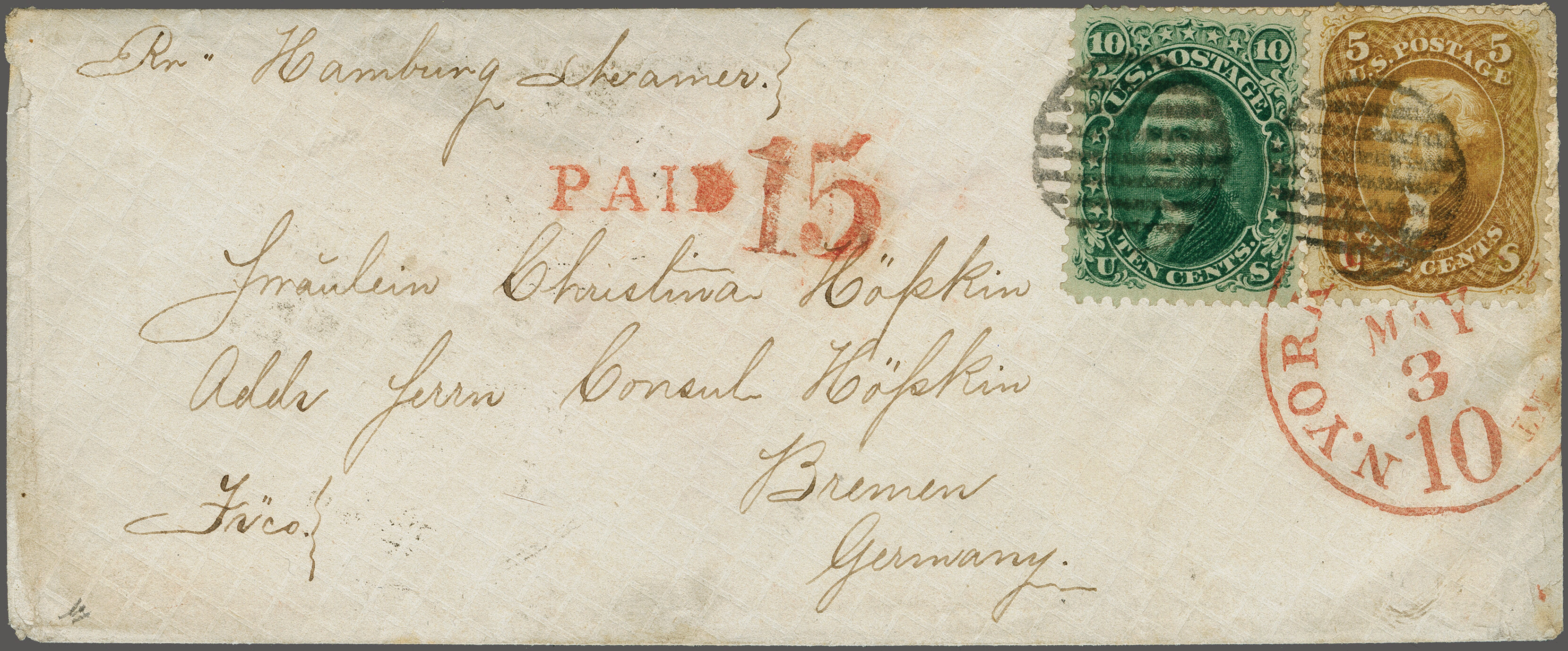 1861/62: 5 c. buff and 10 c. green used on 1862 cover endorsed "Per Hamburg Steamer" to Bremen, each tied by circular grid handstamps in black and by "N. YORK / 10" credit cds in red (May 3) with straight line "PAID" and "15"