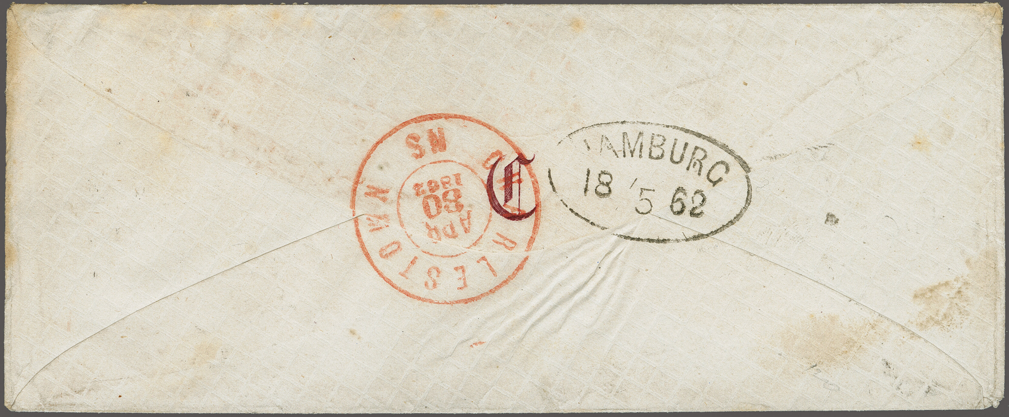 in red at left. Carried on HAPAG Line steamer "Teutonia" via Southampton to Hamburg. Reverse with neat "CHARLESTOWN / NS" despatch cds in red (April 30) and Hamburg transit (May 18) in black. One or two blunted perfs. but a scarce and attractive