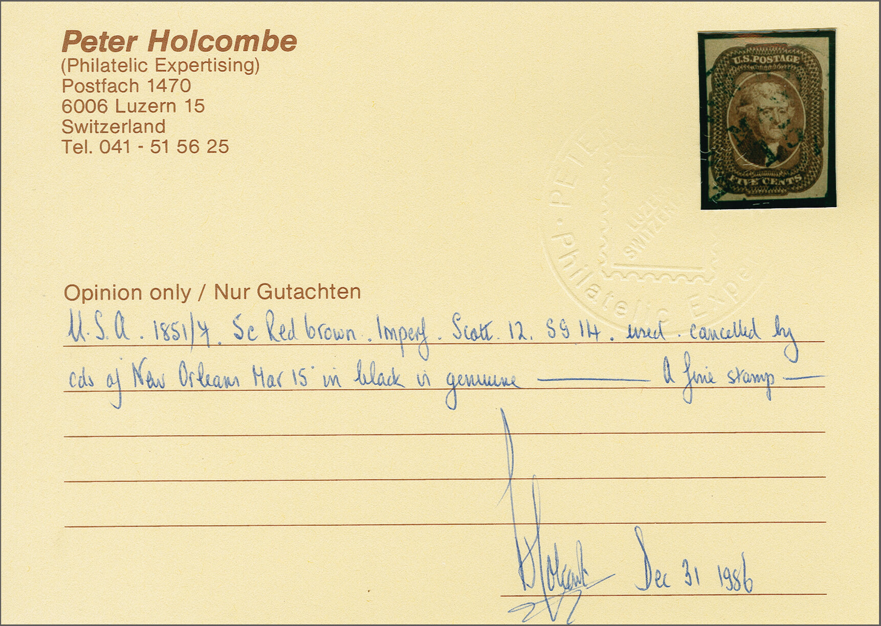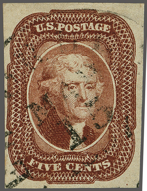 1856: Jefferson 5 c. red-brown, Type I, imperforate, a fine used example with good to large margin all round, very lightly cancelled in black. Scarce aand very fine. Signed Holcombe, Thier. Opinion Holcombe (1986) Scott = $