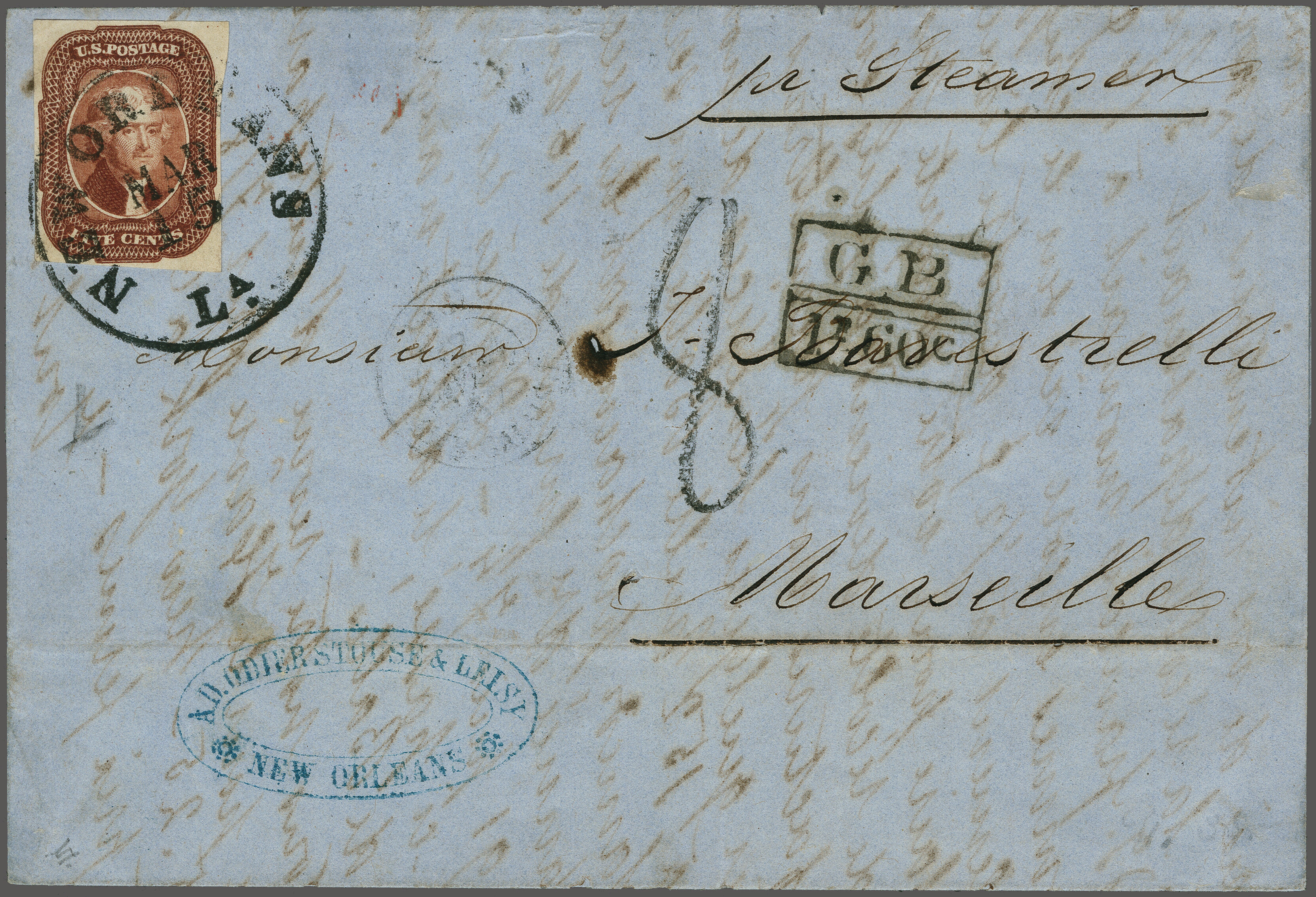 1856: Jefferson 5 c. red-brown, Type I, imperforate, a fine example with good margins all round, used on 1857 entire letter to Marseille endorsed "per Steamer" tied by "NEW ORLEANS / LA." circular datestamp (March 15) in