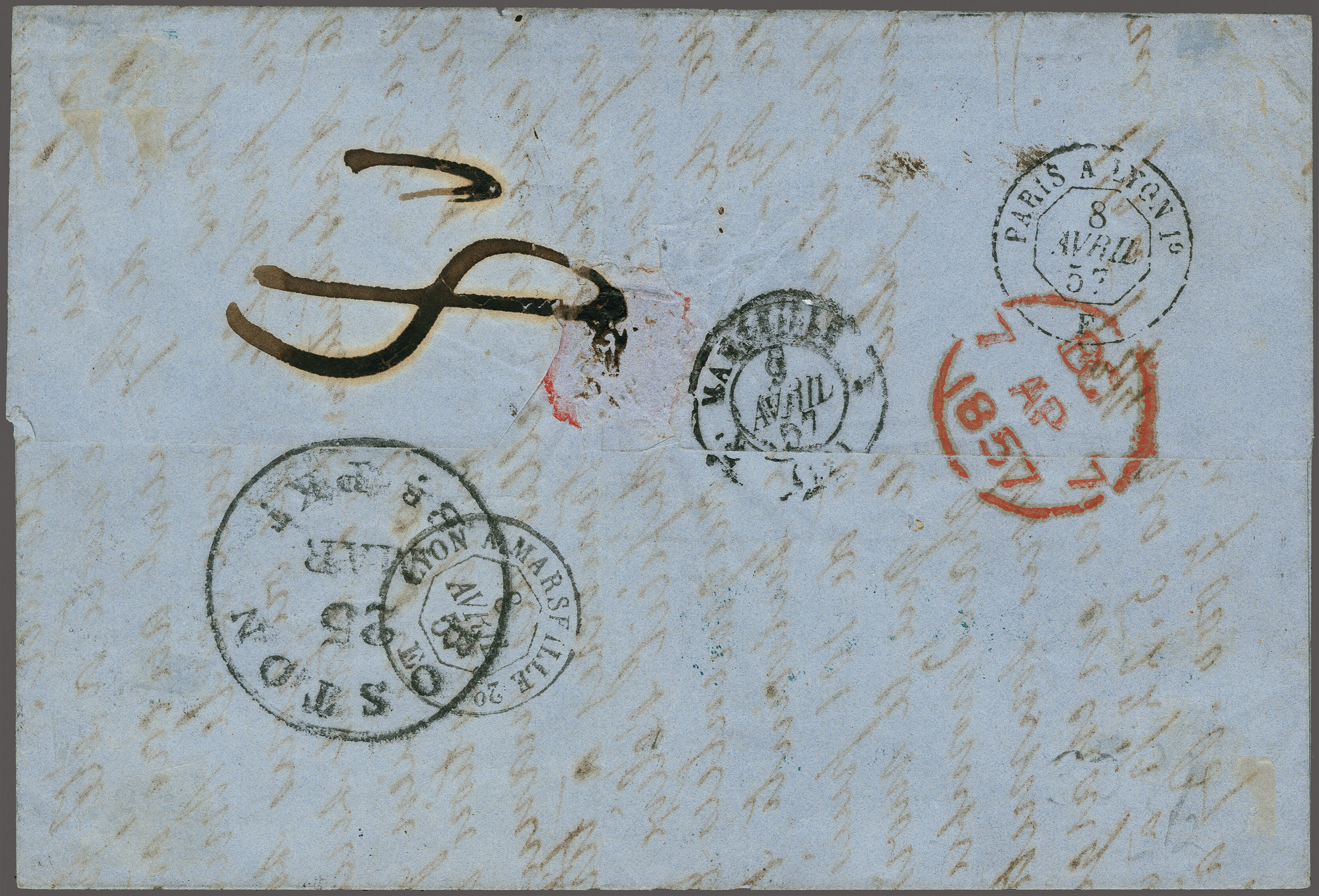 black. Carried on Cunard steamer "America" with reverse showing "BOSTON / BR. PKT." cds (March 25) in black, London transit cds (April 7) in red where framed "GB /F 60c." accountancy marking applied in black. Charged '8' décimes to collect upon
