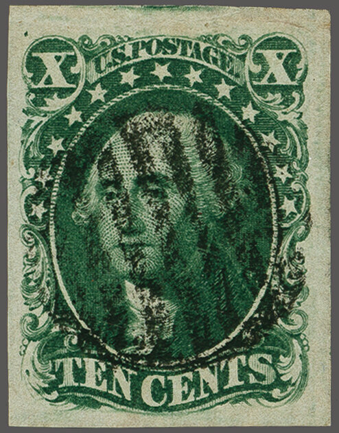 1855: Washington 10 c. green, Type II, imperforate, a fine used example with large margins all round and showing portion of adjoining stamp at top, lightly cancelled by circula black grid obliterator in black. Choice and very