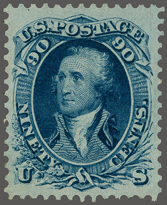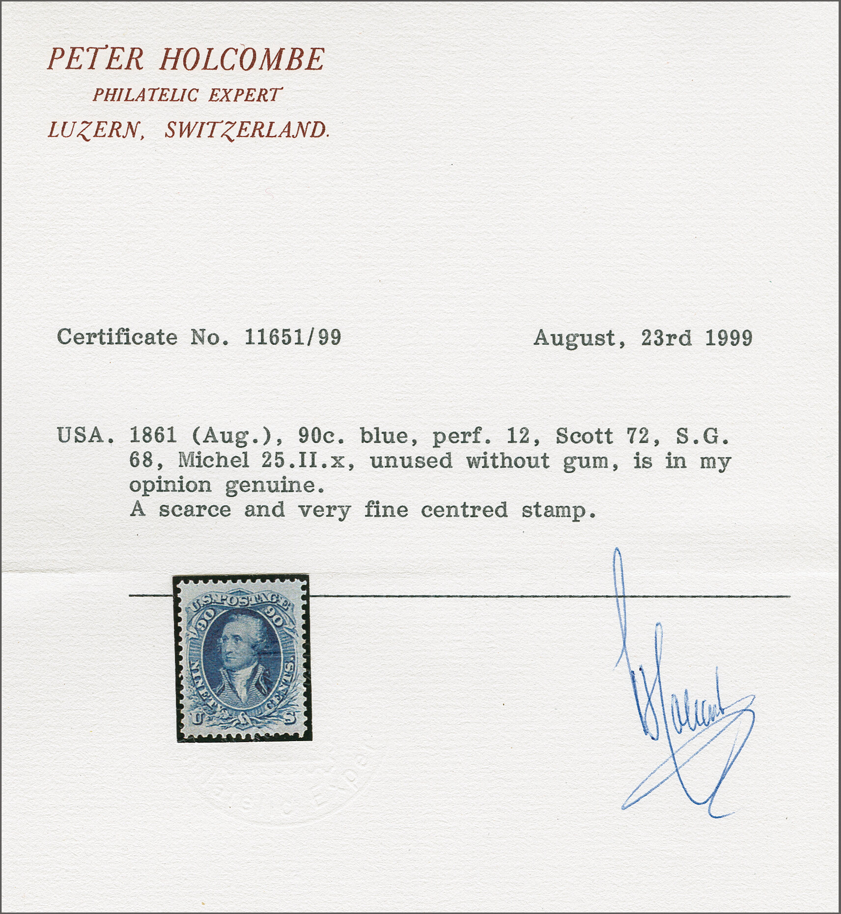 1861/62: Washington 90 c. blue, perf. 12, an unused example of fine centering and rich colour, fresh appearance, without gum. Cert. Holcombe (1999) Scott = $ 1'300. (Image 1)