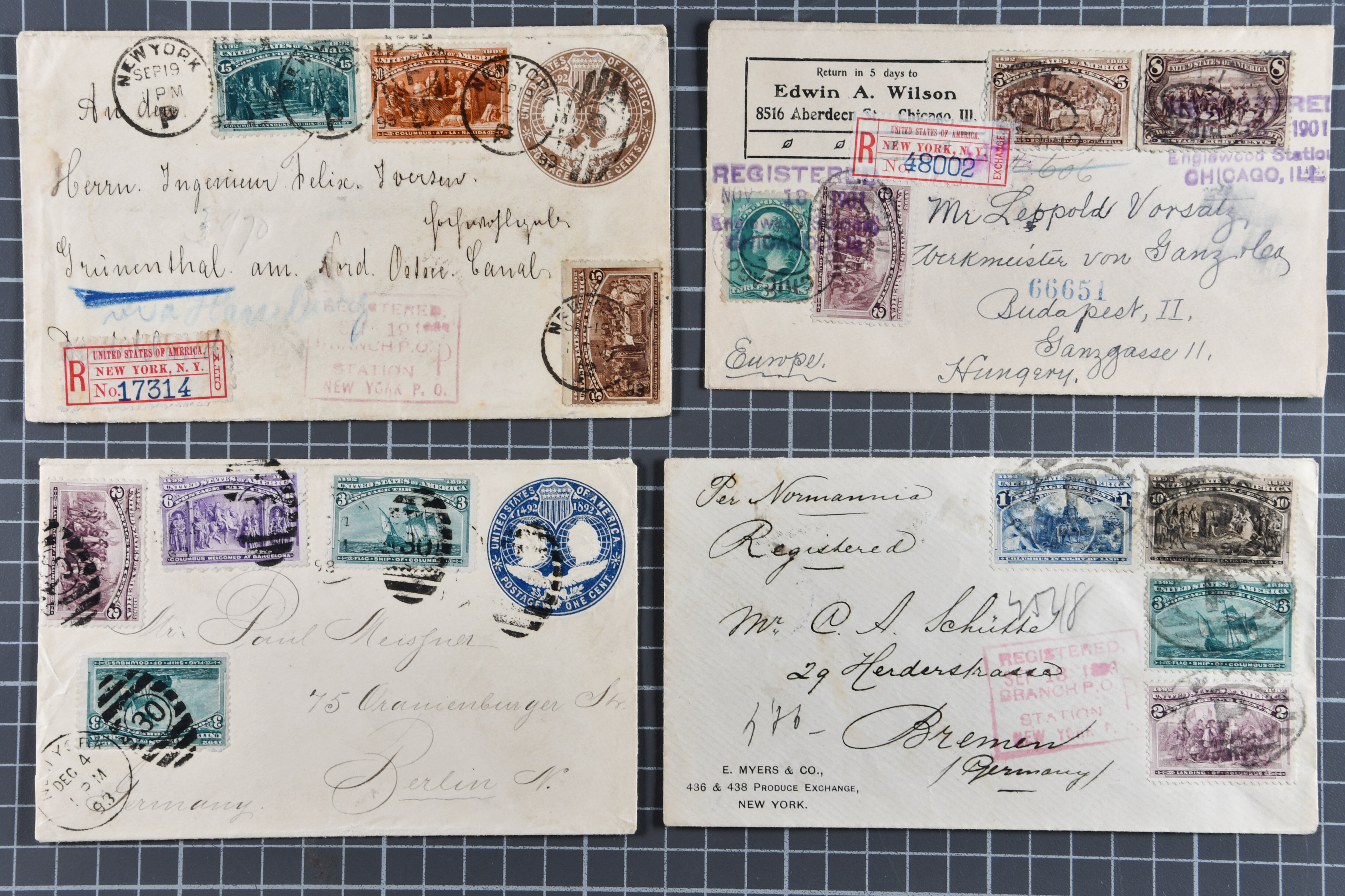 stationery envelope with Columbus 5 c., 15 c. and 30 c. sent registered to Germany and 1901 registered cover to Budapest with Banknote 3 c., Columbus 2 c. and 5 c. and Trans-Mississippi 8 c. A fine group - a scarce issue on cover. (Image 1)