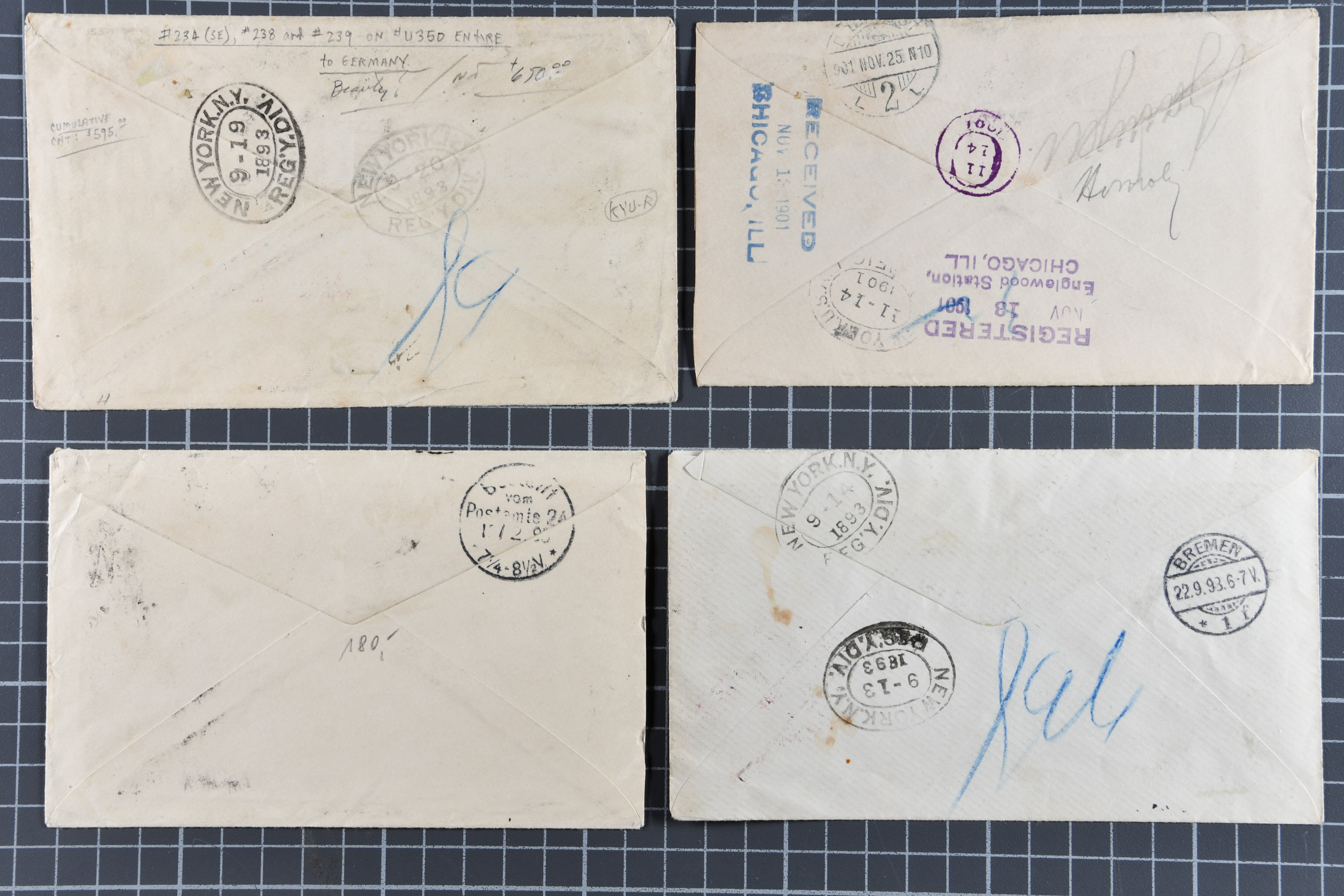 1893: Columbus Issue covers (4), with 1893 registered cover to Bremen, Germany bearing 1 c., 2 c., 3 c. and 10 c.; 1893 1 c. blue stationery envelope with Columbus 2 c., 3 c. (2) and 6 c. to Berlin; 1893 5 c.